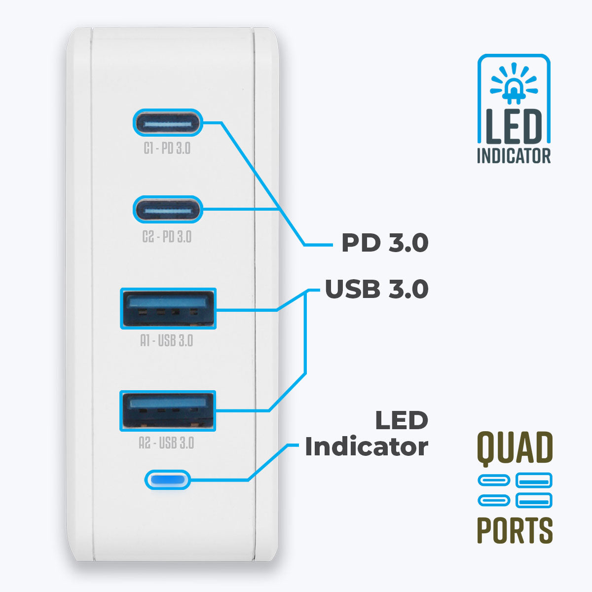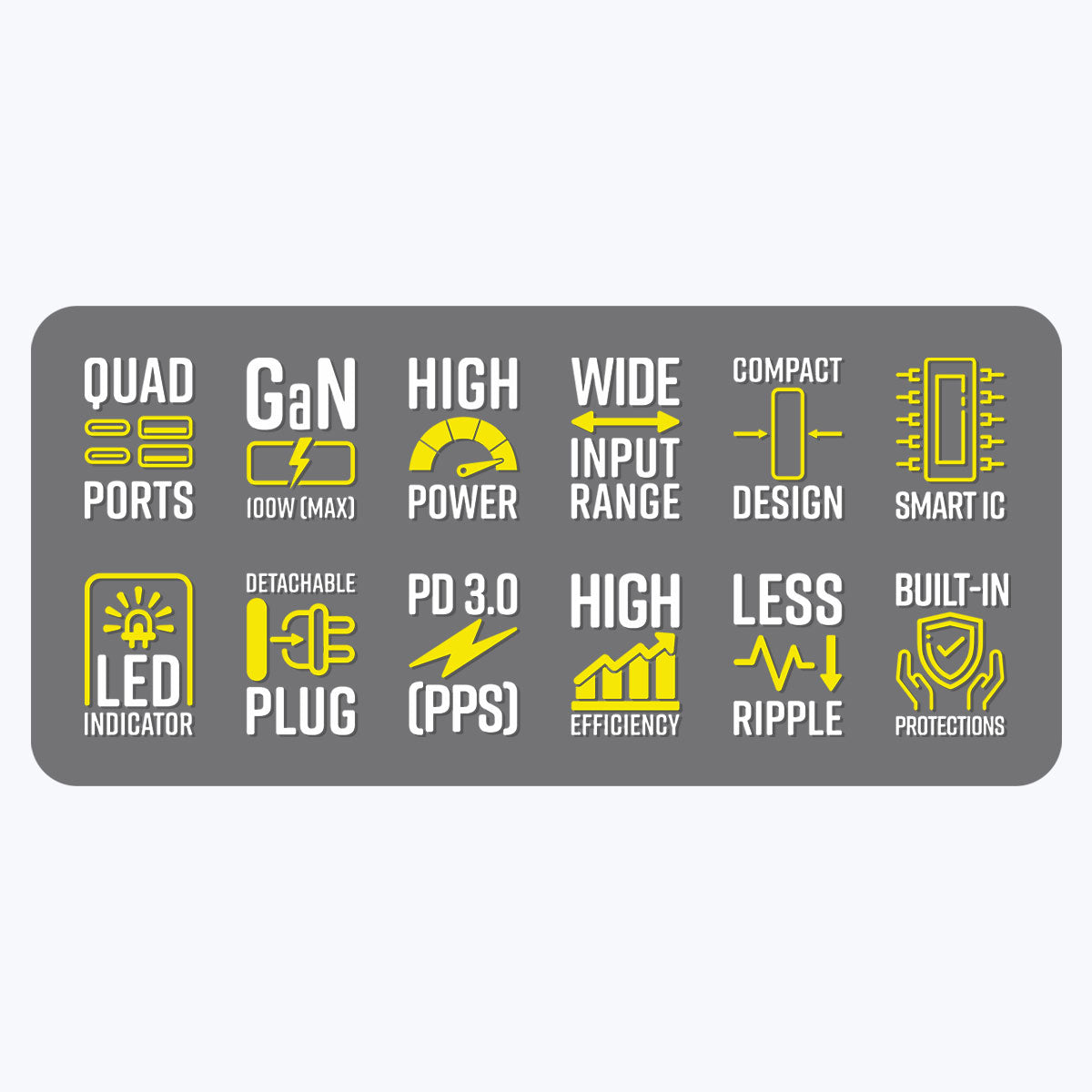 | Max Output | PD 3.0 - C1 / C2 : 5V 3A , 9V 3A , 12V 3A , 15V 3A , 20V 5A 100W Max.USB 3.0 - A1 / A2 : 5V/3A, 9V/3A, 12V/2.5A, 20V/1.5A 30W Max. | |