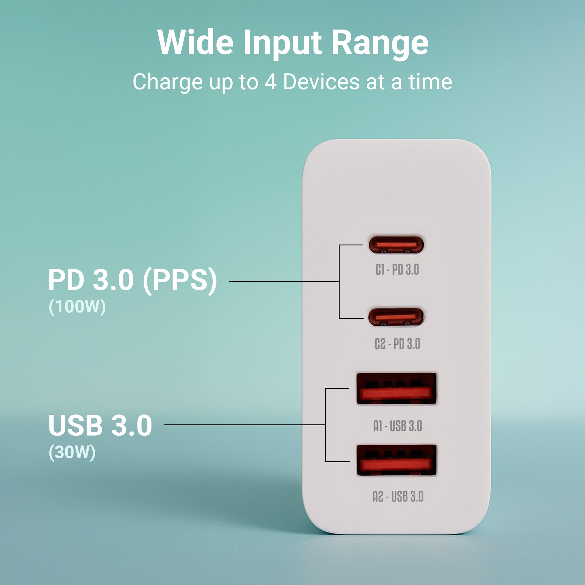 PD 3.0 C1 & C2 - 5V 3A, 9V 3A, 12V 3A, 15V 3A, 20V 5A (100W)USB 3.0 A1 & A2 - 5V 3A, 9V 3A, 12V 2.5A, 20V 1.5A (30W) |