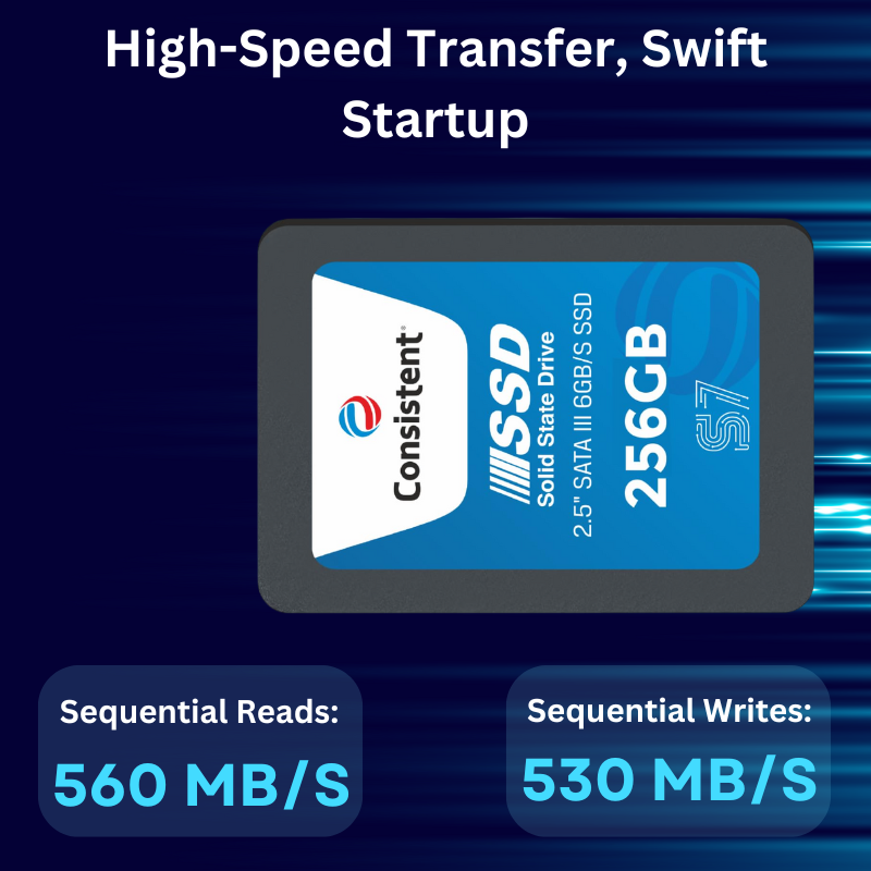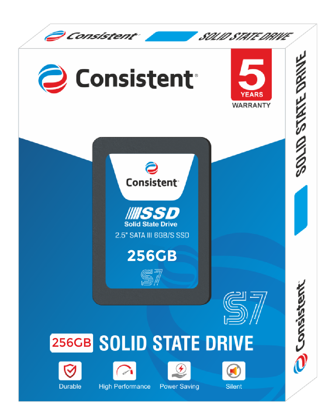 Consistent 2.5" 256GB SSD with SATA III Interface, 6Gb/s Read/Write Speed Upto - 552/500 MB/s, 5 Years Warranty SSD write cache is enabled Low power consumption, Laptop and Desktop 2.5Inch,/SATA 6 Gb/s interface, ATA modes supported Sequential 128KB Read and Write speeds up to 540MB/s and 500MB/s respectively Boot up faster. Load files quicker. Improve overall system responsiveness 5 year Replacement warranty