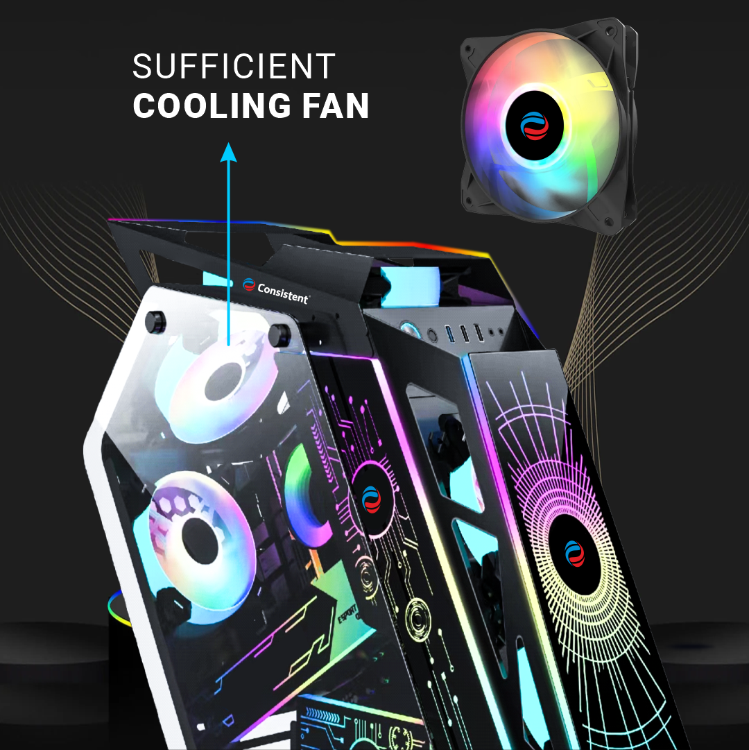 Motherboard Support M-ATX/ITX Black coating and premium tempered glass panel on both side for showcasing internal components Fan Support - 2 on front panel, 2 on top panel & 2 on back panel 6 ARGB Fans USB 2.0*2, 3.0*1