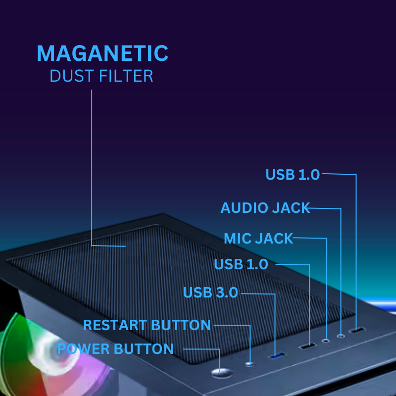 Motherboard Support: Micro & Mini ATX Motherboard RGB Fan - front 120mm fans (3 fans pre-installed) or optional 140mm fans, complemented by two additional 120mm fans at the top and a single rear 120mm fan. This cabinet also supports water cooling configurations, making it a great choice for intense gaming