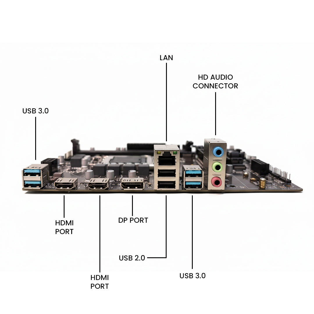 CPU Supports 10th & 11th Gen SERIES CPU Chipset Intel H470 Express Chipset Memory Supports Dual channel DDR4 Ram(2133/2400/2666/3200) Upto 64 GB I/O Interface 2x USB 2.0 4x USB 3.0 2x HDMI port 1x DP port 1x RJ45 port 1x 3-in-1 Audio port Onboard interface 1x 24-pin ATX power connector 1x 8-pin ATX 12v power connector 1x USB 3.0 connector 1x USB 2.0 connector 1x F_AUDIO connector 1x SPEAKER connector 2x FAN connector 1x LPC_DEBUG connector Integrated Sound 6- Channel HD Audio Codec onboard Storage 3x SATA3.0(6GB/s)ports Integrated LAN 100/1000 Mbps LAN onboard Expansion slot 1x PCI Express x 1 slot 1x PCI Express x 16 slot 1x NVME-M.2 slot 1x SATA M.2 slot 1x WIFI connector Dimension Micro-ATX architecture (16.8*21.5cm)