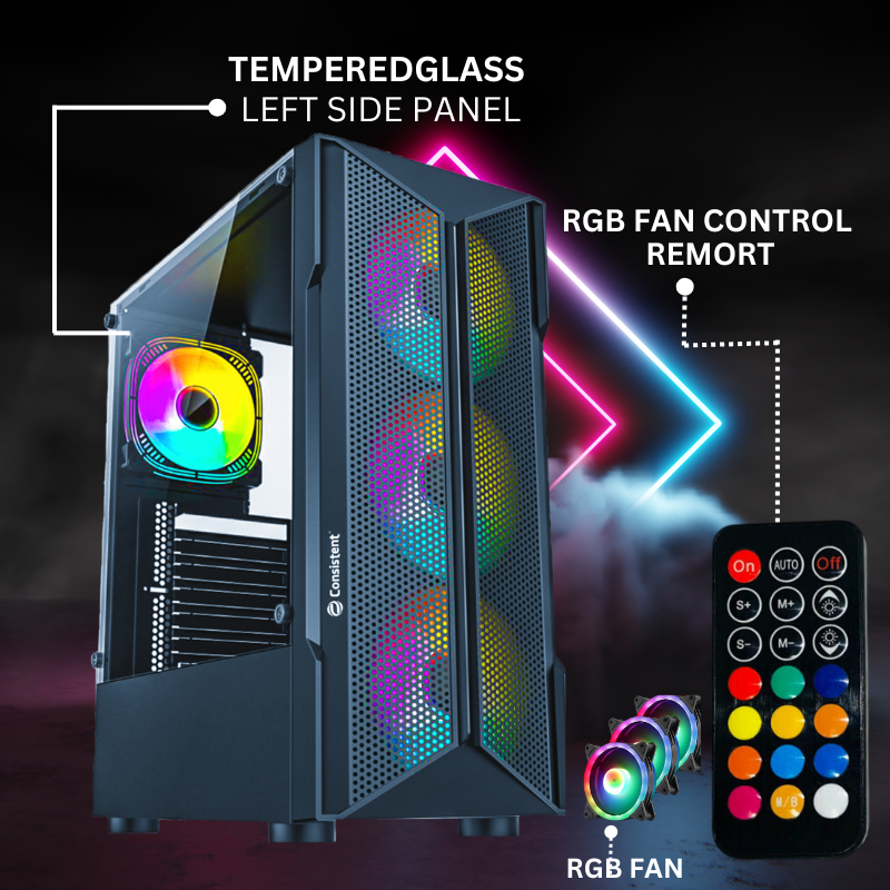 Motherboard Support: Micro & Mini ATX Motherboard RGB FAN:Front 3*12cm, Back 1*12cm, 4RGB Fan with Controller Black Body Case, Black Inside and Glass left side panel Front mesh panel