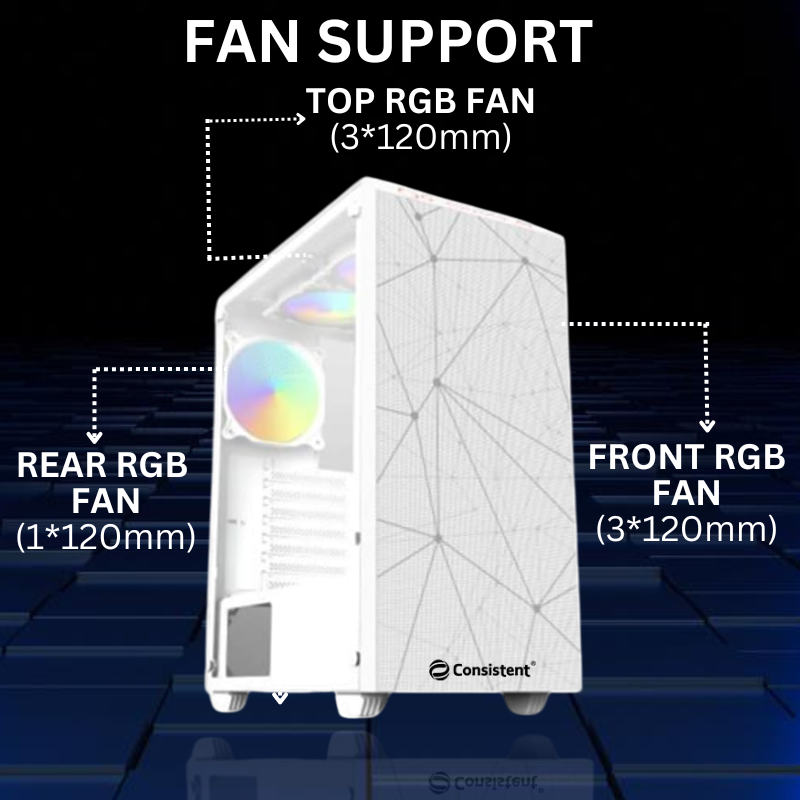 Motherboard Support: 26A Structure: M-ATX/ITX RGB FAN:3pcs Led 12cm fixed color fan on front panel FAN Option : Front 3*120/140mm,Rear:1*120mm,Top:3*120/2*140mm White Body Case, White inside and glass left side panel, SPCC,PSU Carton Size:493*254*428mm