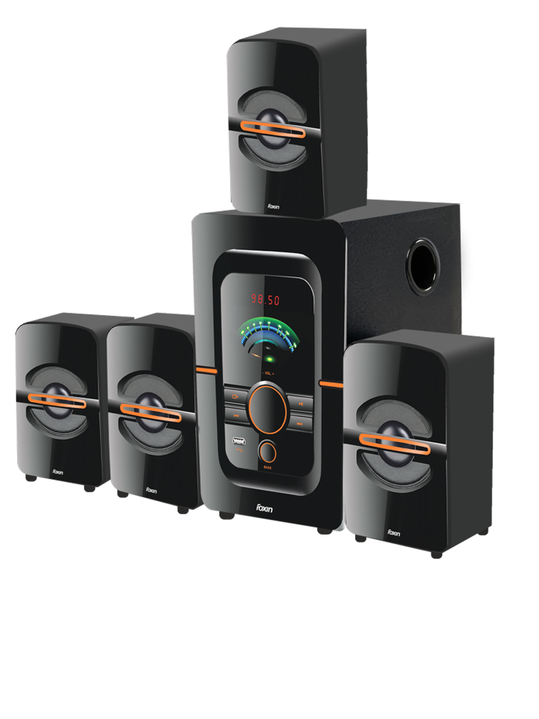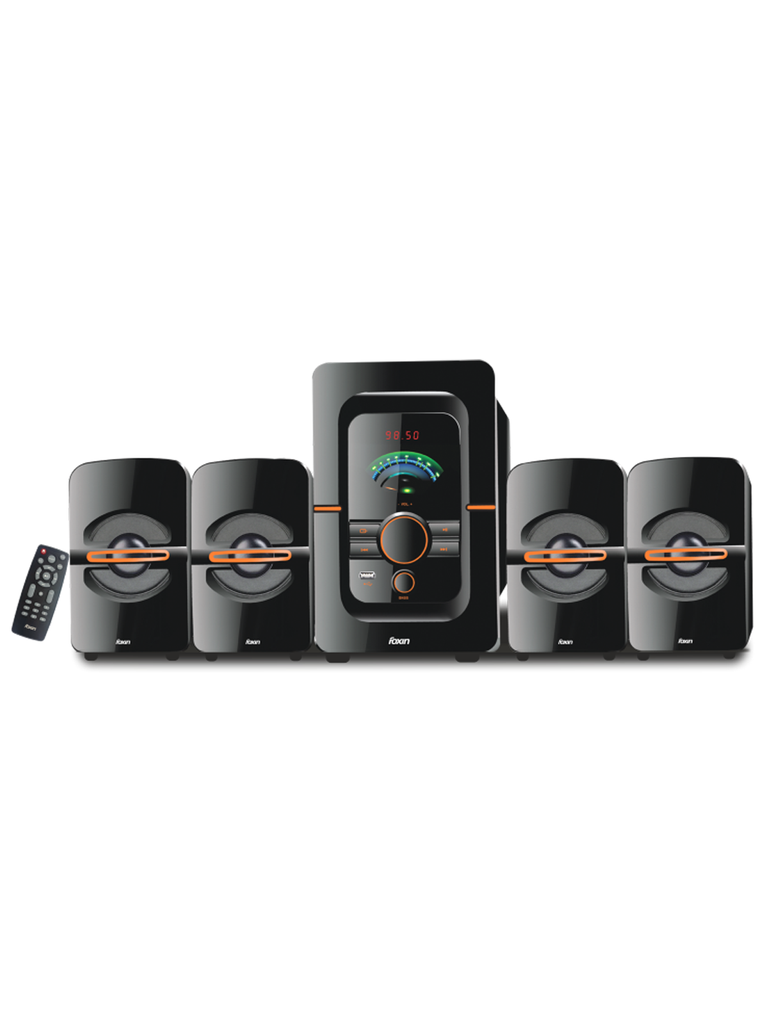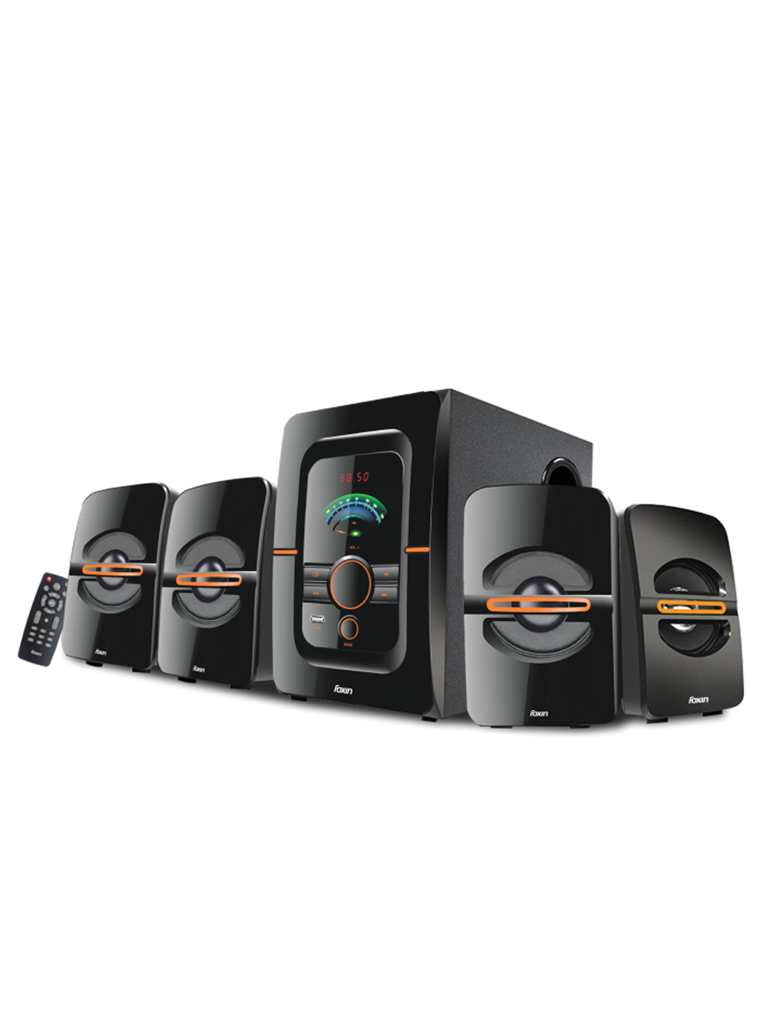 5.25” Subwoofer 85W X 4.1CH system Power (RMS) Compatible with Smartphone, laptop, desktop Wireless Remote Control 3.5mm audio output SD-Card Mp3 Music Playback FM with Powerful Bass Dual Connectivity via Bluetooth v4.2 and USB LED display with different modes 365 Days Warranty from Date of Purchase