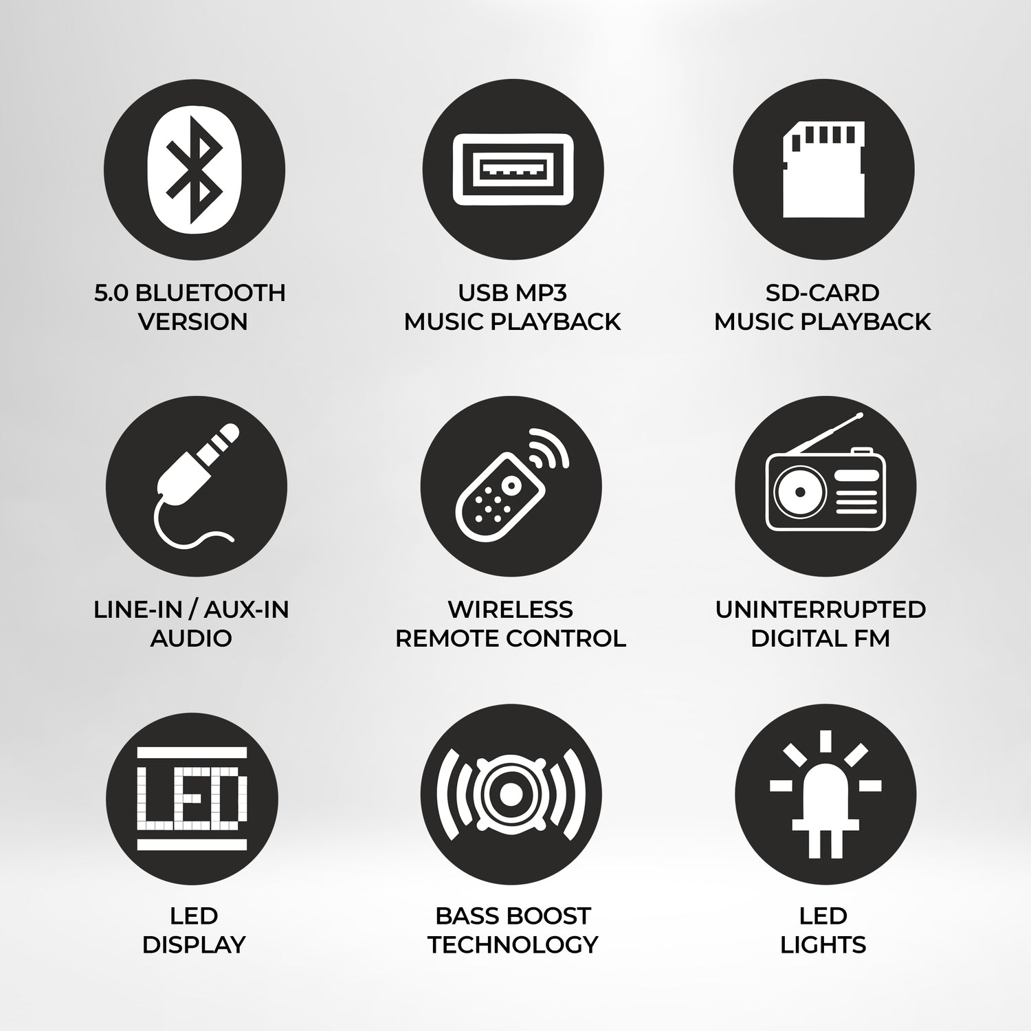 ▶️ 5” Subwoofer ▶️ 95W X 4.1CH system Power (RMS) ▶️ Compatible with Smartphone, laptop, desktop ▶️ Wireless Remote Control ▶️ 3.5mm audio output ▶️ SD-Card Mp3 Music Playback ▶️ FM with Powerful Bass ▶️ Dual Connectivity via Bluetooth and AUX ▶️ LED display with diffrent modes ▶️ RGB LED lightning ▶️ 365 Days Warranty from Date of Purchase