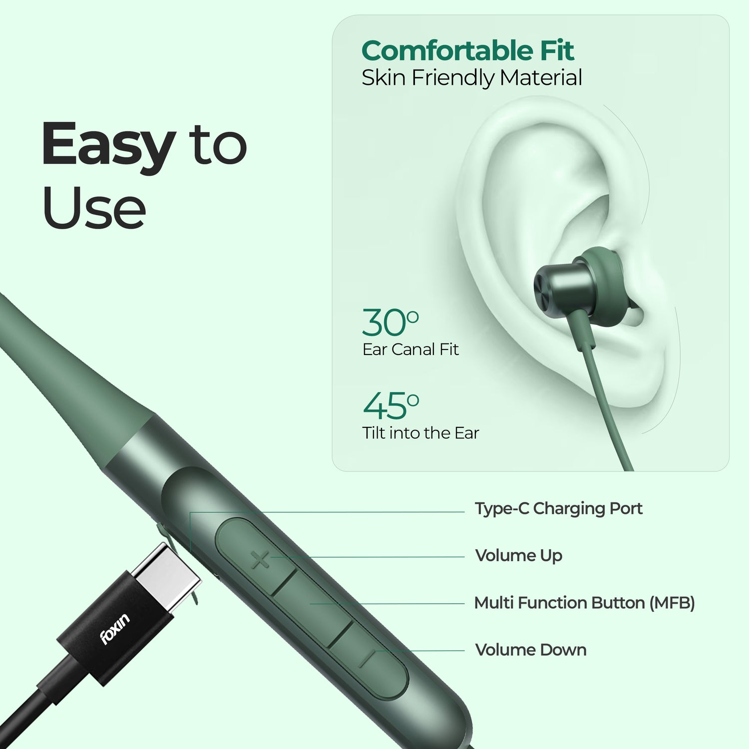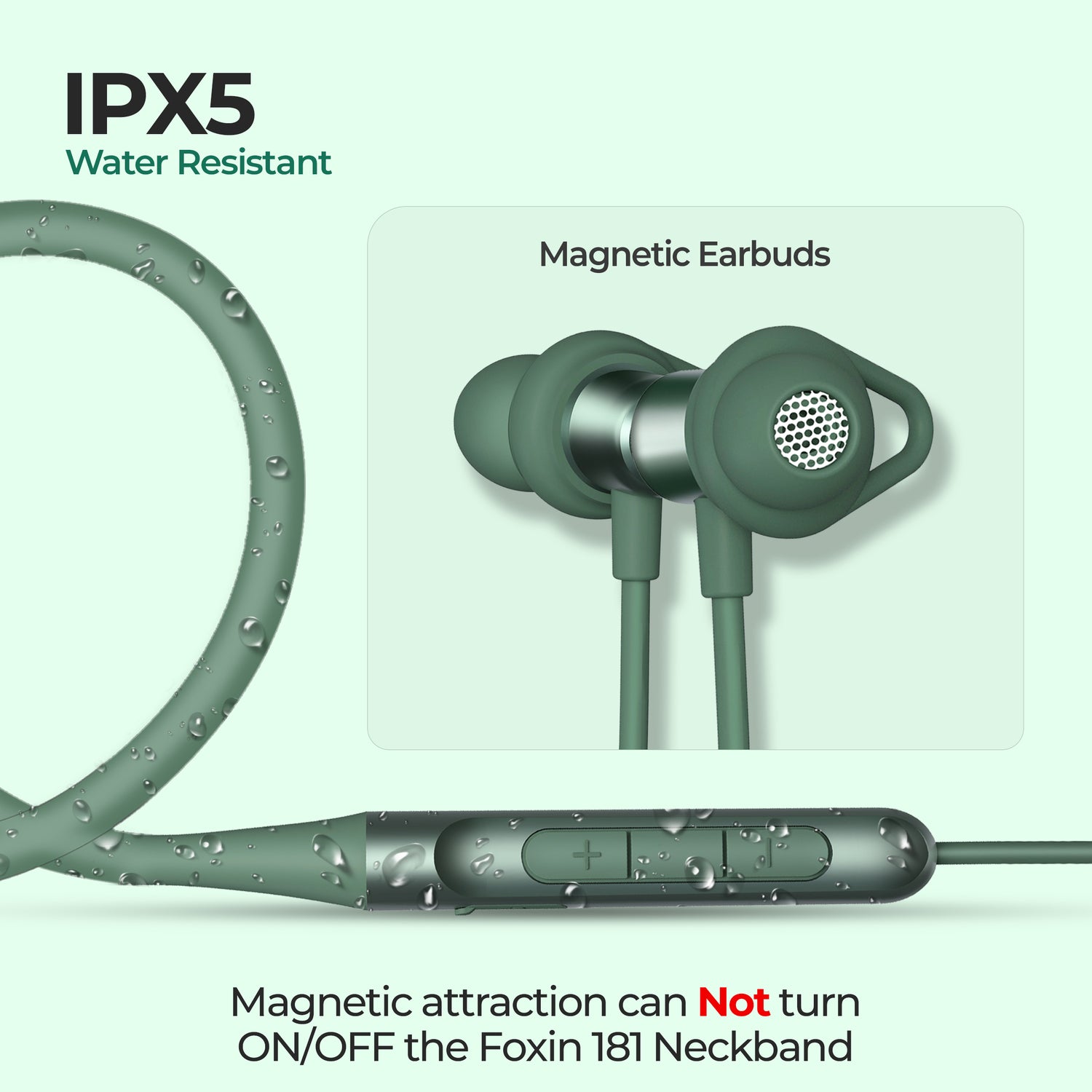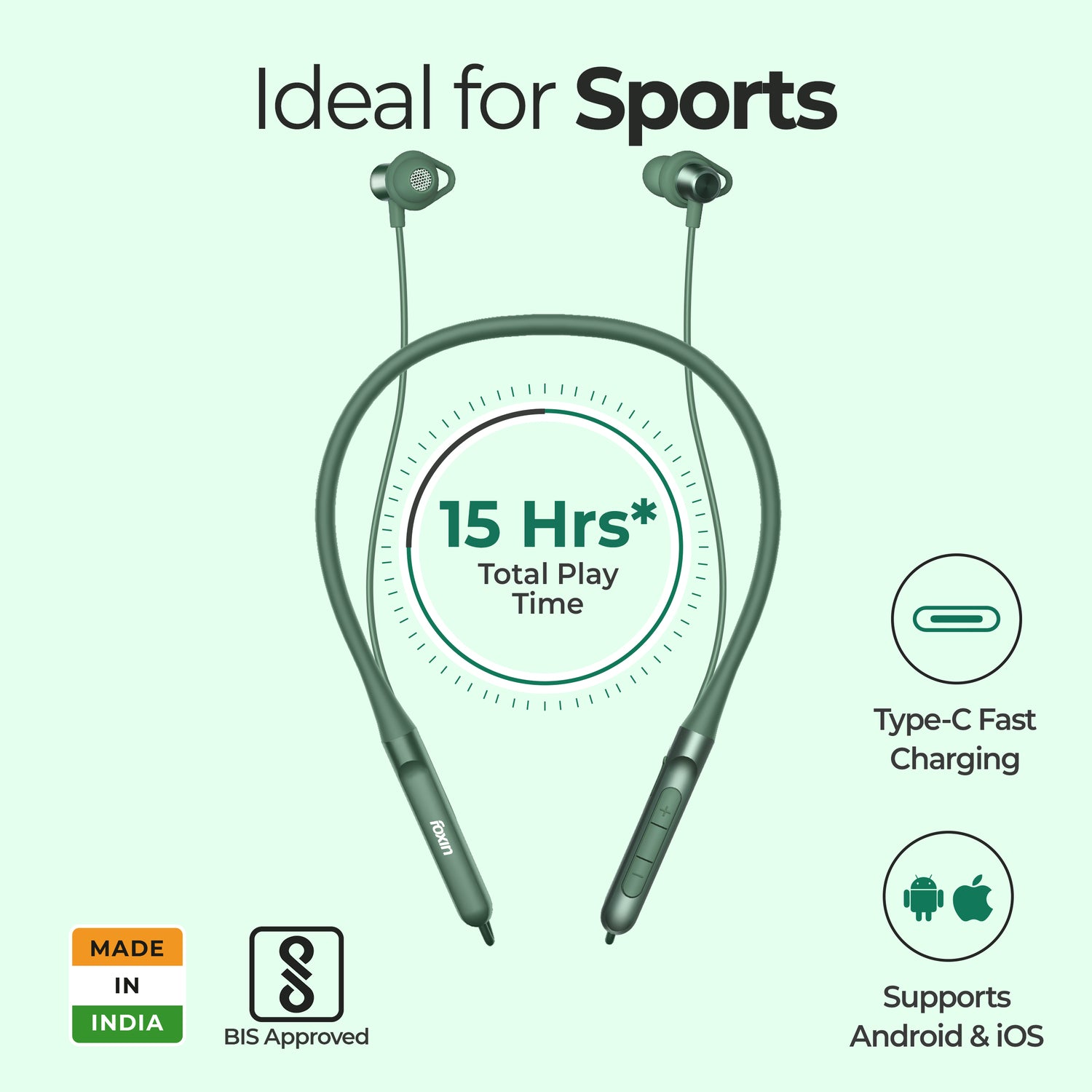 Foxin Foxbeat 181 Sports Neckband will be your ideal companion for daily workouts, jogging, gym sessions, and exercising. Made from premium silicone, it adapts and remembers the shape of your neck, ensuring a comfortable and secure fit during all activities. IPX5 Waterproof rating ensures durability against sweat and light rain, perfect for intense workouts. Type-C Rapid Charging provides 8 hours of juice in 10 minutes of charge, for quick and convenient recharging between sessions. 8mm Bass Boost Driver and HD Music Output deliver immersive sound quality for an energizing workout experience. BIS Certified and Proudly Made in India, backed by a 180-day warranty from the date of purchase for peace of mind.