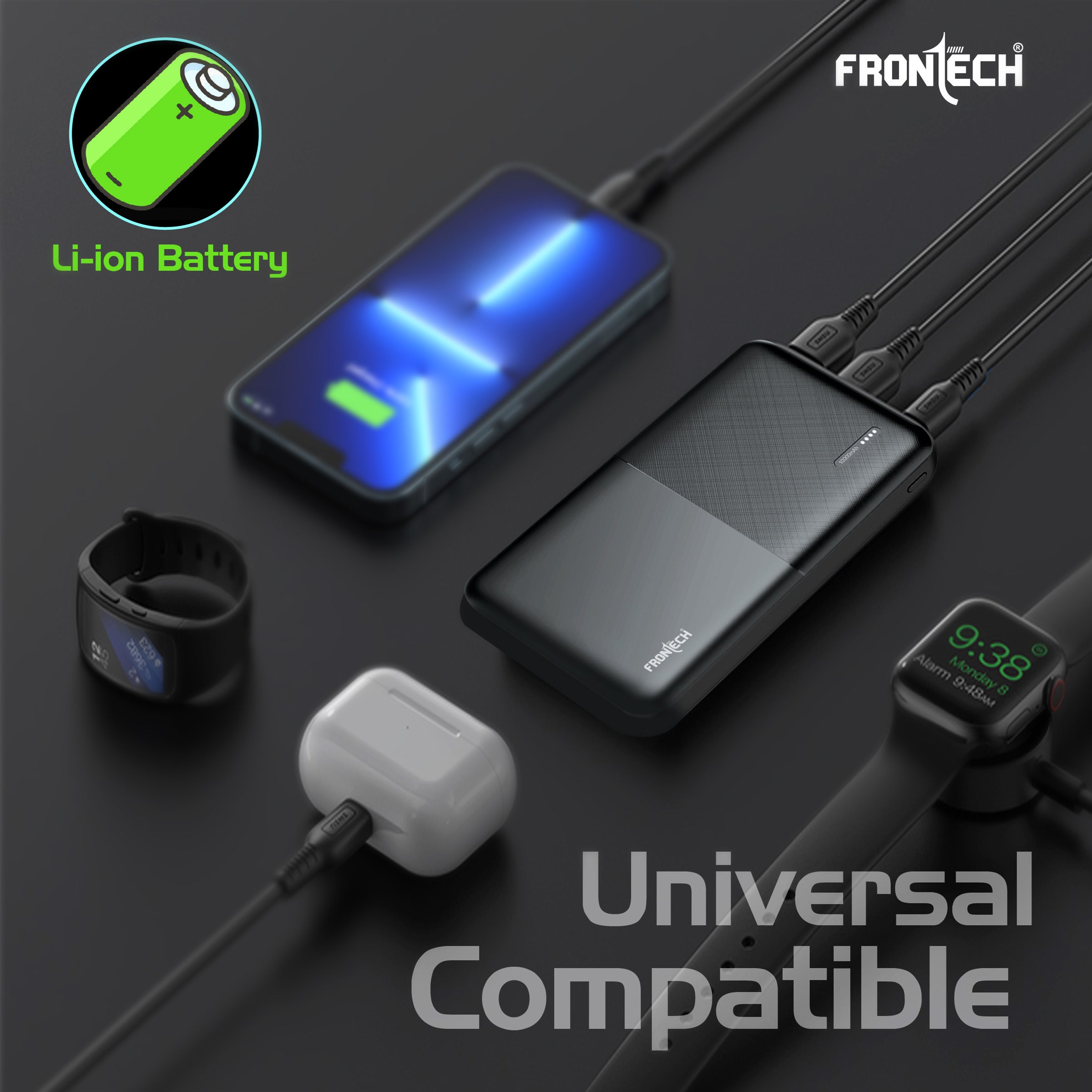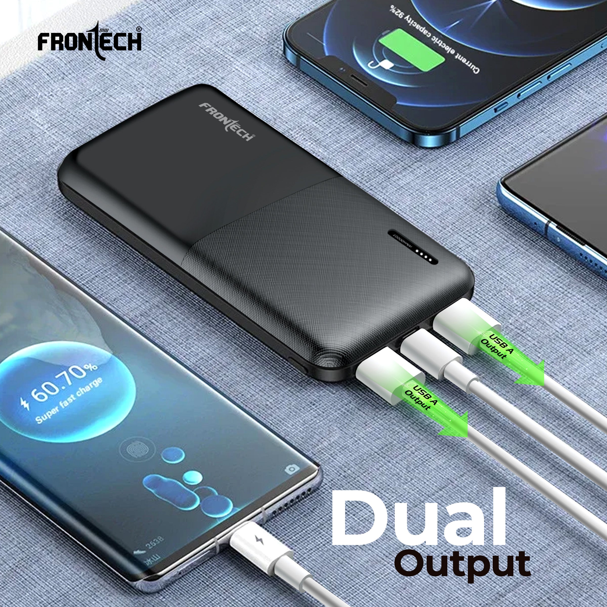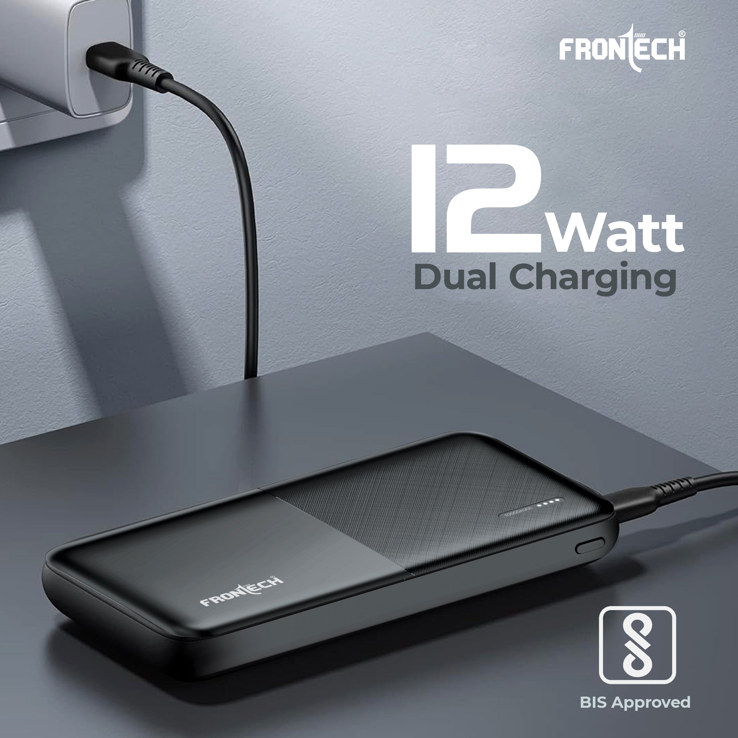 Stay charged and connected with the FRONTECH 10000 mAh Power Bank. Built with a robust 10000 mAh Li-ion battery, this sleek power bank keeps your devices ready while you’re on the go. It features dual output options, a clear digital battery indicator, and advanced safety features, ensuring reliable performance over time. The compact design and durable construction make it a dependable and efficient solution to keep your devices running.