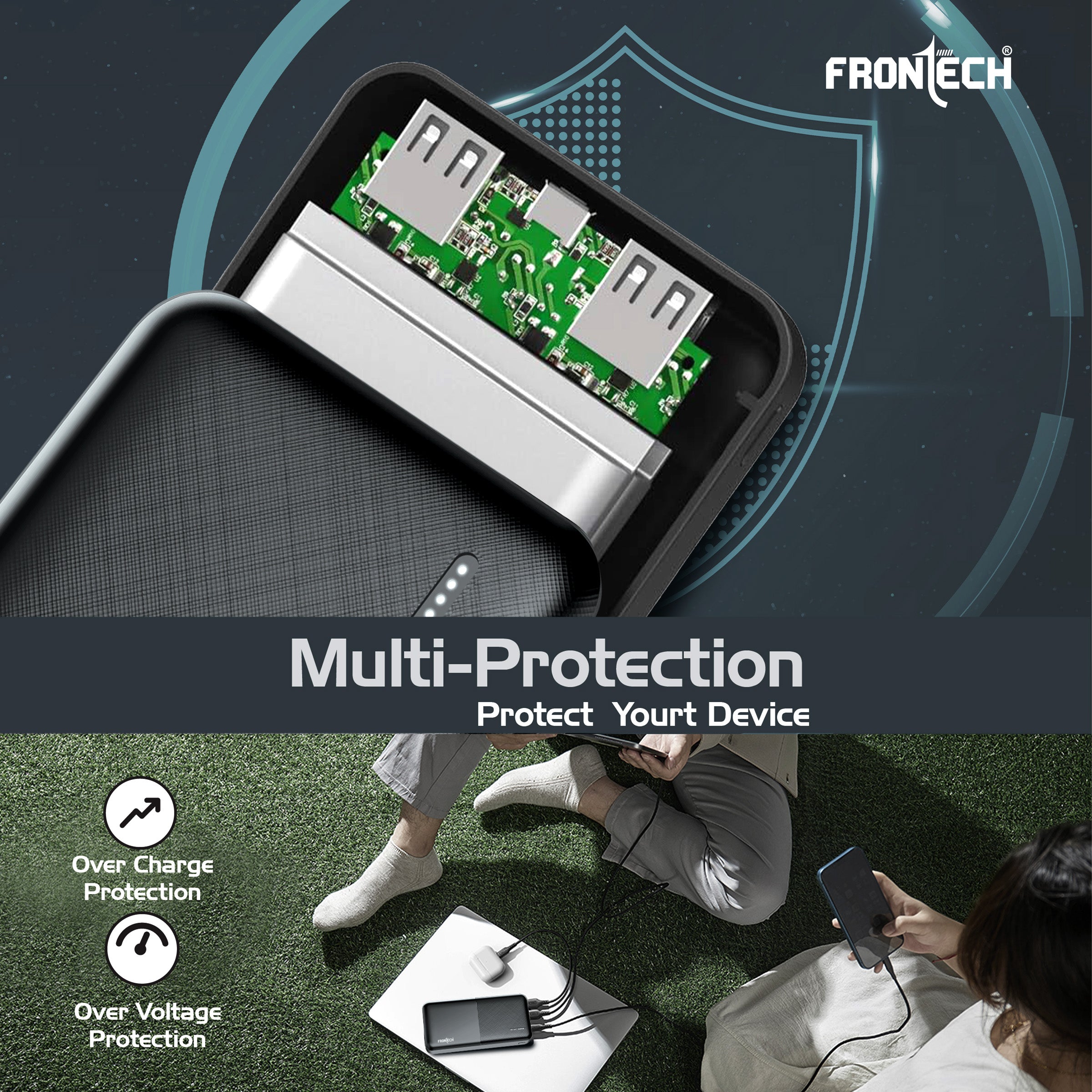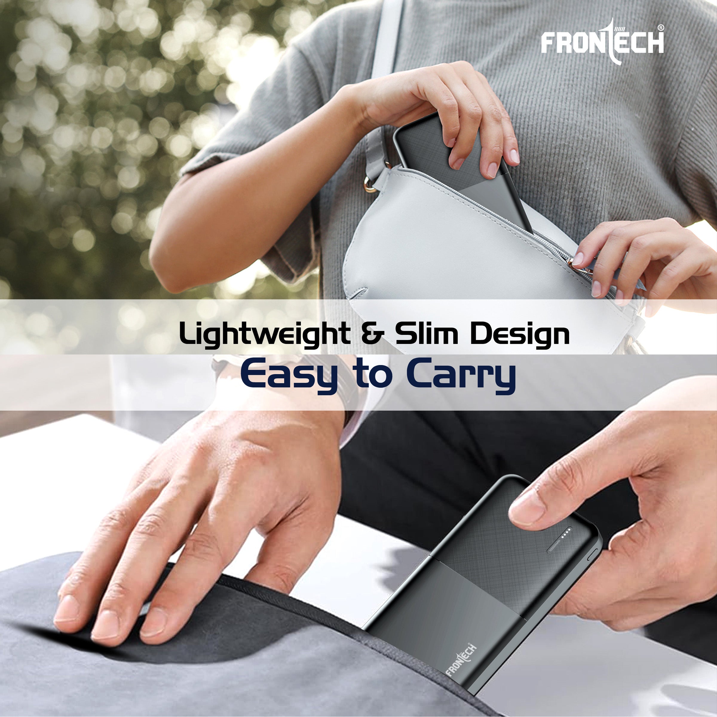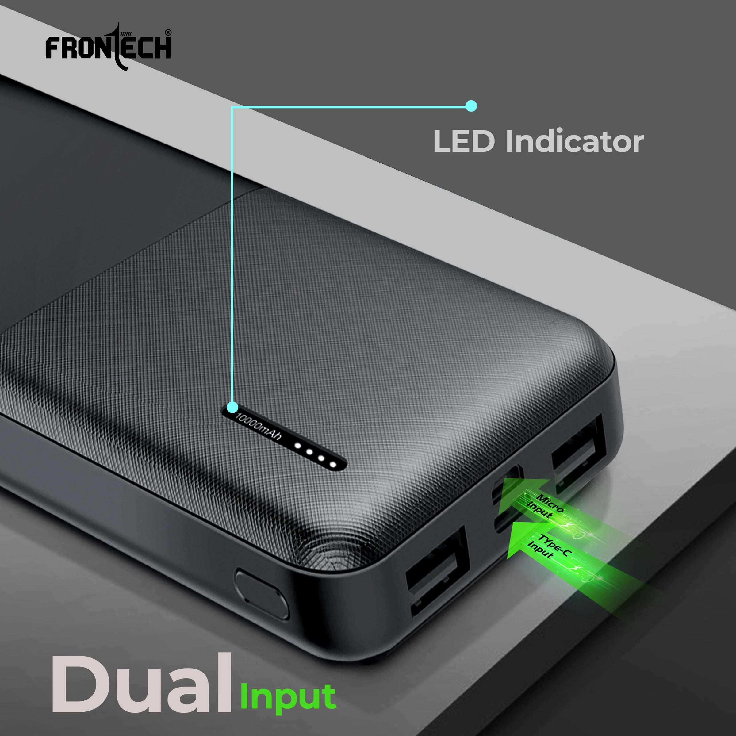 Stay charged and connected with the FRONTECH 10000 mAh Power Bank. Built with a robust 10000 mAh Li-ion battery, this sleek power bank keeps your devices ready while you’re on the go. It features dual output options, a clear digital battery indicator, and advanced safety features, ensuring reliable performance over time. The compact design and durable construction make it a dependable and efficient solution to keep your devices running.