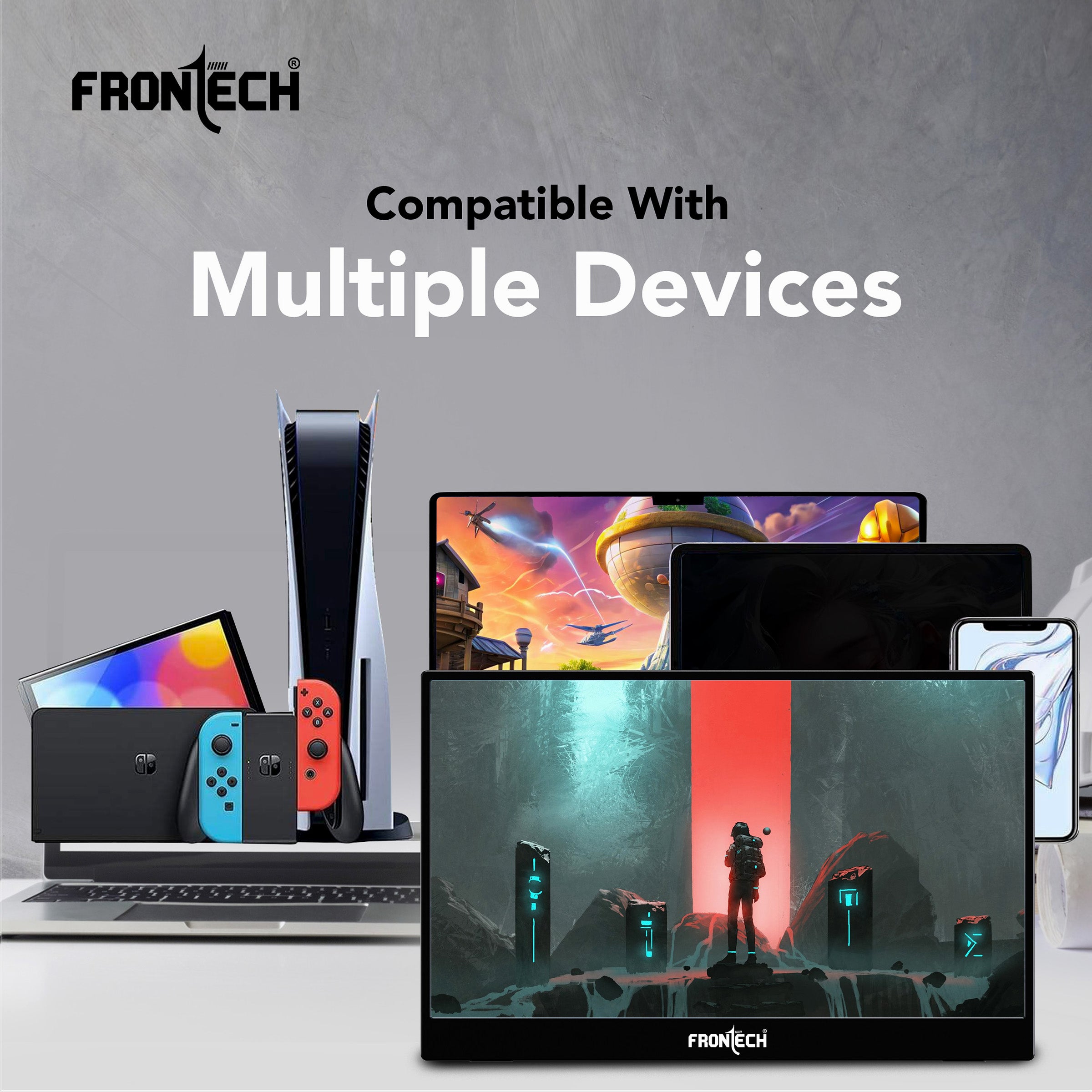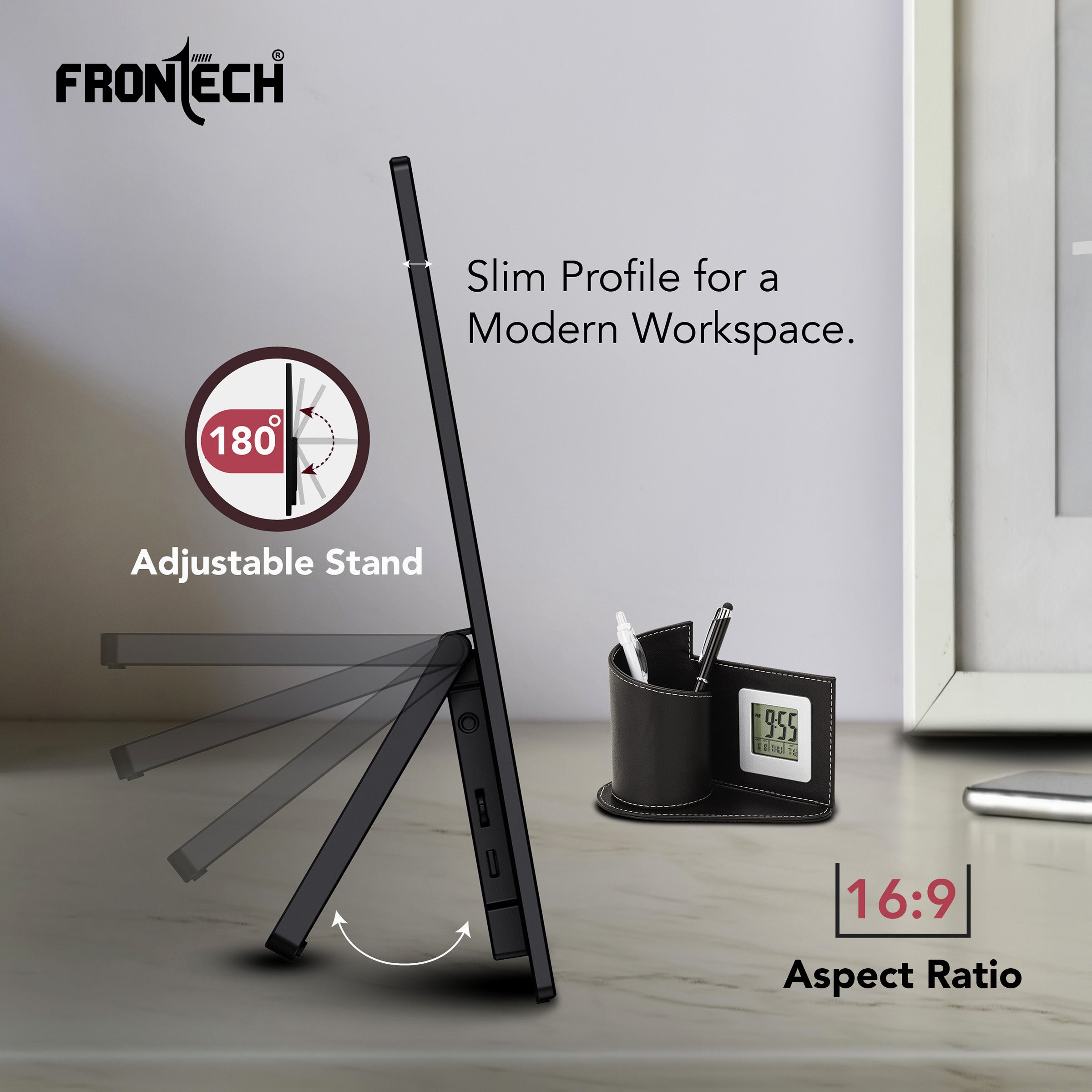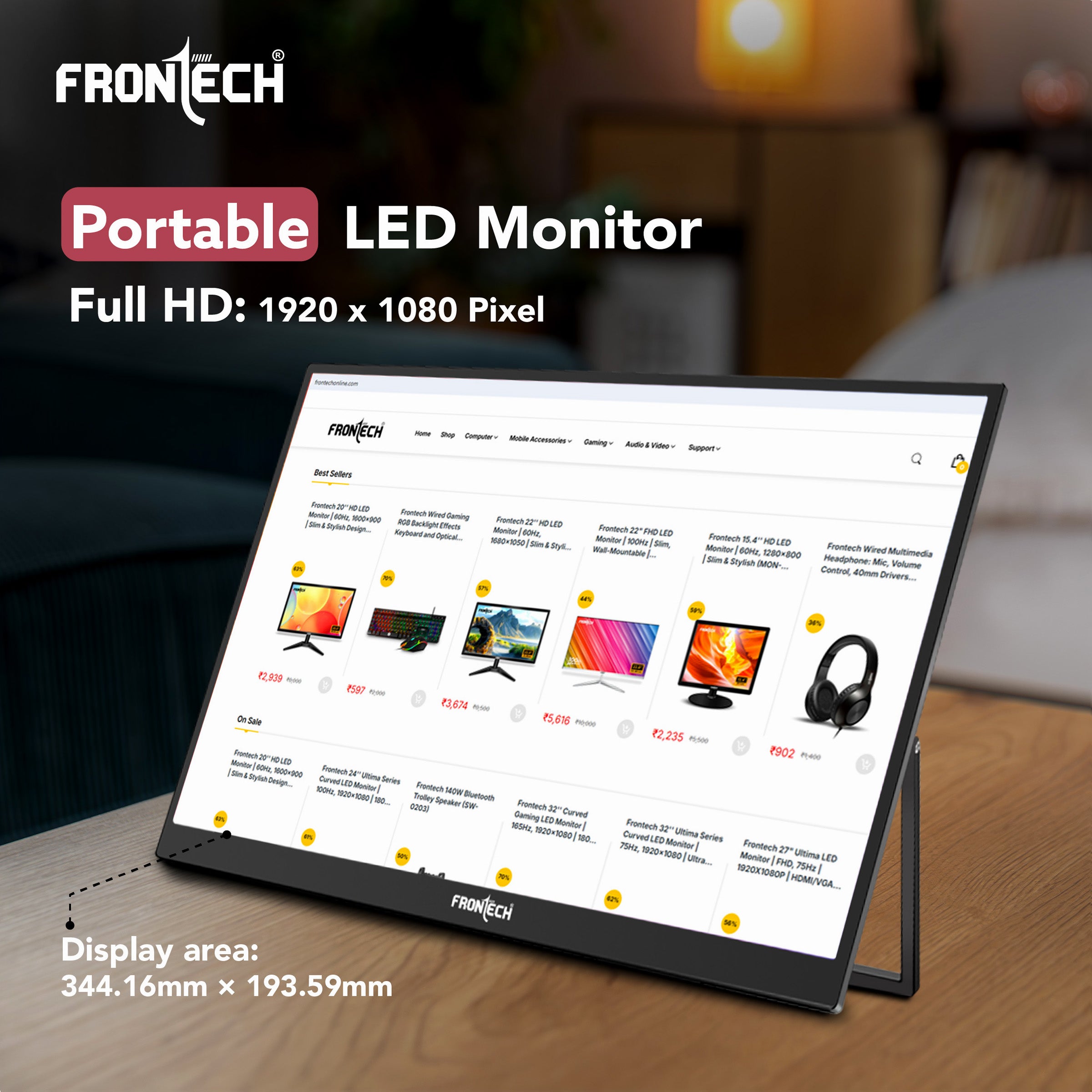 Experience sharp visuals anywhere with the Frontech 15.6″ Portable LED Monitor. Featuring a Full HD IPS display, built-in stereo speakers, and a 10000mAh rechargeable battery, it delivers vibrant images and immersive sound on the go. Dual input support via USB-C and Mini HDMI makes it easy to connect laptops, gaming consoles, and smartphones. The adjustable stand tilts up to 180° for comfortable viewing, while HDR and FreeSync enhance gaming and multimedia experiences. Slim and lightweight, it’s perfect for travel, work, or entertainment anytime, anywhere.