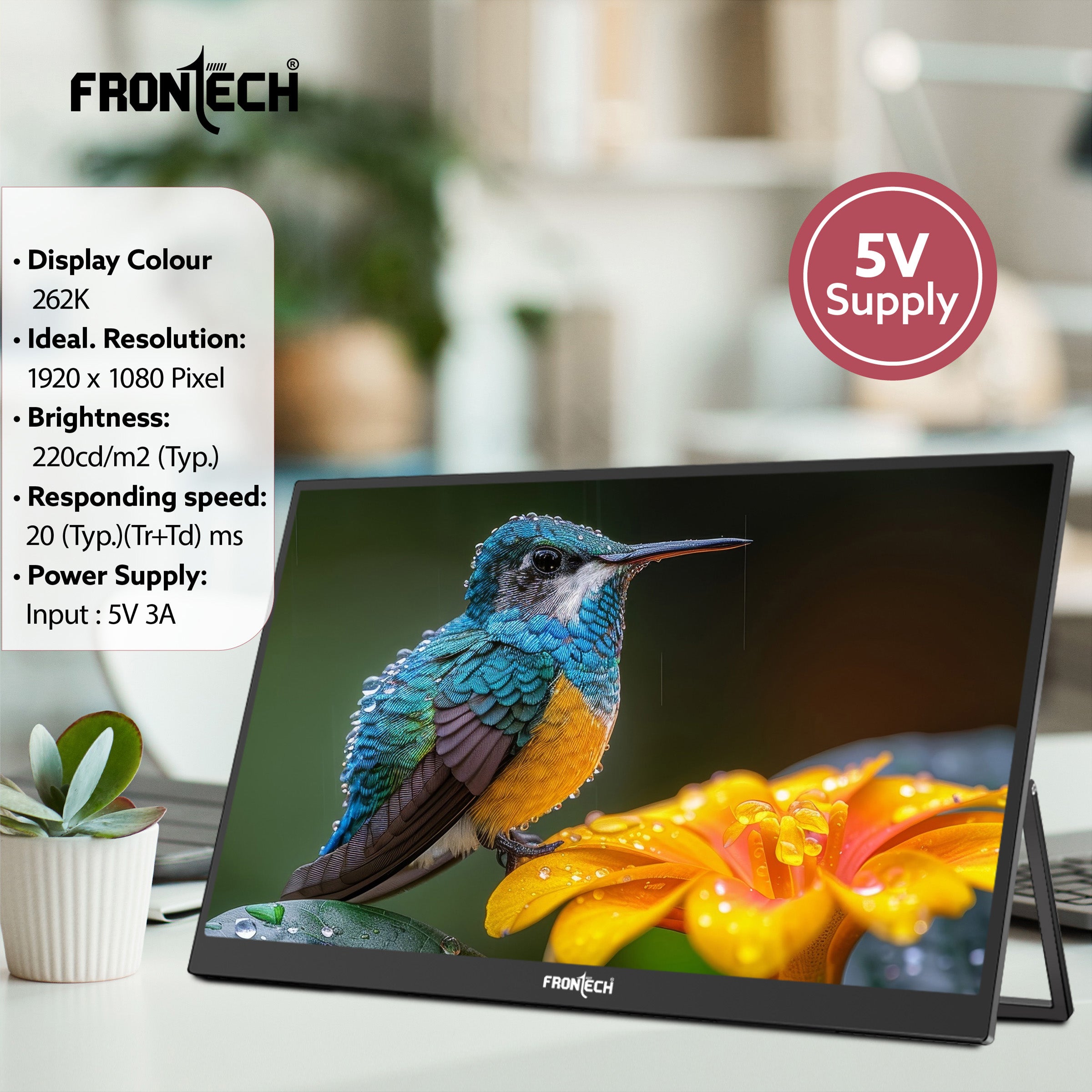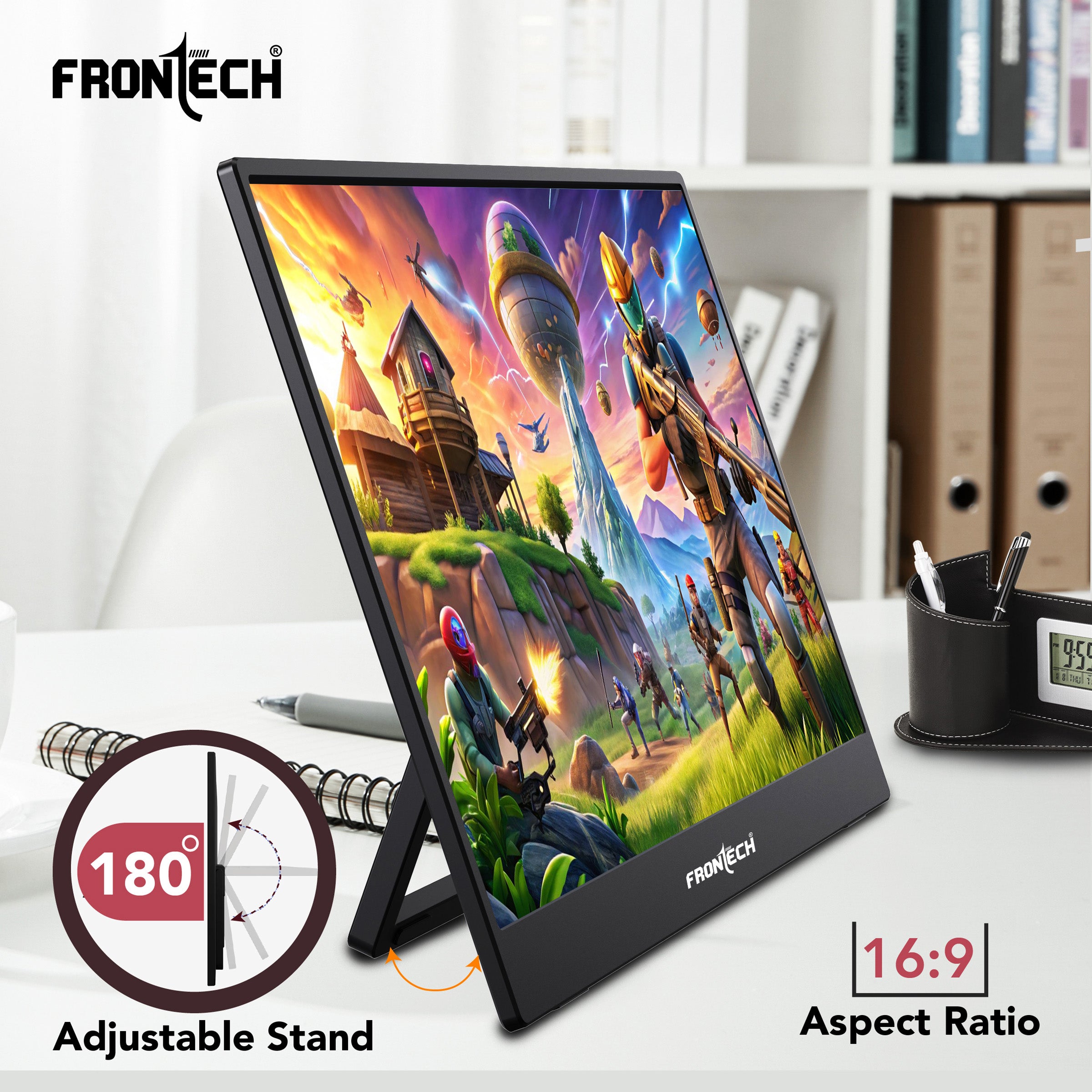 The Frontech MON-0023 Portable LED Monitor has a 15.6-inch Full HD IPS display with dual Type-C and Mini HDMI ports for easy connectivity. Lightweight with a 180° adjustable stand and built-in speakers, it’s perfect for work, travel, and entertainment.