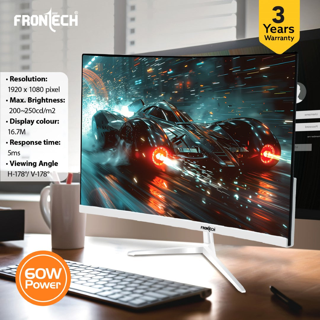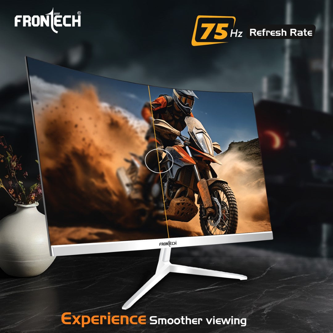 Enjoy the 32 inch curved monitor, designed for an immersive viewing experience with Full HD resolution, offering vibrant and sharp images.Experience fluid visuals with a 75 Hz refresh rate monitor and VA panel technology, ensuring crisp and smooth images for gaming and multimedia.This ultra slim monitor boasts a sleek, bezel less design, making it a stylish addition to any workspace or gaming setup.Dive into the details with the 1920x1080 pixels monitor, offering clear and detailed visuals for an enhanced viewing experience.Experience true-to-life colors with the 16.7M color range, making every scene more vibrant and immersive on this Full HD curved LED monitor.