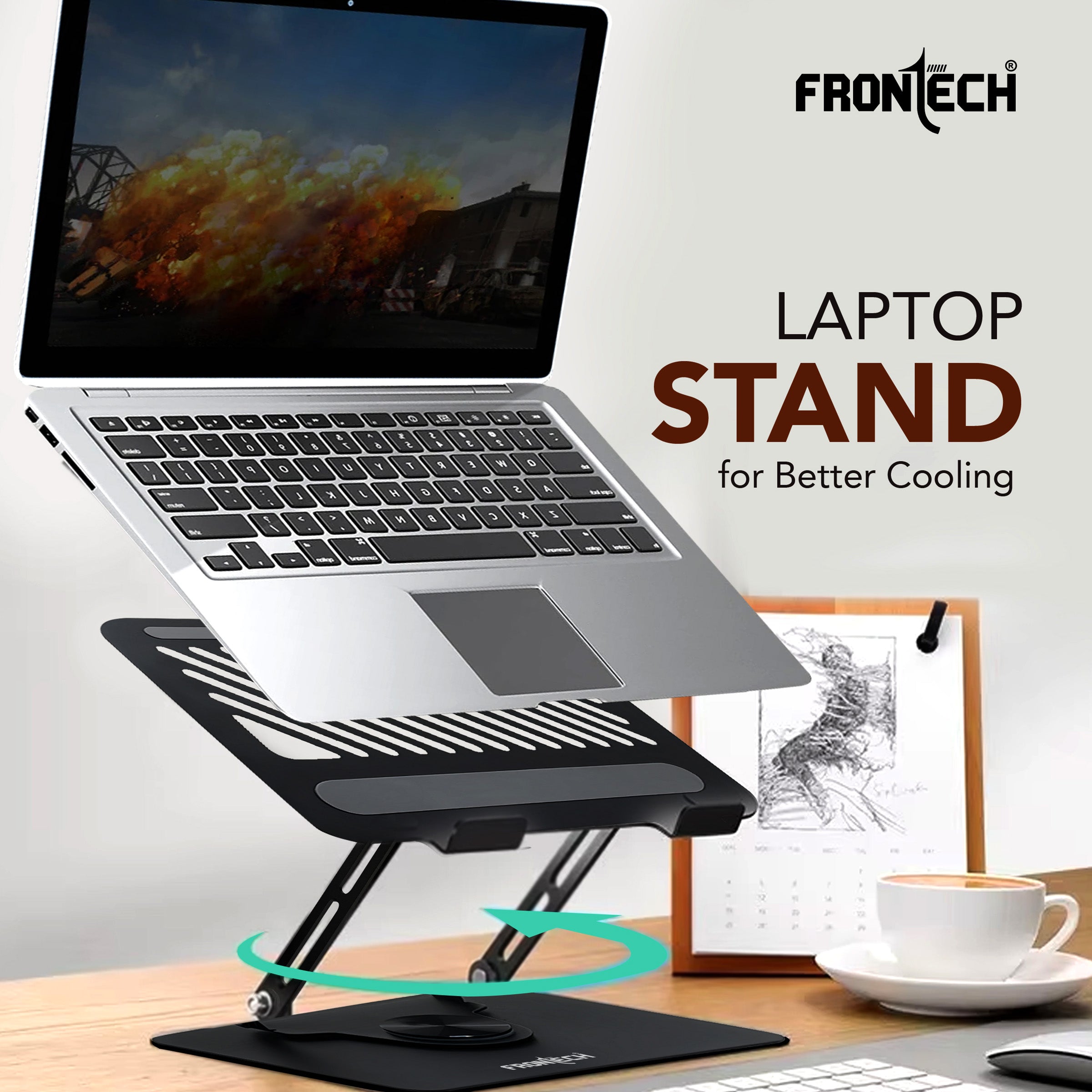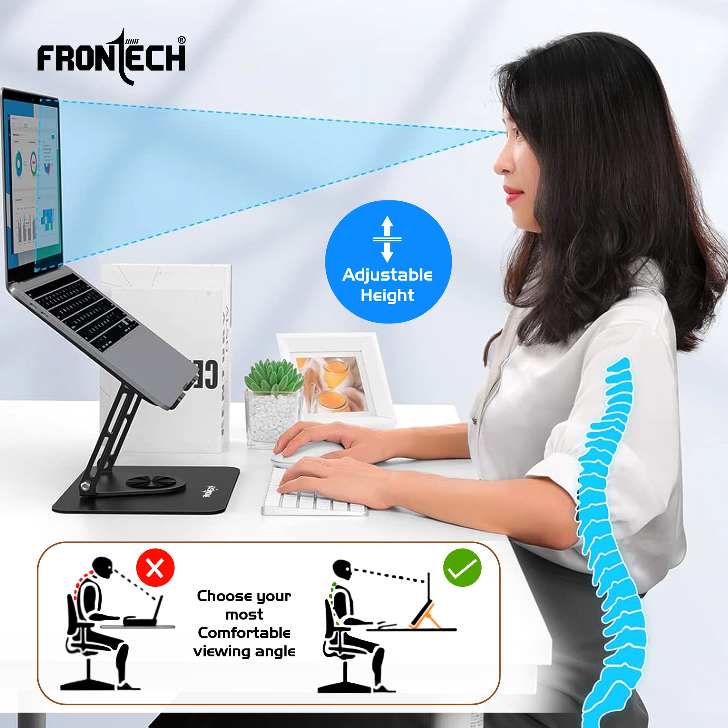 Introducing the FRONTECH Laptop Stand, an essential accessory designed for optimal laptop performance and user comfort. This stand is engineered for better cooling, facilitating increased air circulation to prevent overheating and prolong your device's lifespan. Its 360° rotating base allows for effortless adjustments, letting you gently toggle and position your laptop at any suitable angle. The adjustable height feature promotes an ergonomic design, helping you achieve your most comfortable viewing angle and maintaining a healthy posture by aligning the screen with your eye level, thereby reducing neck and back strain.