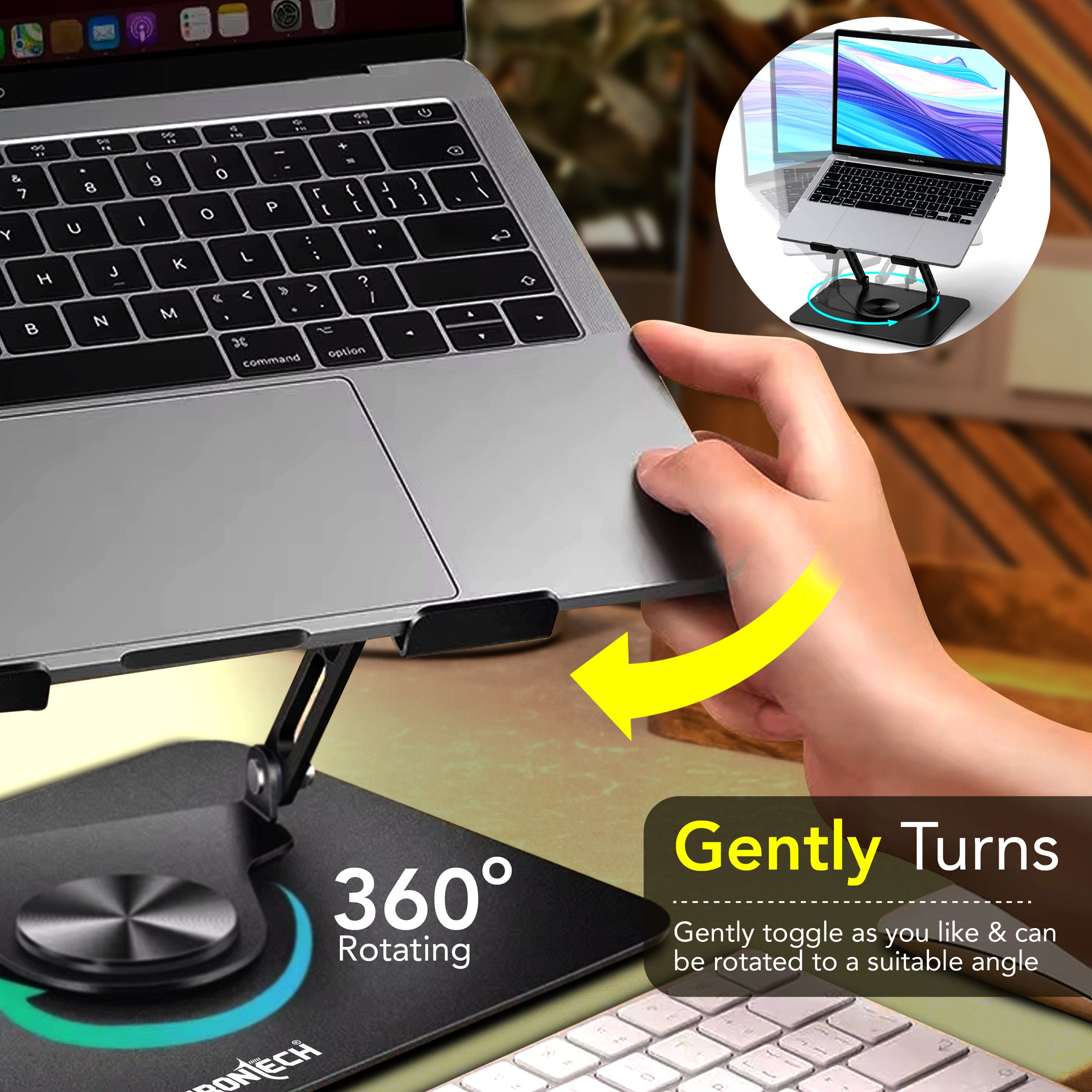 · Optimized Cooling: Designed for better cooling, helping to extend your laptop's lifespan. · 360° Rotating Base: Features a smoothly rotating base that allows you to gently toggle and position your laptop at a suitable angle. · Adjustable Height: Provides adjustable height to help you choose your most comfortable viewing angle and promote better posture. · Ergonomic Design: Promotes a healthier posture by allowing you to align your laptop screen with your eye level, reducing neck and back strain. · Enhanced Air Circulation: The stand's design facilitates increased air circulation around your laptop, preventing overheating and improving performance.