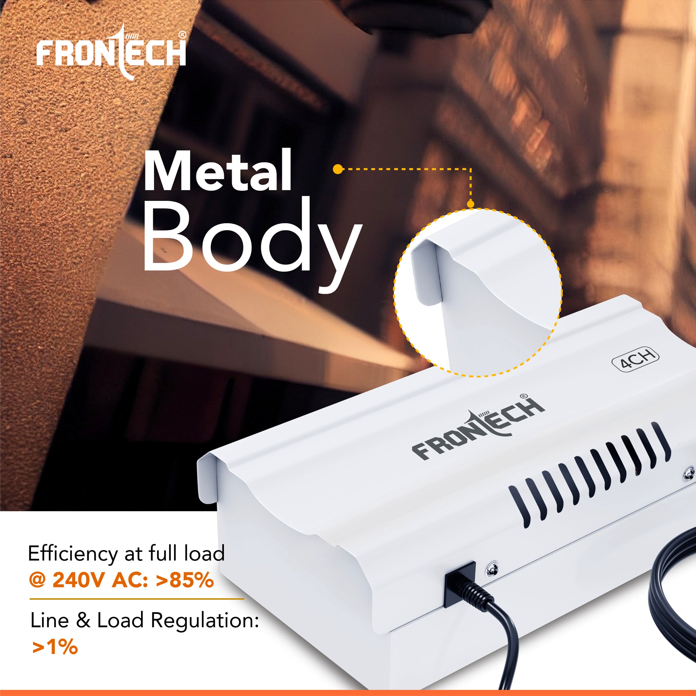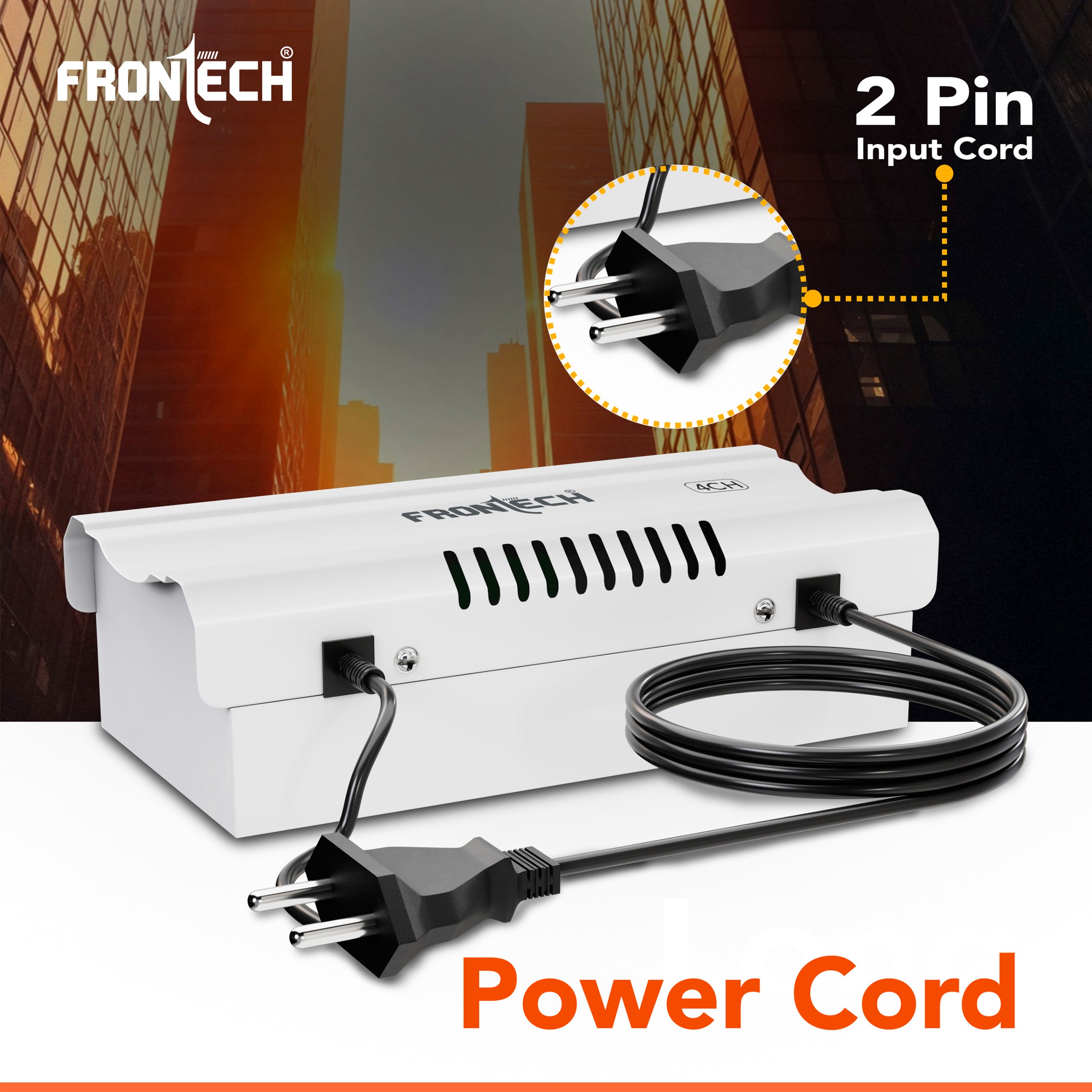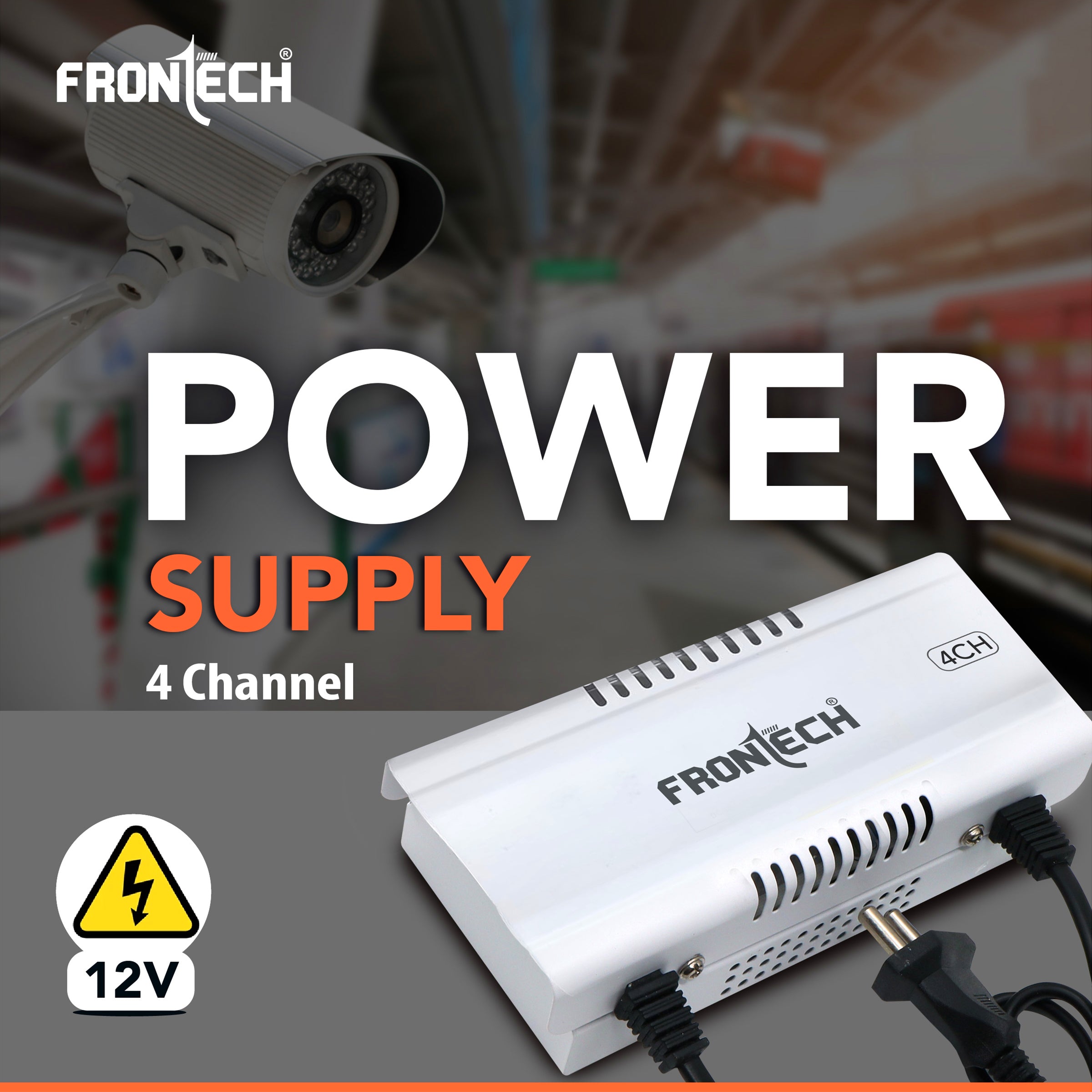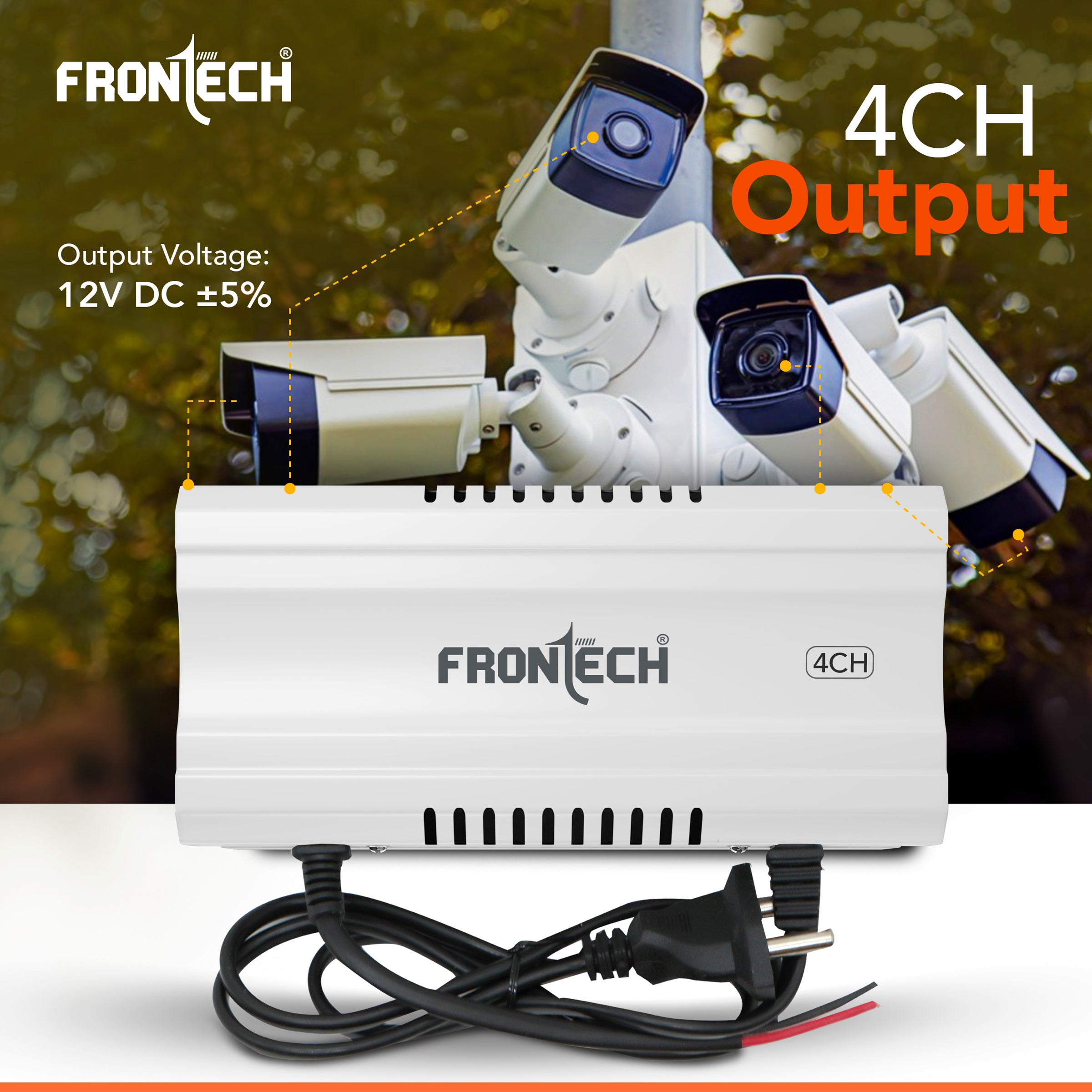 The FRONTECH PS-0056 is a durable, high-performance power supply designed for modern surveillance systems, delivering a stable 12V DC output across four independent channels to efficiently power multiple CCTV cameras from a single source. Built with a sturdy metal body and industrial-grade rainproof housing, it ensures long-lasting reliability and protection in various environments. Supporting a universal input voltage range of 150–285V AC and achieving over 85% efficiency at full load, it offers dependable performance even in areas with unstable electricity. Its “Easy to Install” design, equipped with a 2-pin input cord, simplifies setup, while built-in surge protection and overload short-circuit safeguards ensure the safety of connected devices.