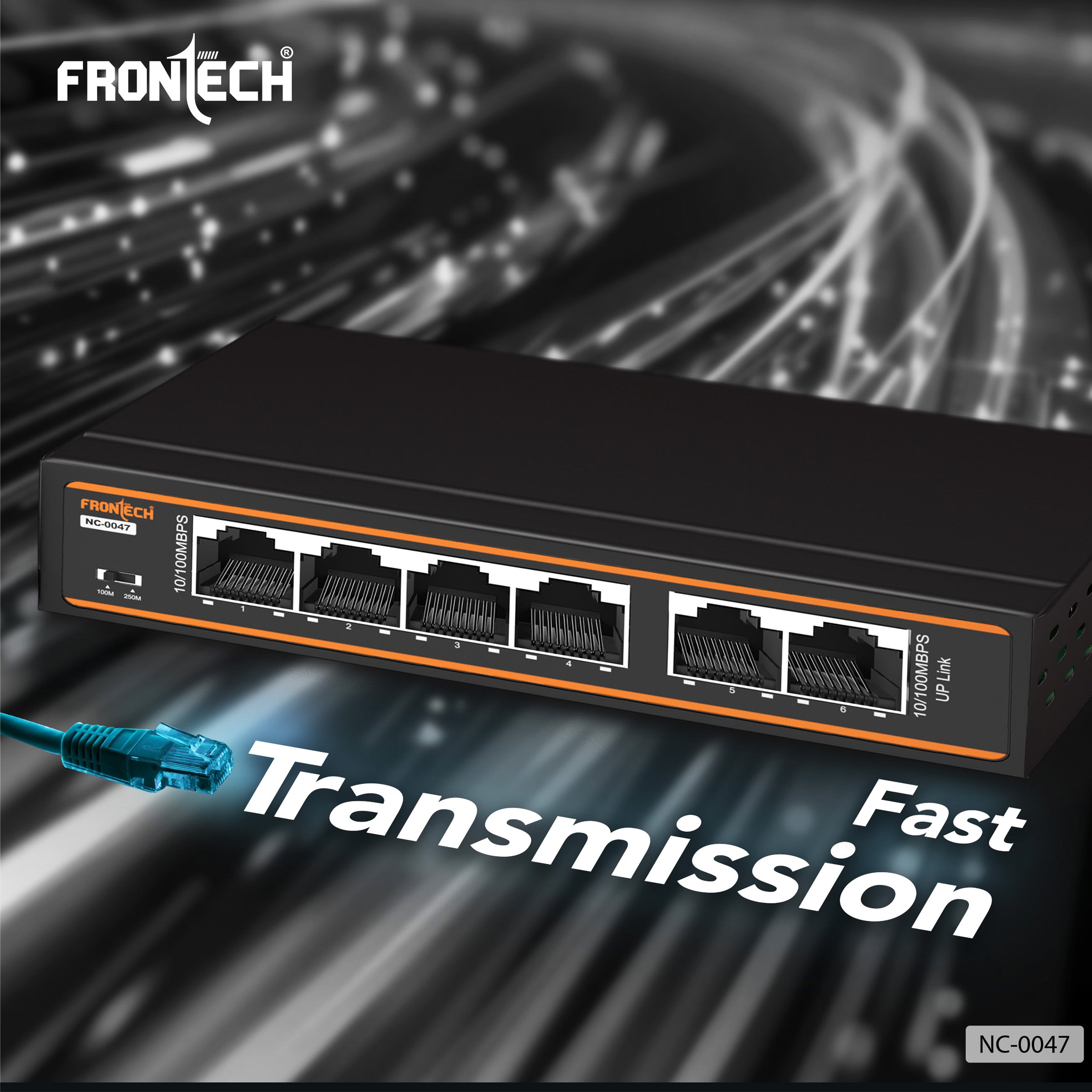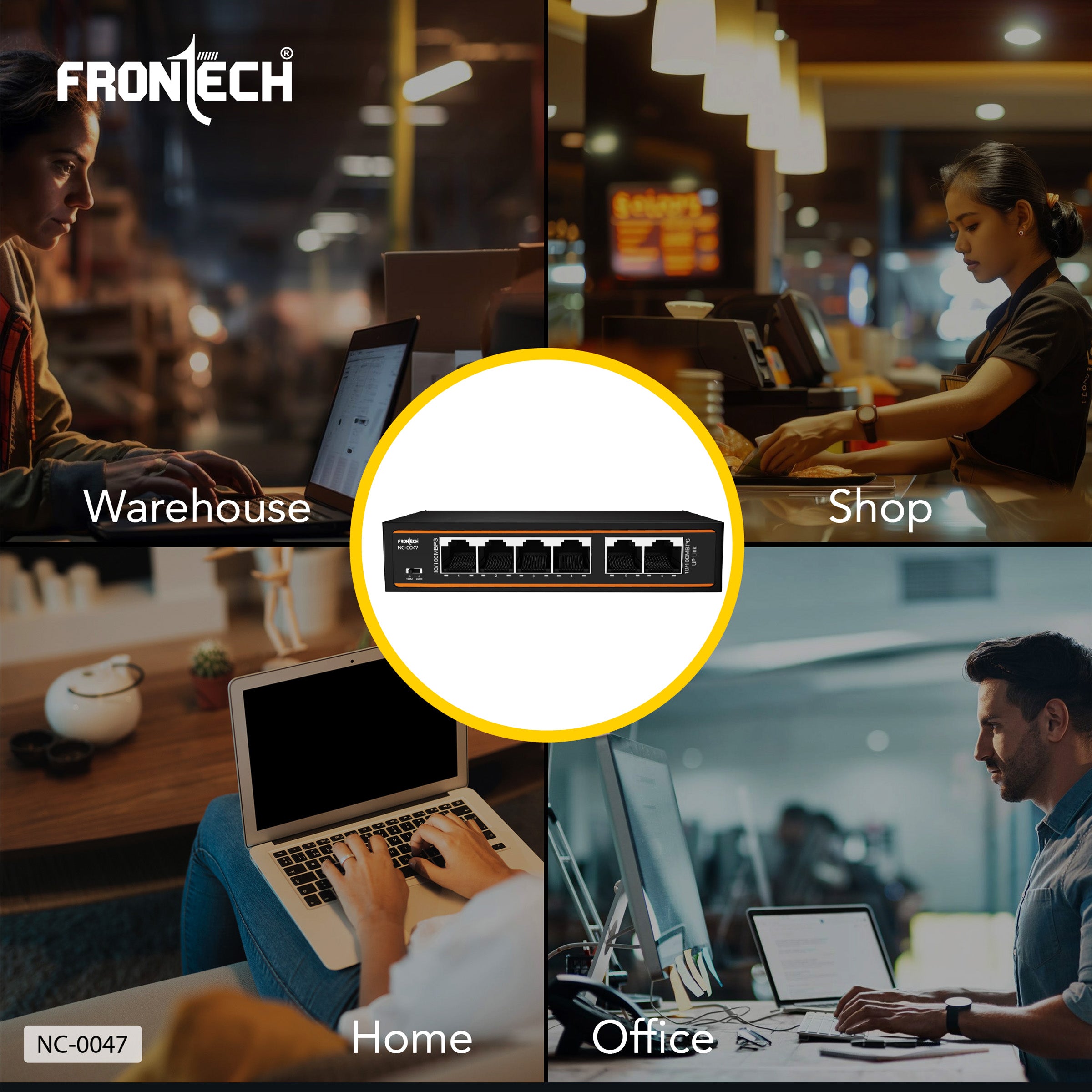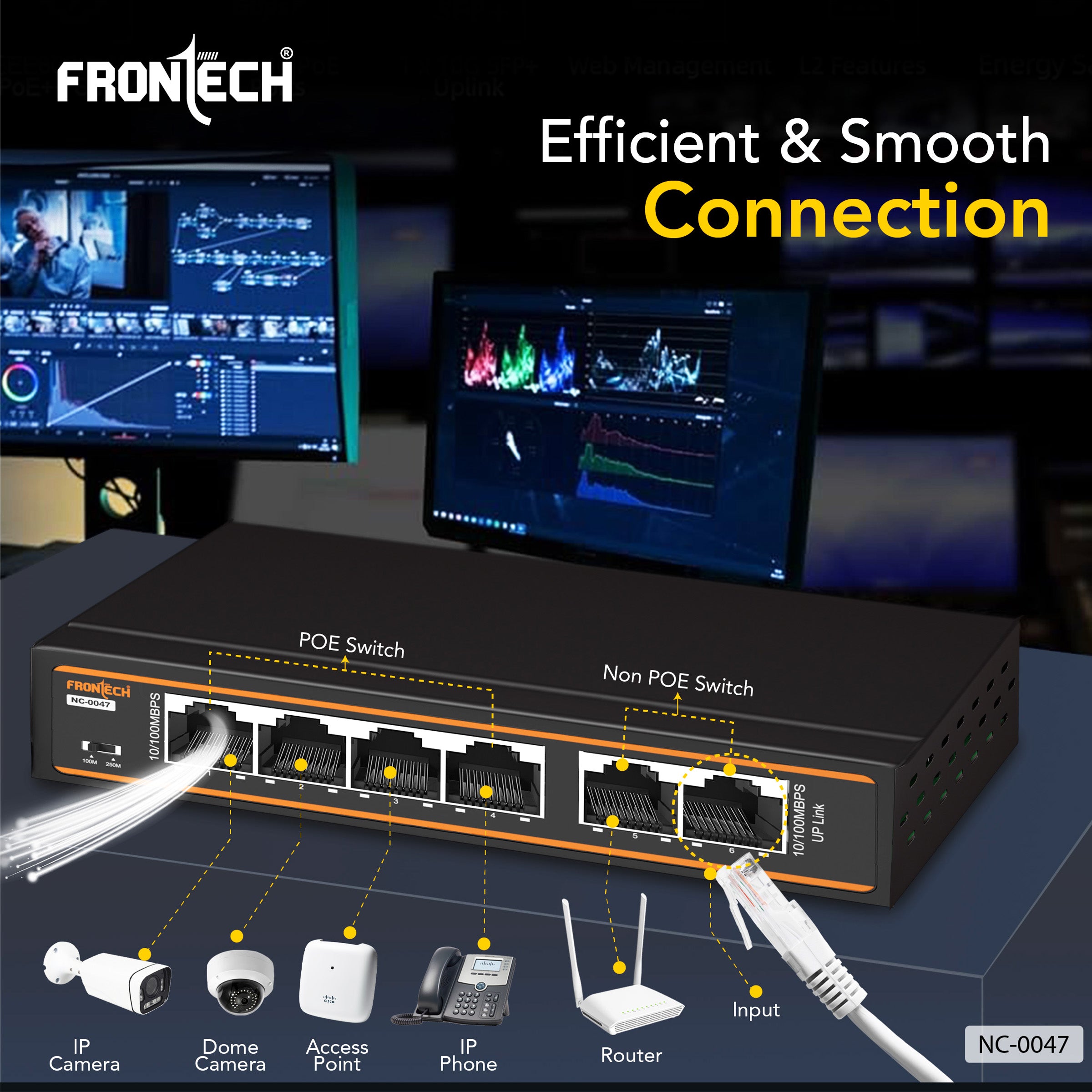 • 4 PoE+ ports & 2 uplink ports for IP cameras, access points, and phones • 72W PoE budget with 10/100 Mbps speeds, up to 250m range • Plug & play, compact design (135×120×38 mm) with wall-mount support • Runs on 220V AC with 3-pin power cord • 2-year Frontech warranty for reliability