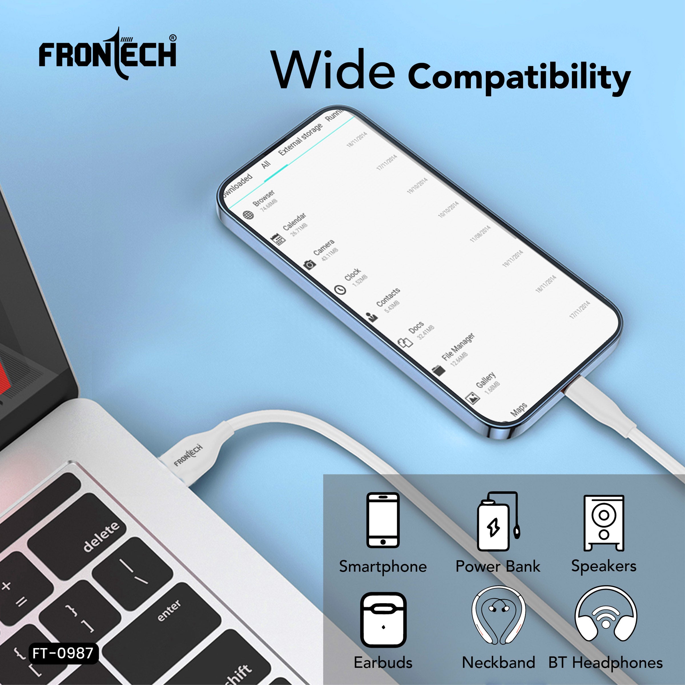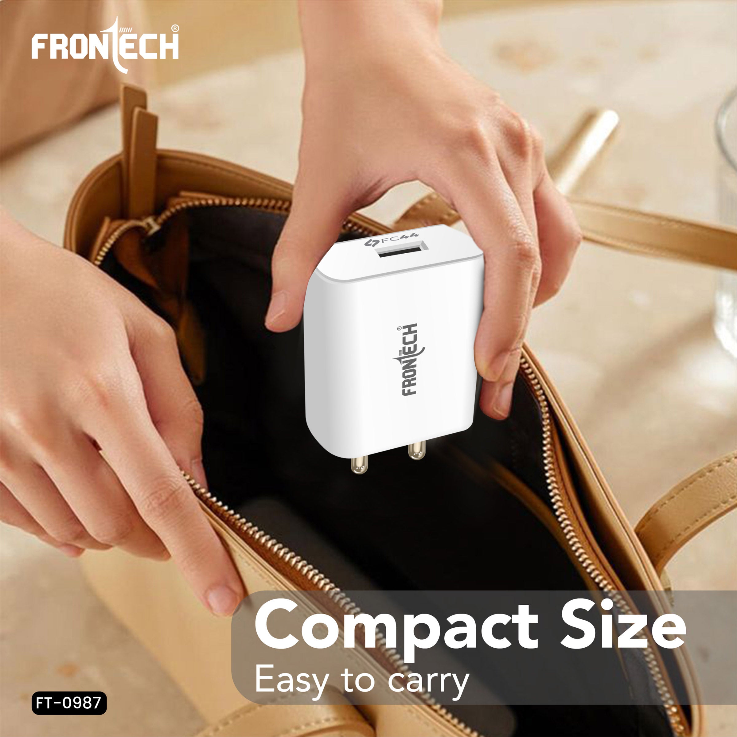 FRONTECH FT-0987 Charger is a powerful and versatile charging solution. It delivers 44 Watts of power, with a USB-A output providing 5V/3A, 9V/3A, or 11V/4A, ensuring fast and efficient charging. Equipped with an integrated smart chip, the charger optimises the charging process for enhanced efficiency. Safety is a priority with the FT-0987, as it features multiple protection mechanisms, including short-circuit protection, overcharging protection, and overheating protection. This charger boasts wide compatibility, working seamlessly with all smartphones and tablets. It can also be used to charge power banks, speakers, earbuds, and neckband Bluetooth headphones. The FRONTECH FT-0987 features a compact design, making it easy to carry for use in various settings like the office, home, cafe, or while travelling.