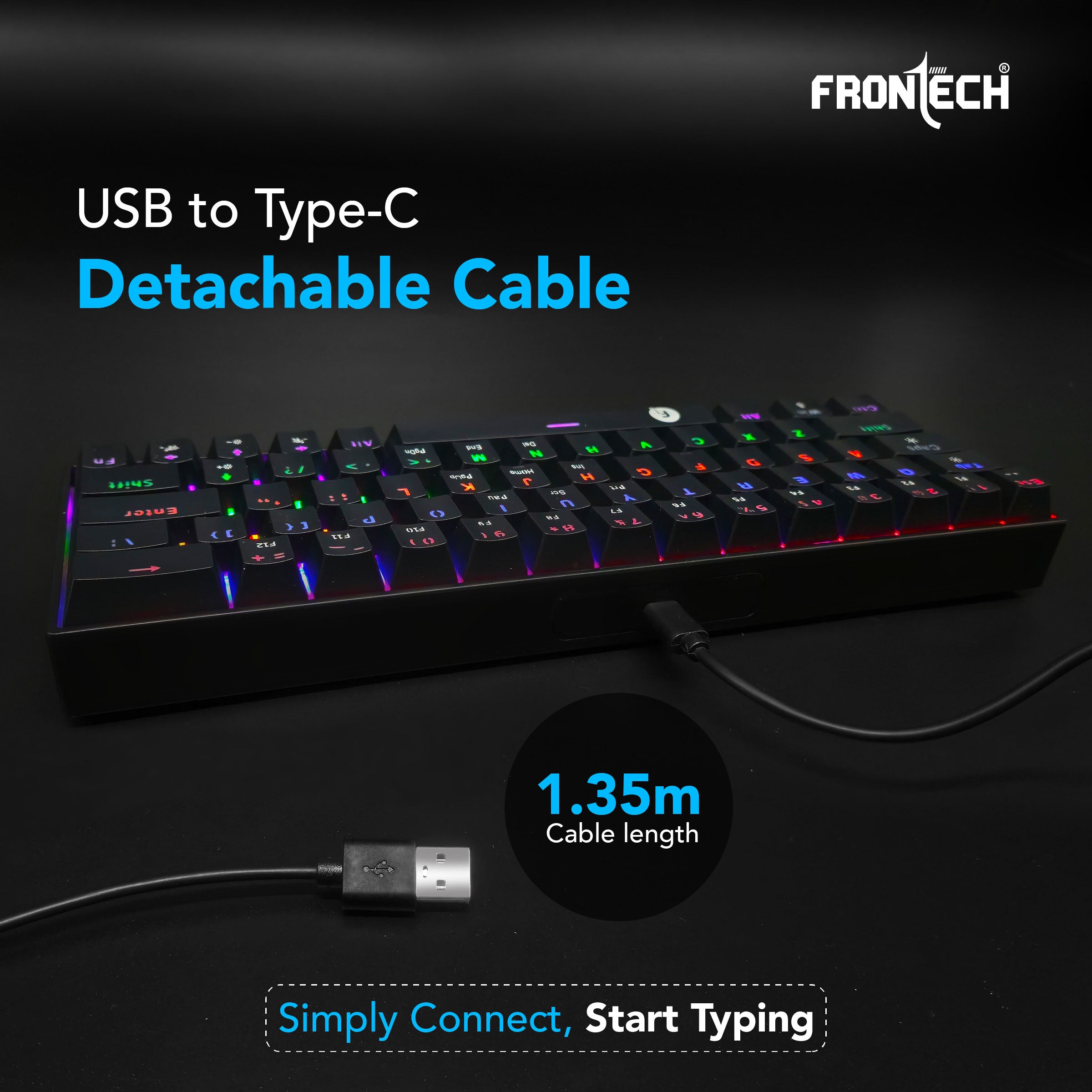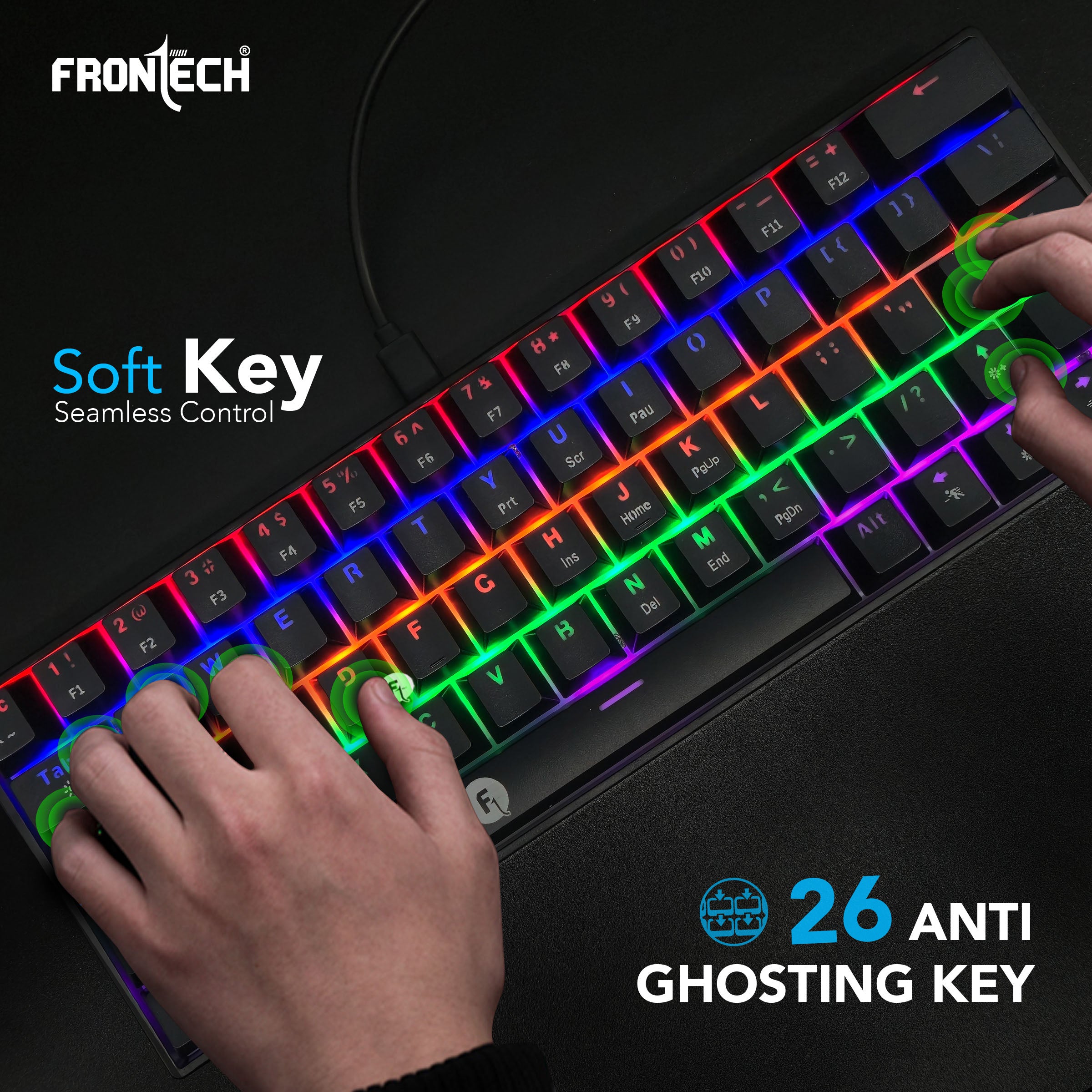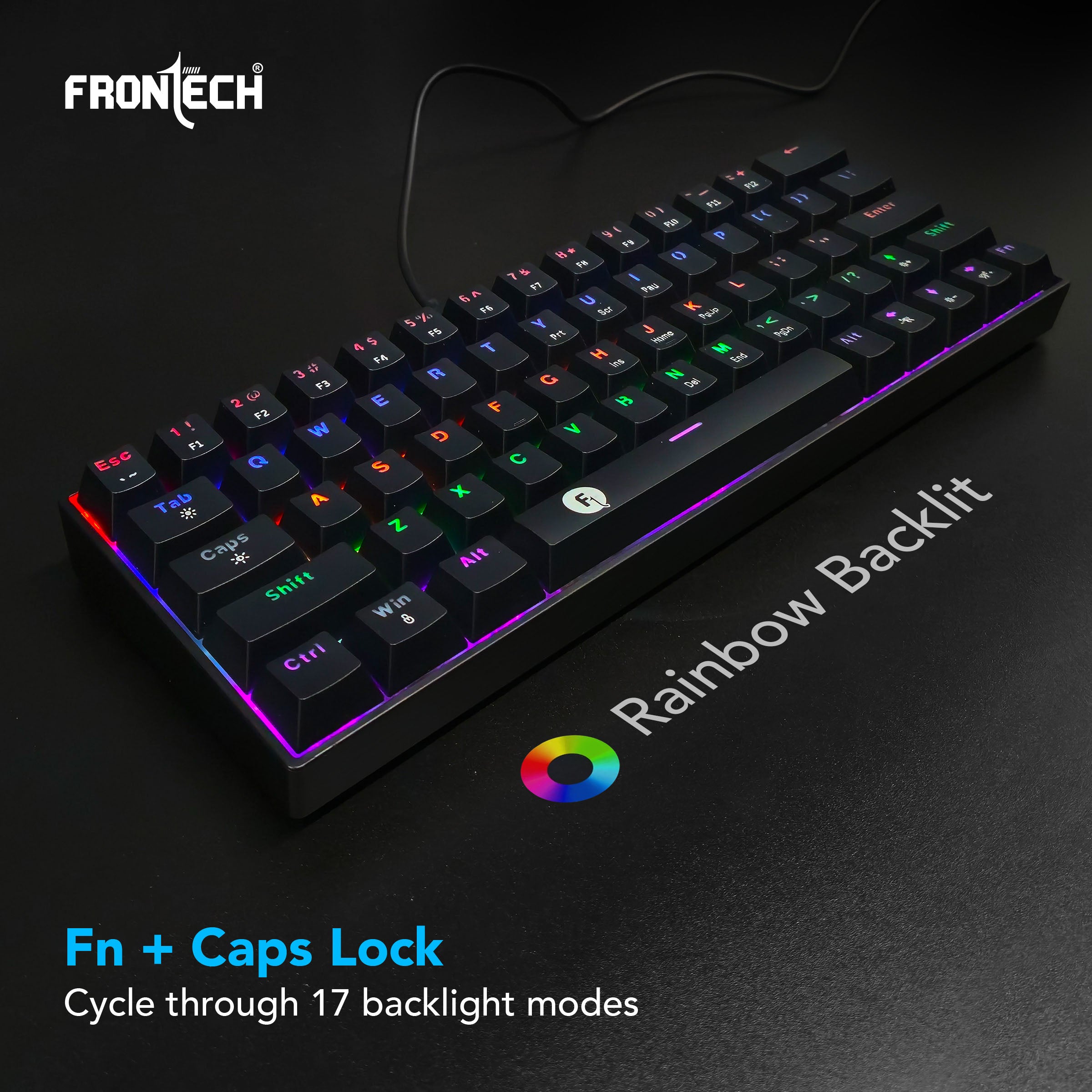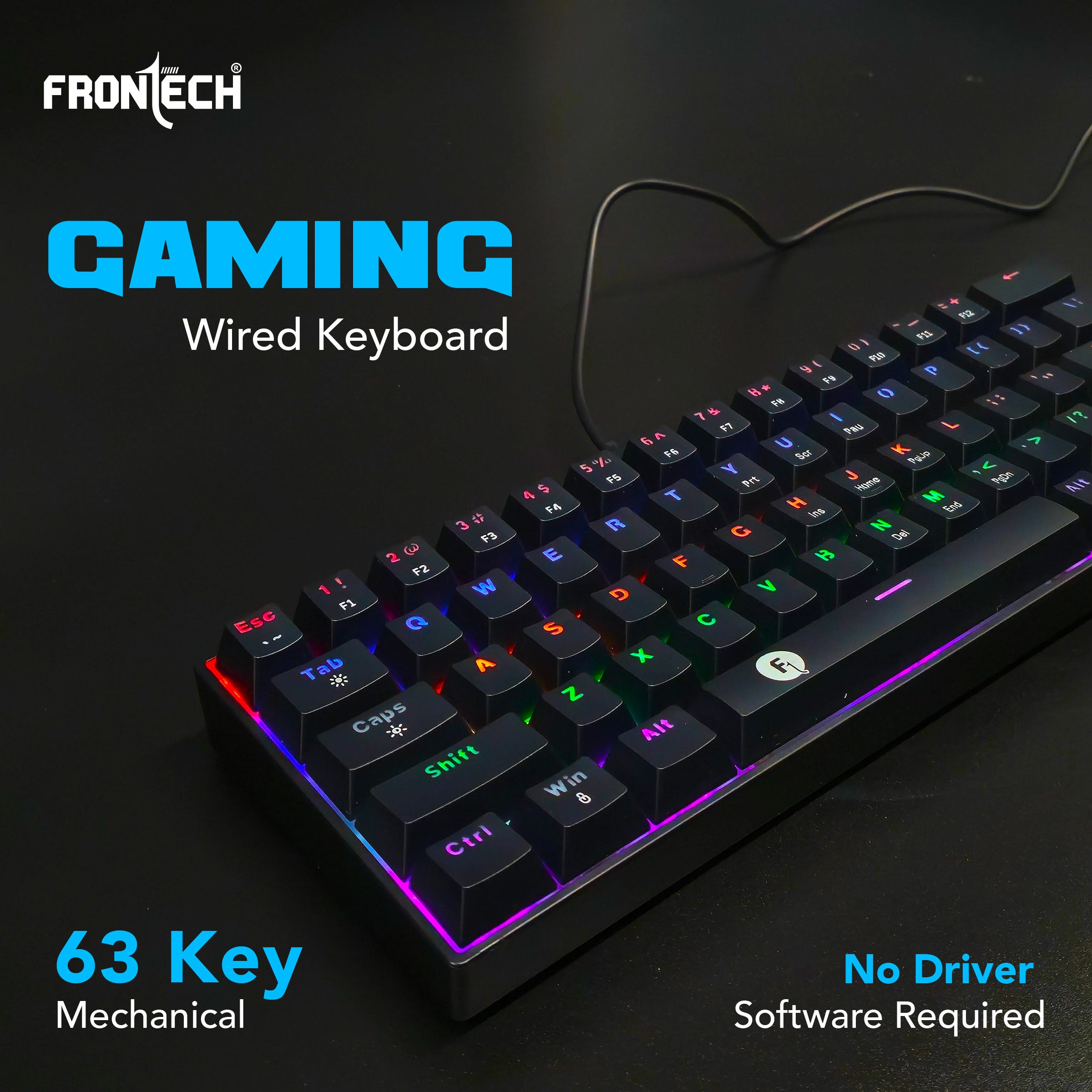 Space-saving 63-key mechanical layout designed for ergonomic comfort and desk efficiency. Dynamic rainbow backlighting with 17 customizable effects accessible via Fn + Caps Lock. 26 anti-ghosting keys to ensure accurate command execution during high-speed gaming. Includes a 1.5m detachable USB to Type-C cable for easy travel and connectivity. Universal plug-and-play compatibility with Windows, Mac, iOS, and Android—no software required. Backed by a 1-year limited warranty.
