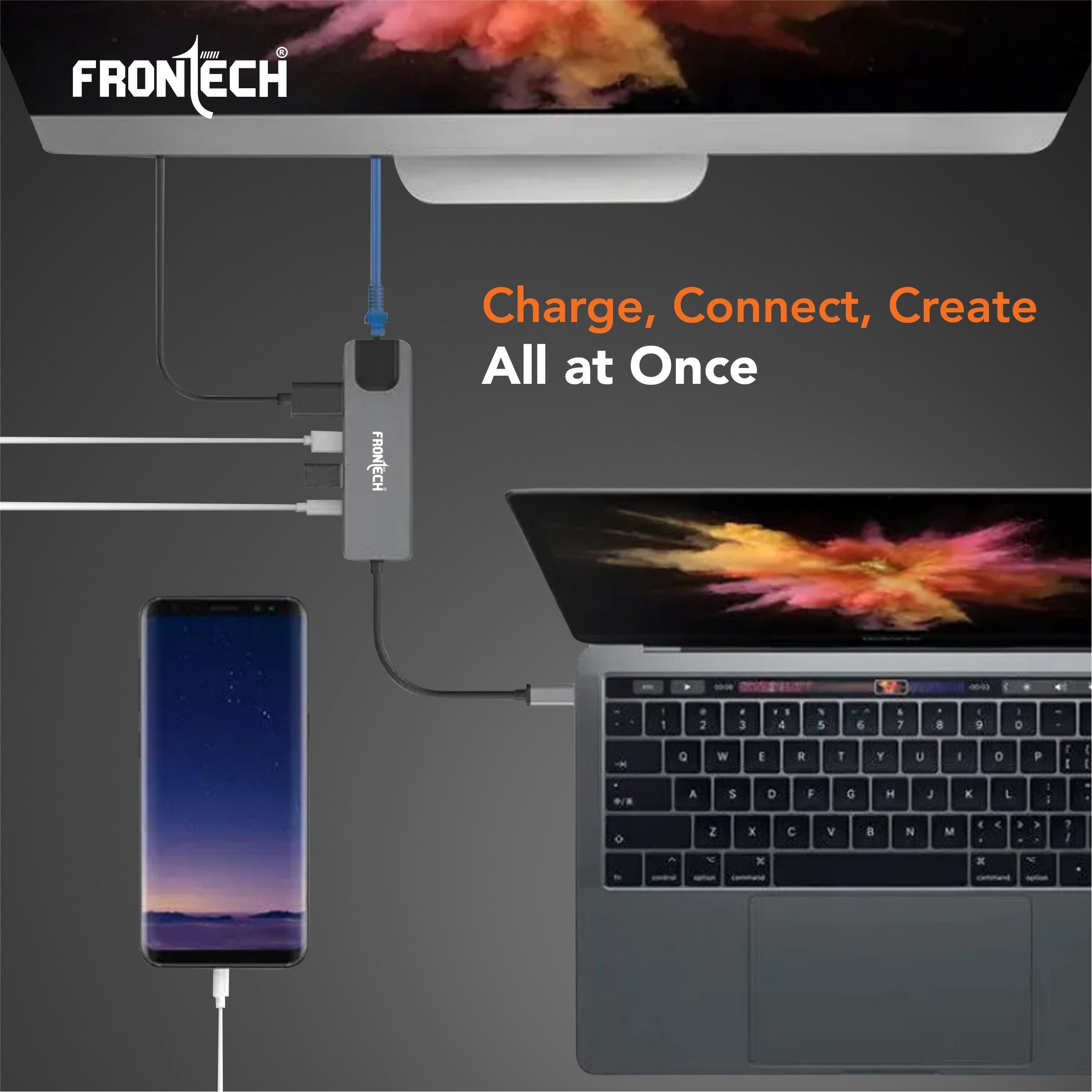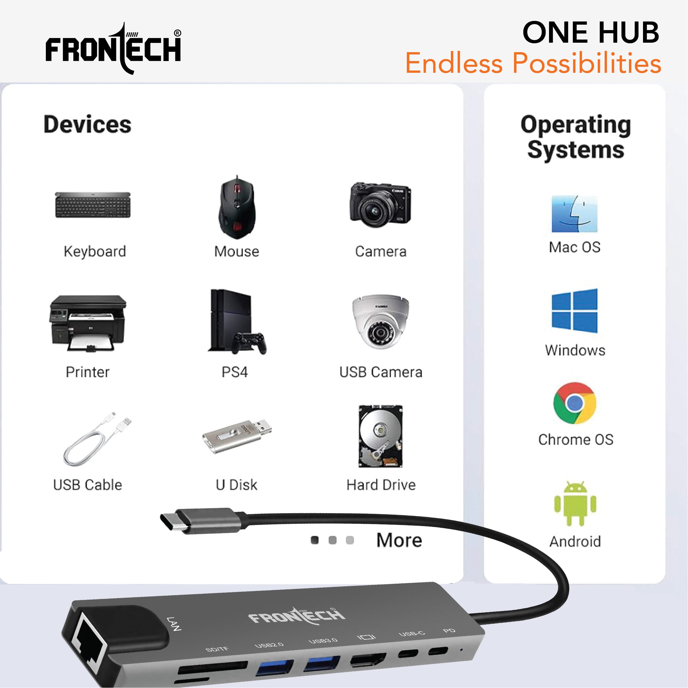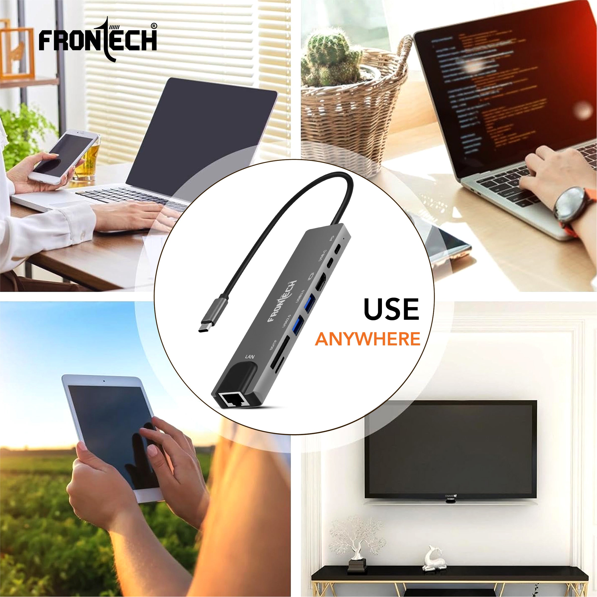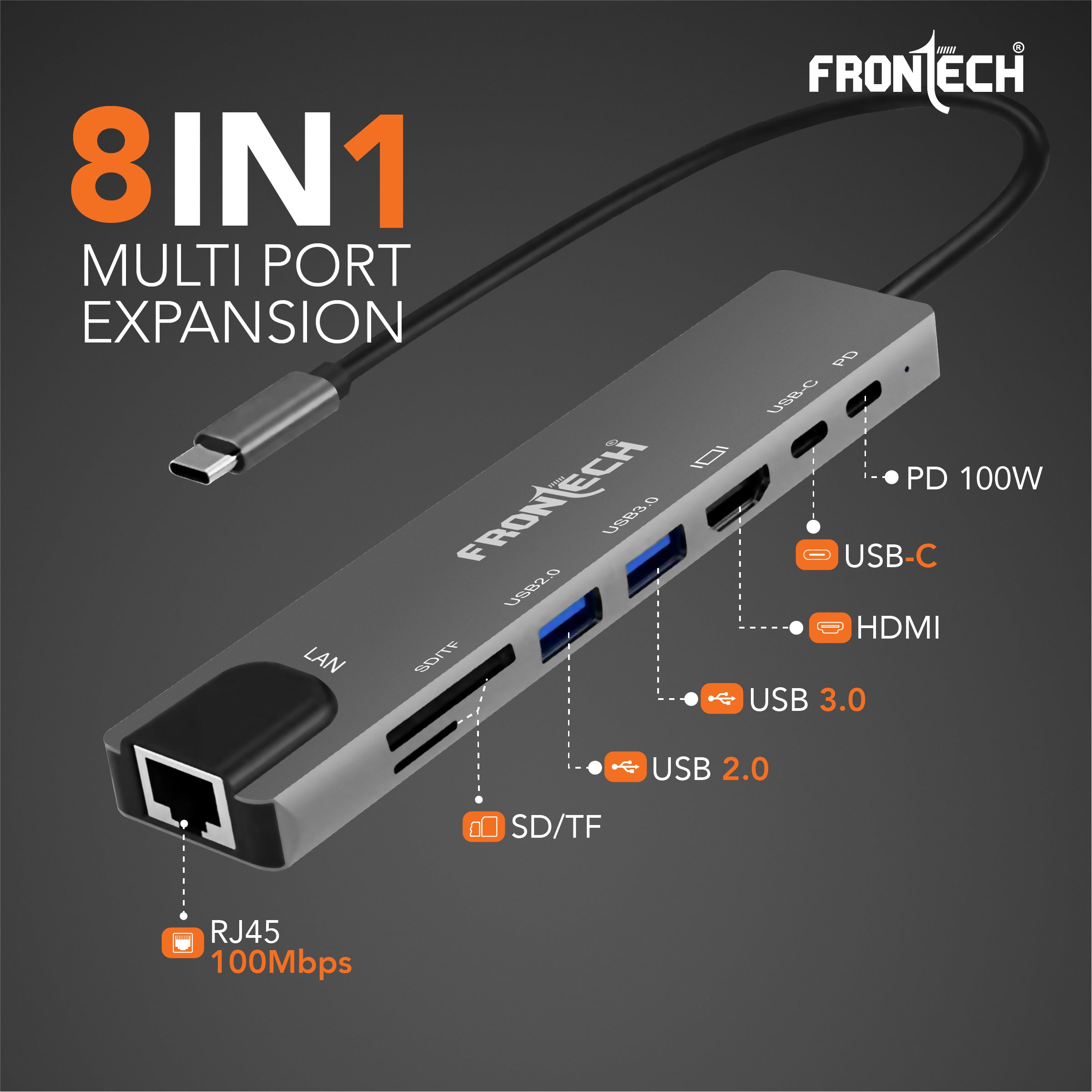 The Frontech 8-in-1 USB-C Multi-Port Expansion Hub (NC-0059) is designed to simplify your workflow with a single compact solution. Featuring 4K HDMI, 100W PD fast charging, LAN connectivity, high-speed USB 3.0/2.0 ports, and dual card readers, it ensures seamless performance for office, home, and travel. Built with durable aluminium alloy and lightweight design, it’s the perfect docking station for laptops, MacBook’s, and tablets.