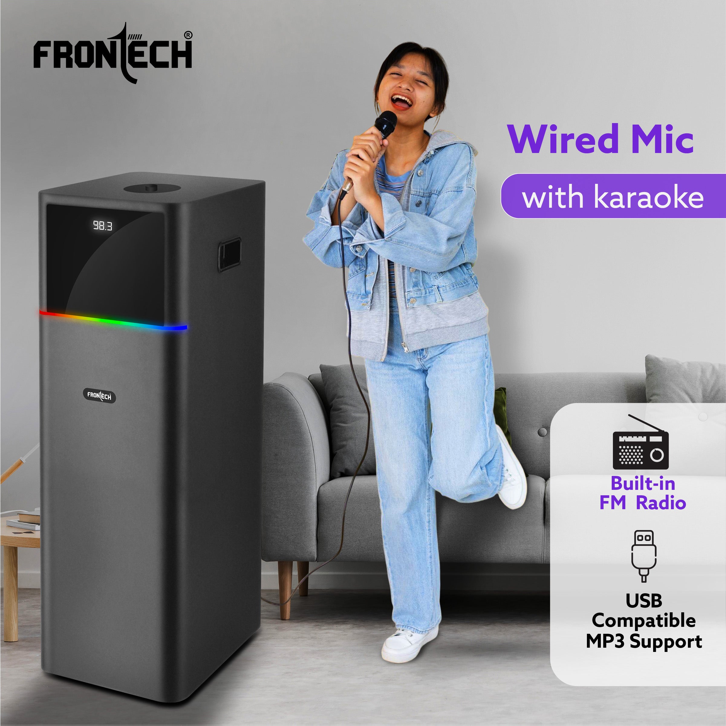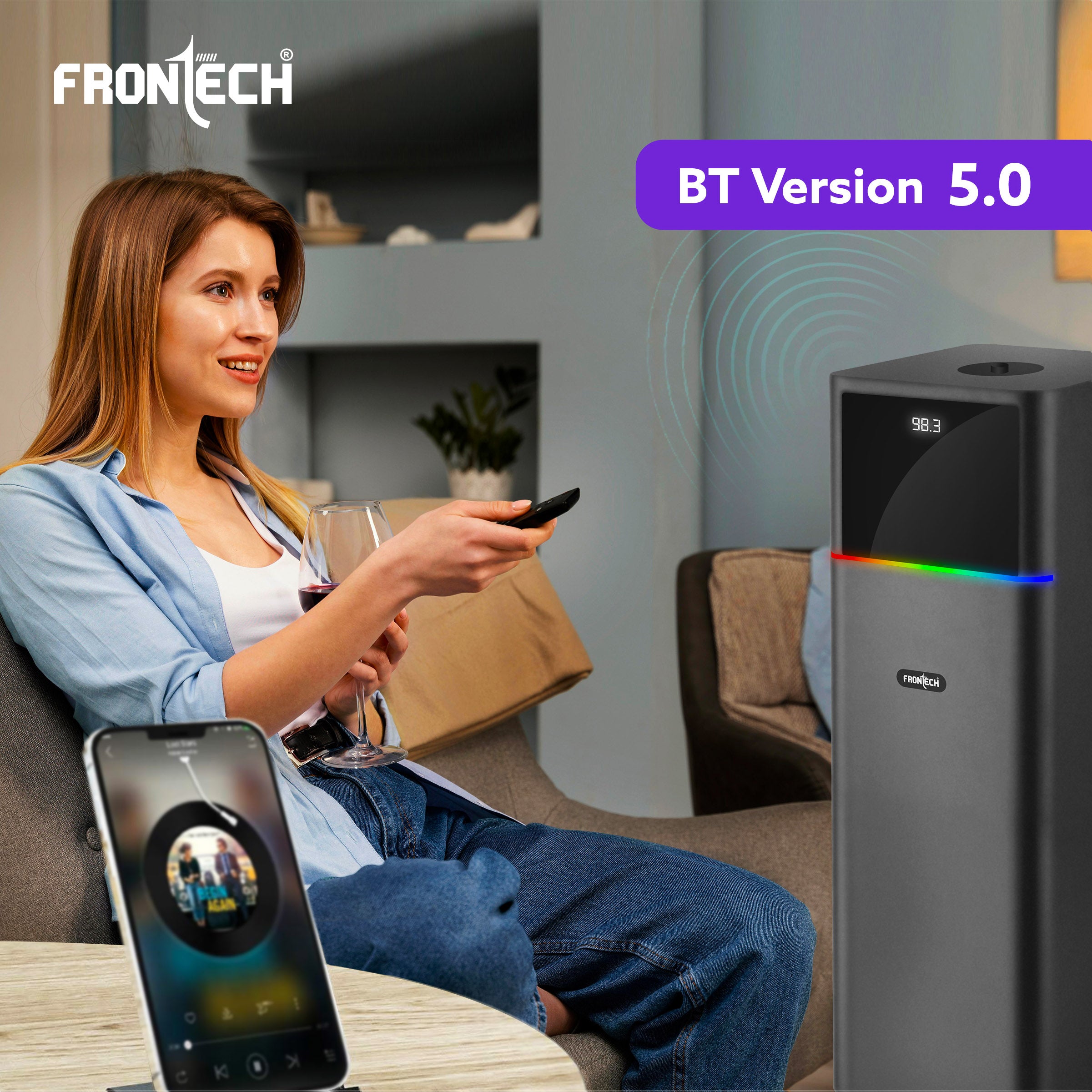 The FRONTECH CRUX-168 SW-0168 is a 1.0-channel Tower Speaker with a powerful 90W output. It features Bluetooth Version 5.0 for wireless connectivity, and supports USB/BT/FM/AUX/Mic as source inputs. The tower includes an LED Digital Display and comes with a wired microphone for karaoke functions. It is covered by a 1-year limited warranty.