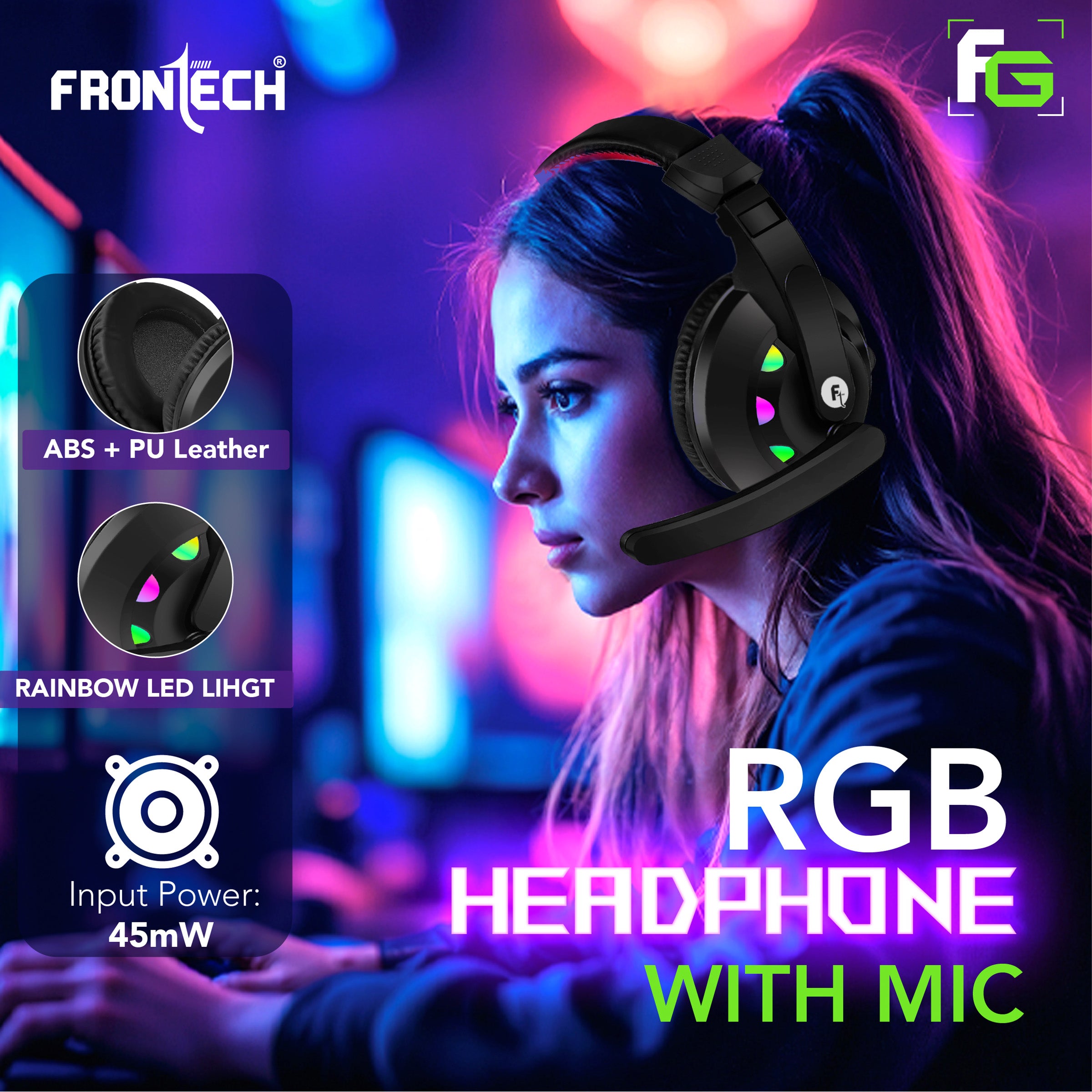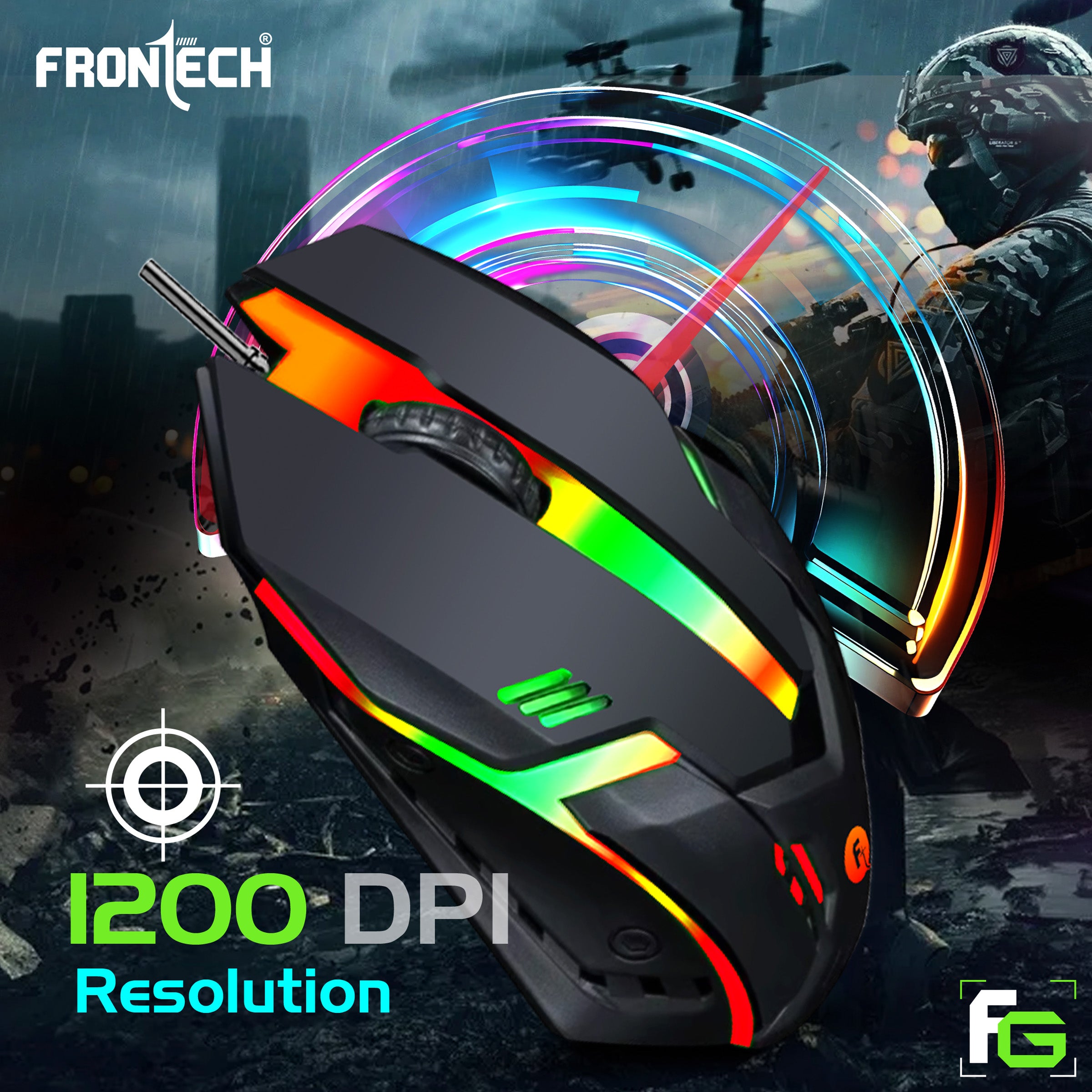· Unleash Your Inner Dragon Warrior: A complete 4-in-1 gaming combo designed to elevate your gaming experience. · Vibrant RGB Illumination: Immerse yourself in the game with dynamic RGB lighting on the keyboard, mouse, and headset, featuring striking rainbow LED effects. · Ergonomic Precision Gaming Mouse: Engineered for effortless control and comfort during extended gaming sessions, boasting a 1200 DPI resolution for precise tracking. · High-Performance Gaming Keyboard: Equipped with 104 soft keys and 12 functional hotkeys, offering convenient shortcuts for both gaming and office work. · Immersive RGB Headset with Mic: Experience crystal-clear audio and communication with an adjustable microphone and comfortable ABS + PU Leather earcups, powered by a 45mW input. · Ultra-Smooth Gaming Mouse Pad: A large, ultra-smooth lycra cloth surface ensures seamless mouse movement for enhanced accuracy and control. · Durable and Responsive Design: Built to withstand intense gaming, providing tactile feedback and reliable performance. · Plug & Play Convenience: Get into the action quickly with easy USB connectivity for all components. · FRONTECH Quality: Trust in the reliability and performance of FRONTECH gaming peripherals.