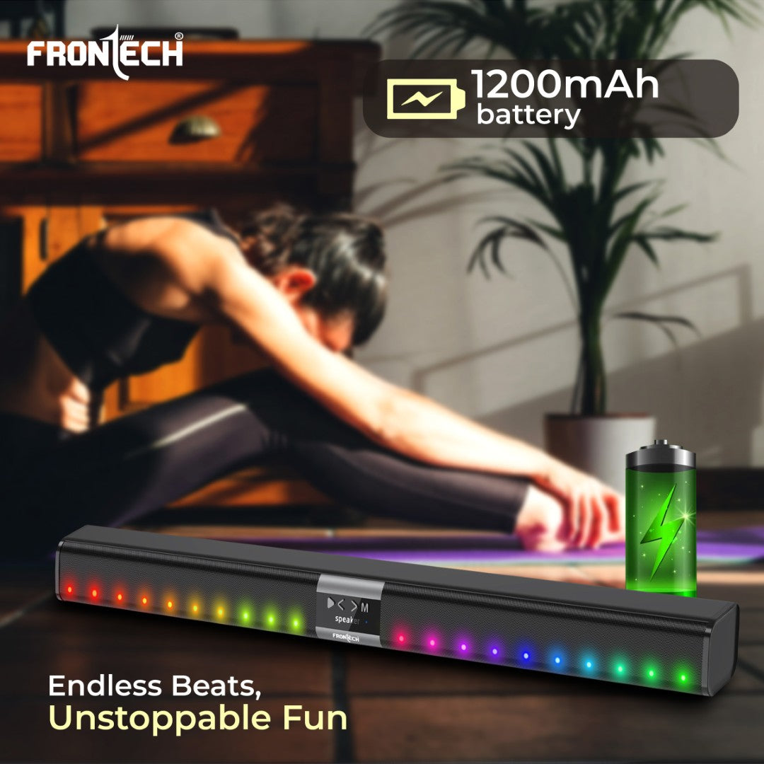 Delivers dynamic and immersive audio with 40W RMS power, providing clear and rich sound for an enhanced listening experience, whether for movies, music, or gaming. Enjoy faster, more stable wireless connections with the latest Bluetooth 5.3 technology, ensuring uninterrupted streaming from smartphones, tablets, laptops, and other Bluetooth-enabled devices. Equipped with AUX, USB, TF card, and a 3.5mm jack, the soundbar offers versatile connectivity, allowing you to easily switch between different audio sources for ultimate convenience. With dimensions of 80 x 6 x 6.2 cm, the sleek and modern design seamlessly fits into any space, making it an ideal addition to your living room, bedroom, or office setup. Powered by a 1200mAh battery and a USB 5V input (1-2A), it ensures extended playtime and convenient charging, providing continuous entertainment with minimal interruptions.