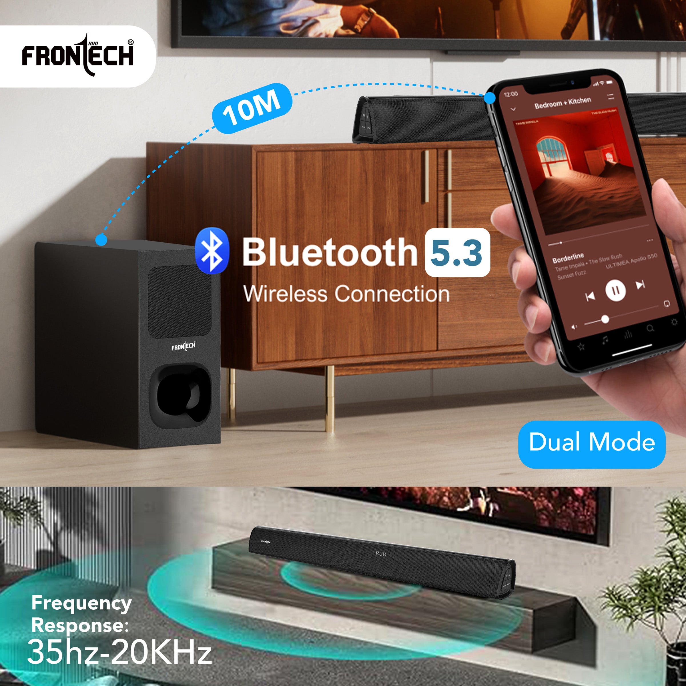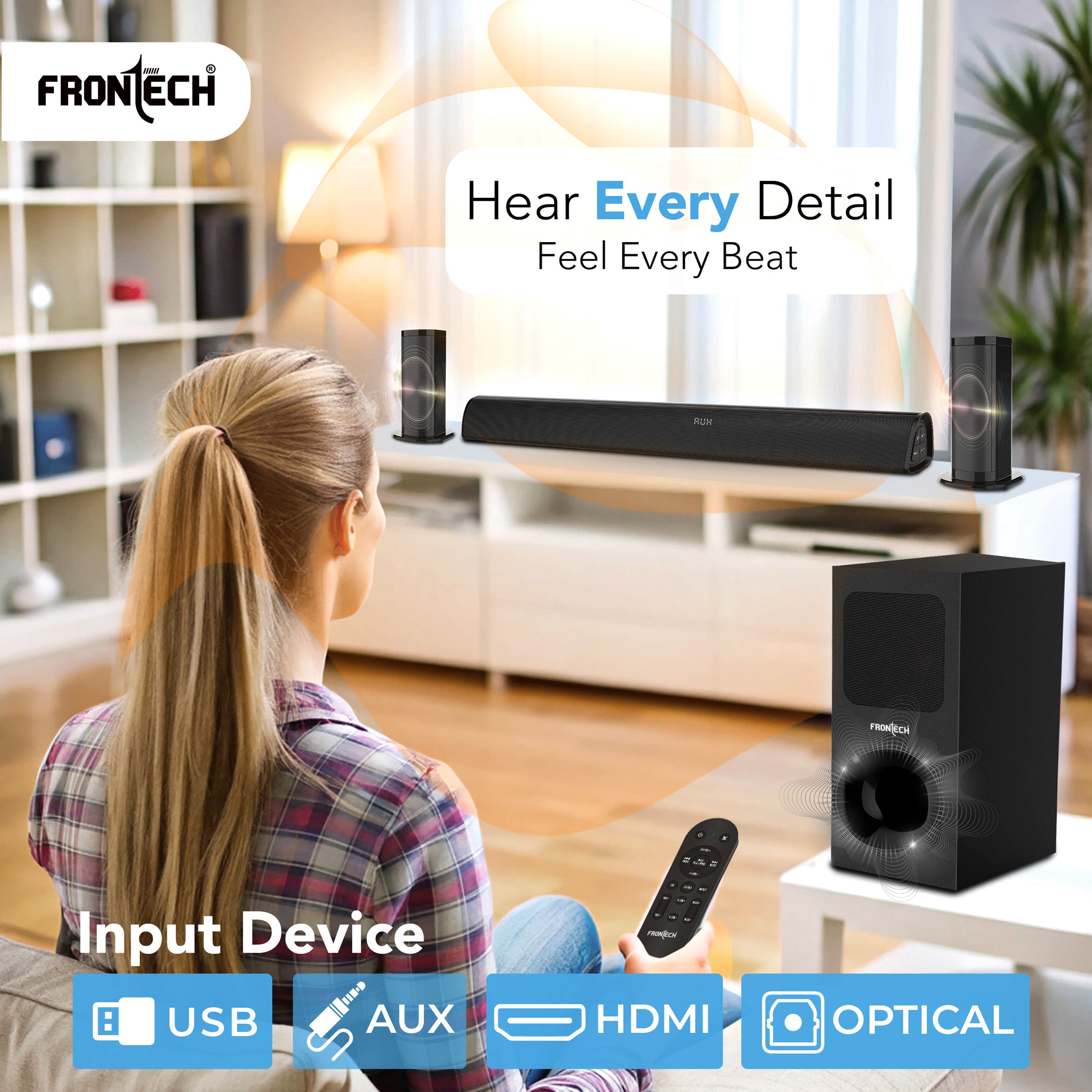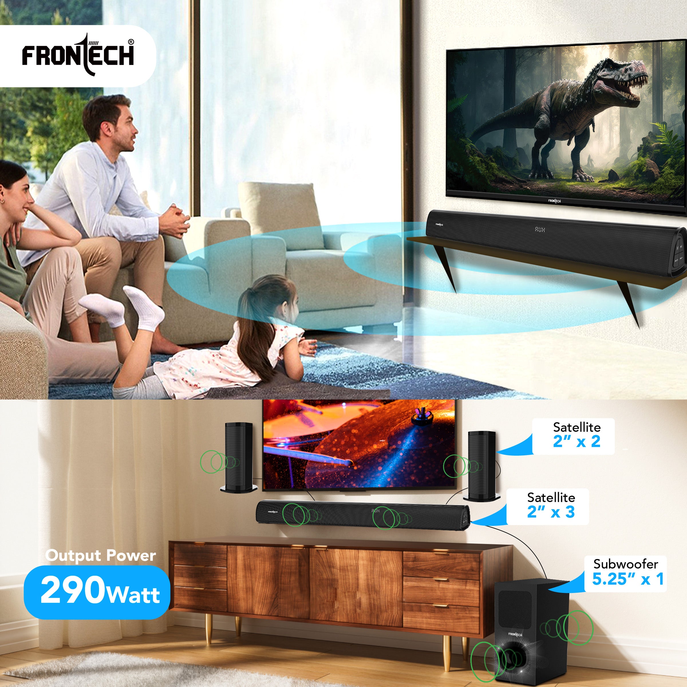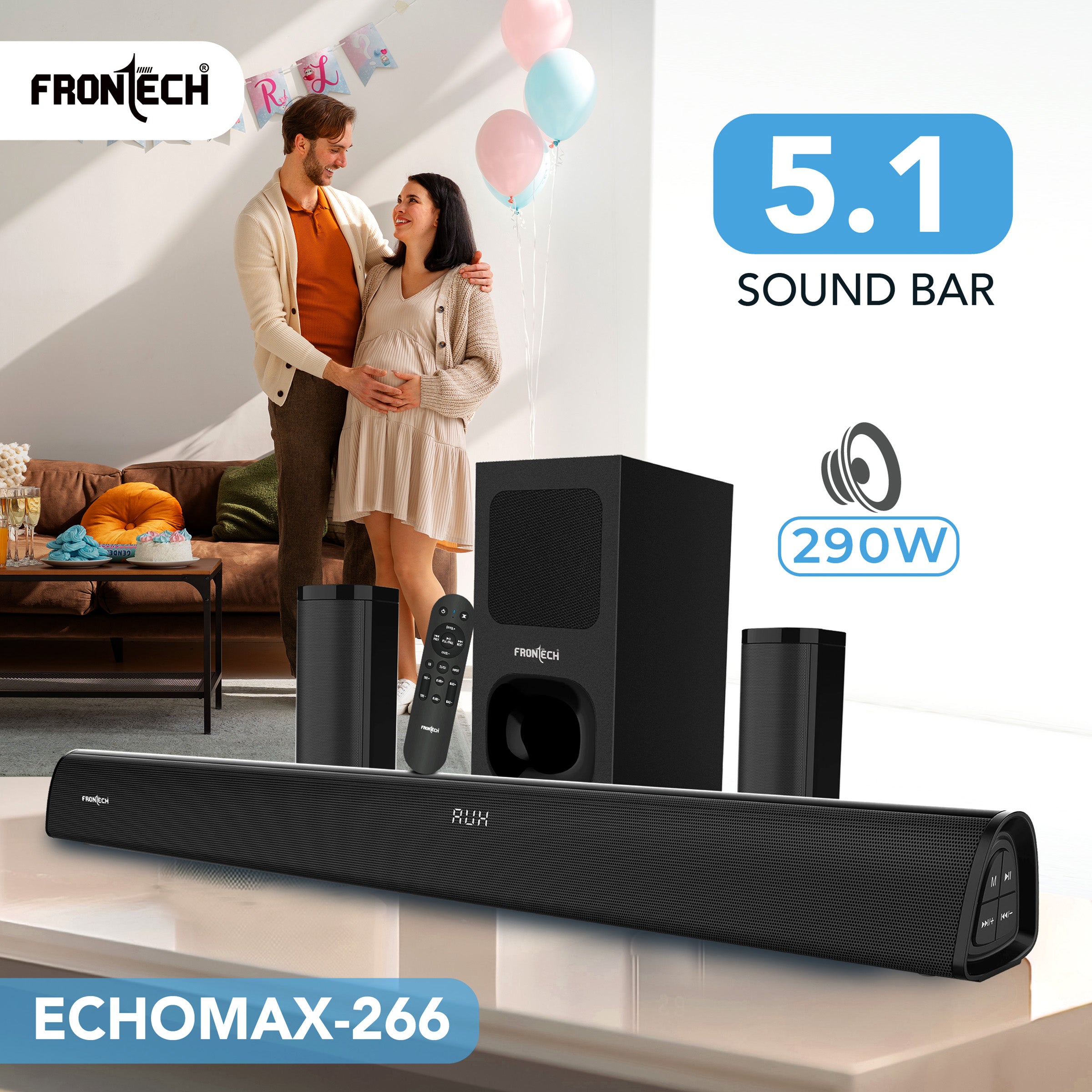 Elevate your home entertainment with the FRONTECH EchoMax-266 5.1 Channel Sound Bar. Delivering 290W of powerful, immersive audio, it features true 5.1 surround sound for movies, music, and gaming. With HDMI, AUX, USB, and Bluetooth connectivity, link your TV, smartphone, or console seamlessly. Compact (900×240×415 mm) and sleek design fits any décor, with remote, AUX cable, and user manual included. Enjoy crystal-clear highs, rich mids, and deep bass. Upgrade to FRONTECH EchoMax-266 for a superior sound and cinematic experience at home.