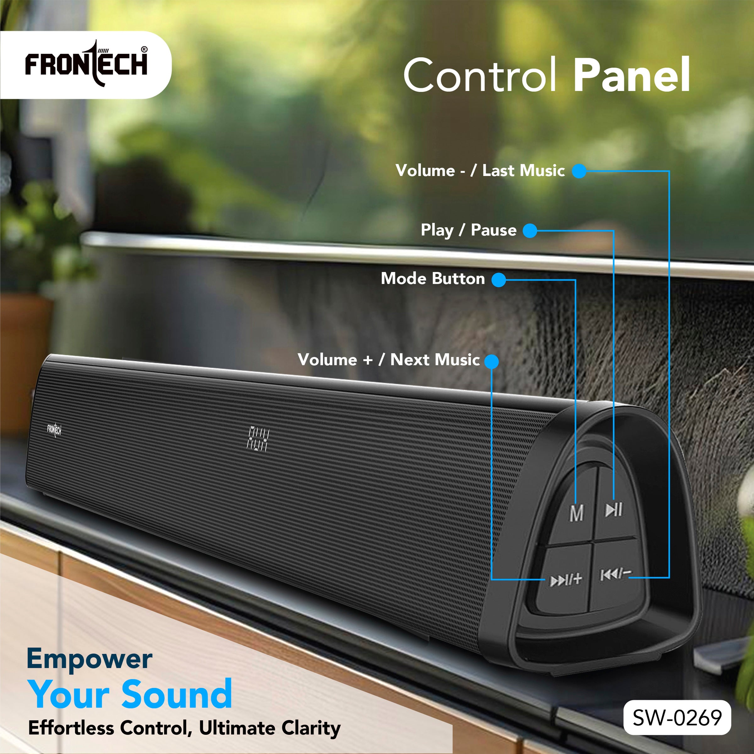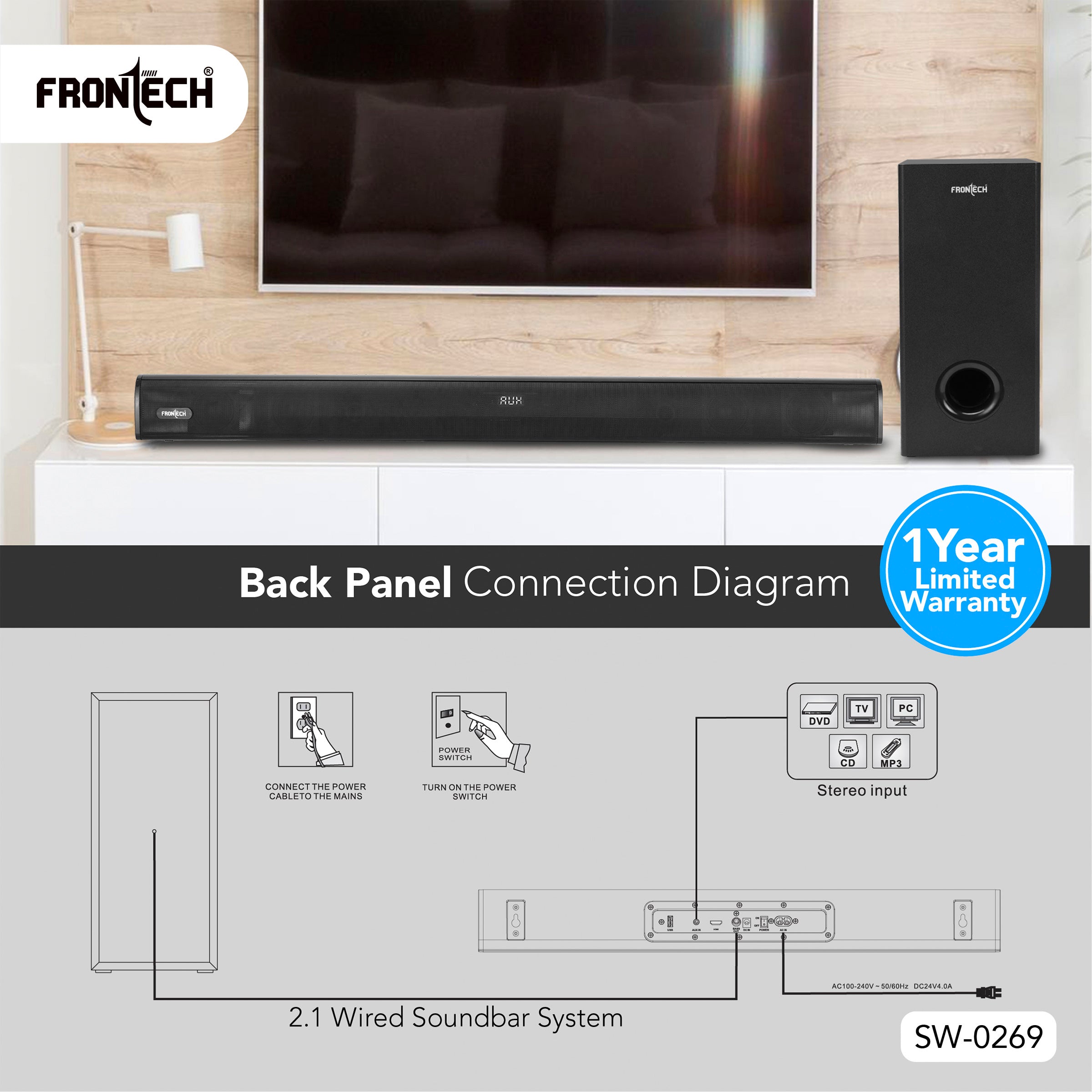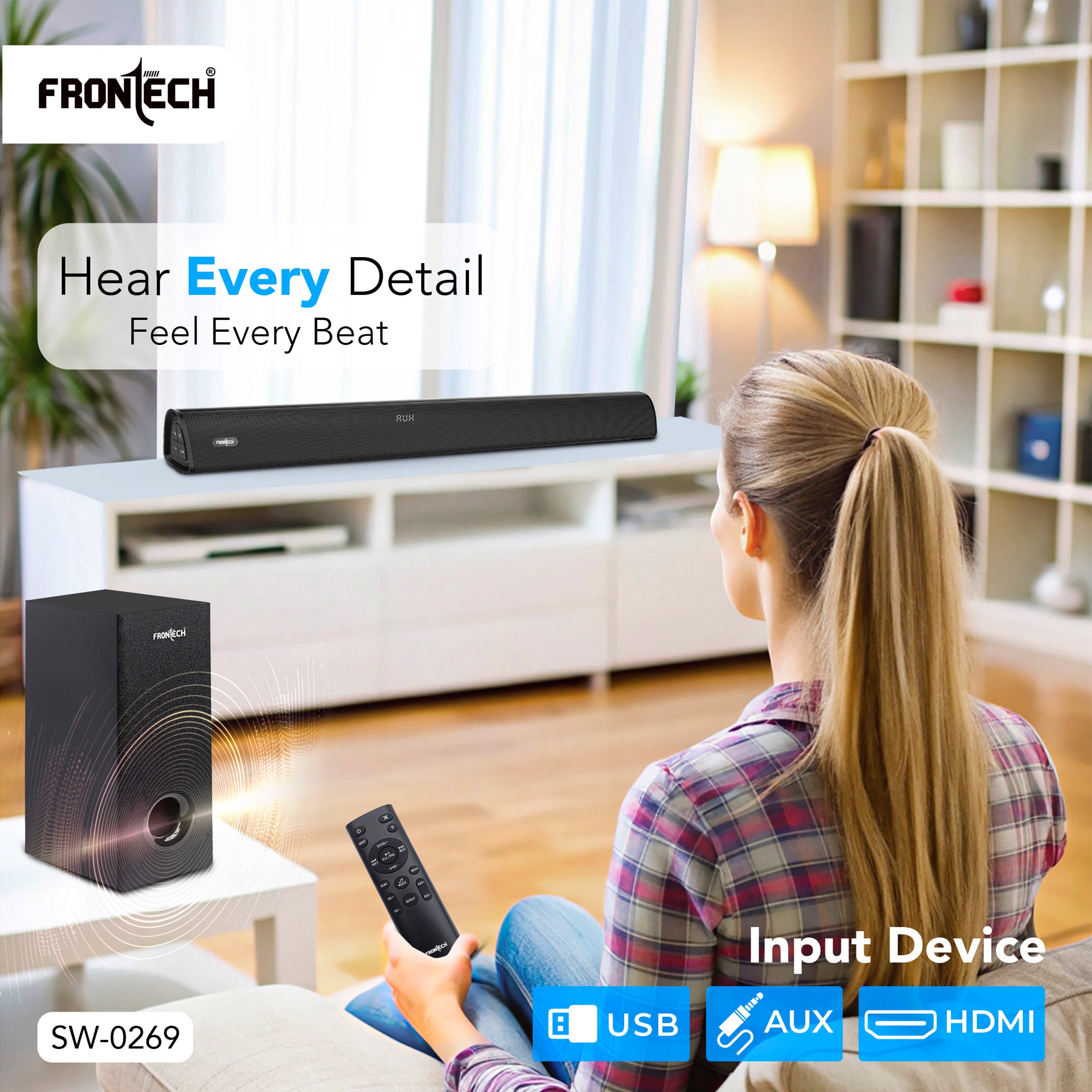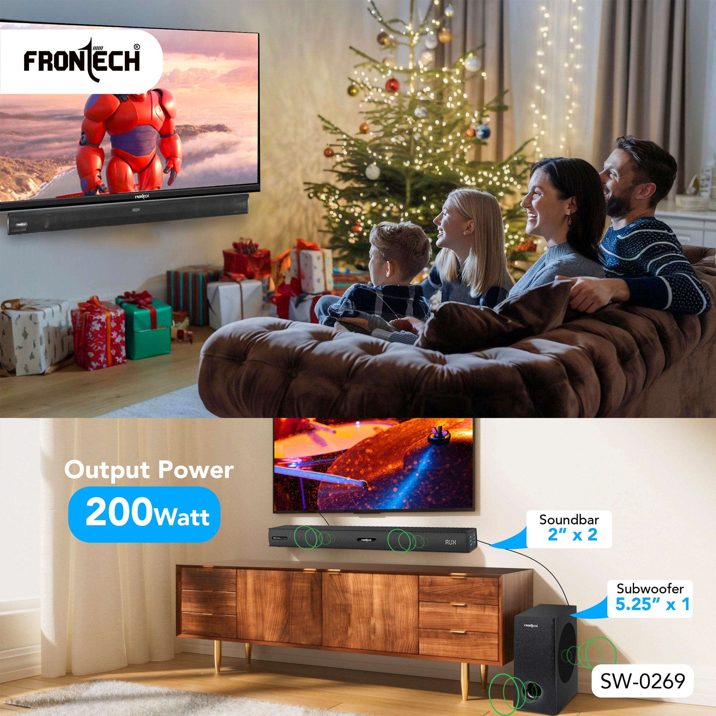 · 200W Powerful Audio : Dual 2" speakers + 5.25" subwoofer for rich, dynamic sound. · Bluetooth 5.3 : Wireless connectivity with a 10-meter range for hassle-free streaming. · Multiple Input Options : USB, AUX, HDMI, and stereo input for versatile device compatibility. · Dedicated Sound Modes : Movie, Music, and News modes for tailored audio experiences. · Easy Control : Includes remote control and intuitive panel buttons (play/pause, volume, mode selection). · Wired 2.1 Setup : Simple installation with power cable, Aux cable, and clear back-panel connections. · 1-Year Warranty : Backed by Frontech’s reliable support (toll-free: 1800 345 4500). In the Box: · 1x Soundbar | 1x Subwoofer | 1x Remote Control · 1x Power Cable | 1x AUX Cable | 1x User Manual