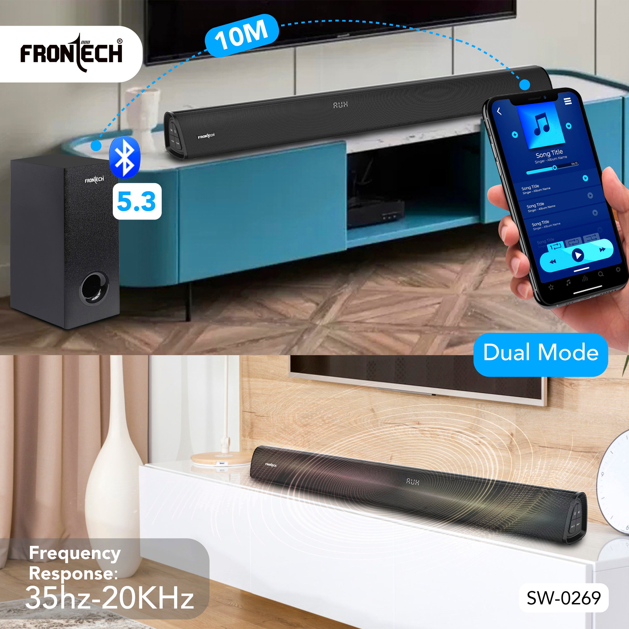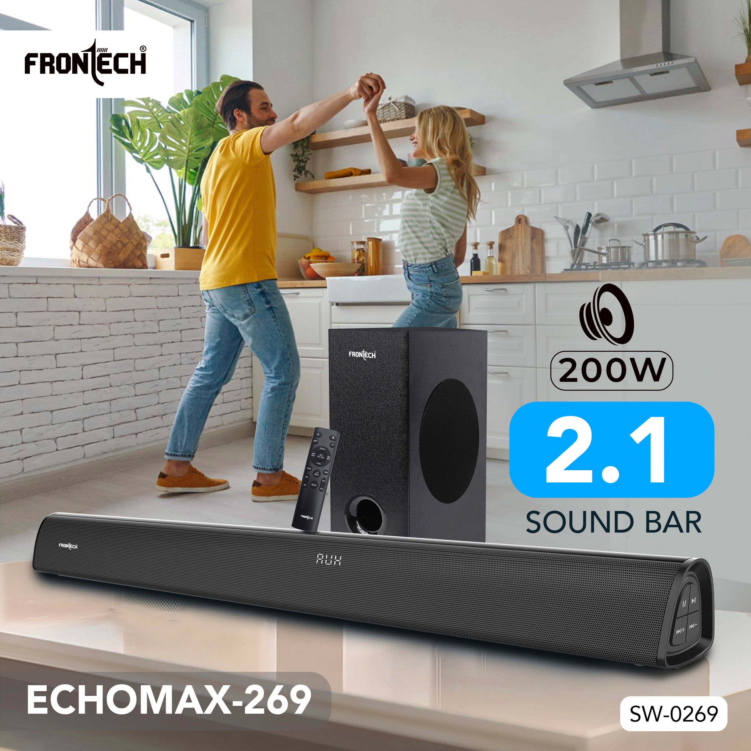 Elevate your audio experience with the Frontech EchoMax-269 2.1 Soundbar, designed to deliver immersive sound quality for movies, music, and more. Boasting a robust 200W output power, this soundbar system features dual 2" speakers and a 5.25" subwoofer for deep, punchy bass. With Bluetooth 5.3 compatibility, enjoy seamless wireless streaming from your devices up to 10 meters away. The soundbar supports multiple inputs, including USB, AUX, and HDMI, ensuring versatility for all your entertainment needs. Effortlessly control your sound with the included remote or the intuitive panel buttons, and switch between Movie, Music, and News modes for optimised audio. Sleek, powerful, and easy to set up, the EchoMax-269 is your gateway to cinematic sound at home.