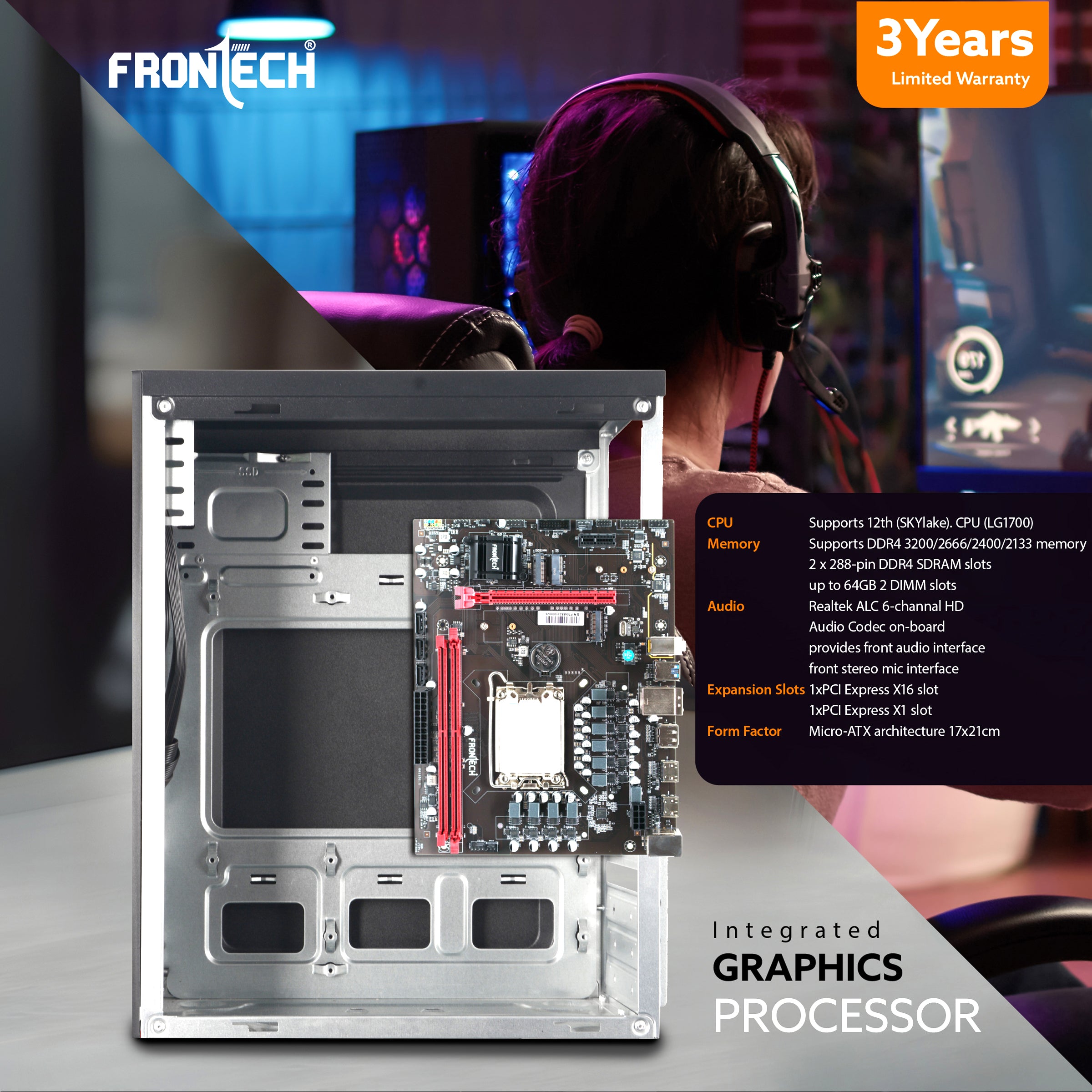 Form Factor: Compact Micro-ATX design (17x21 cm).