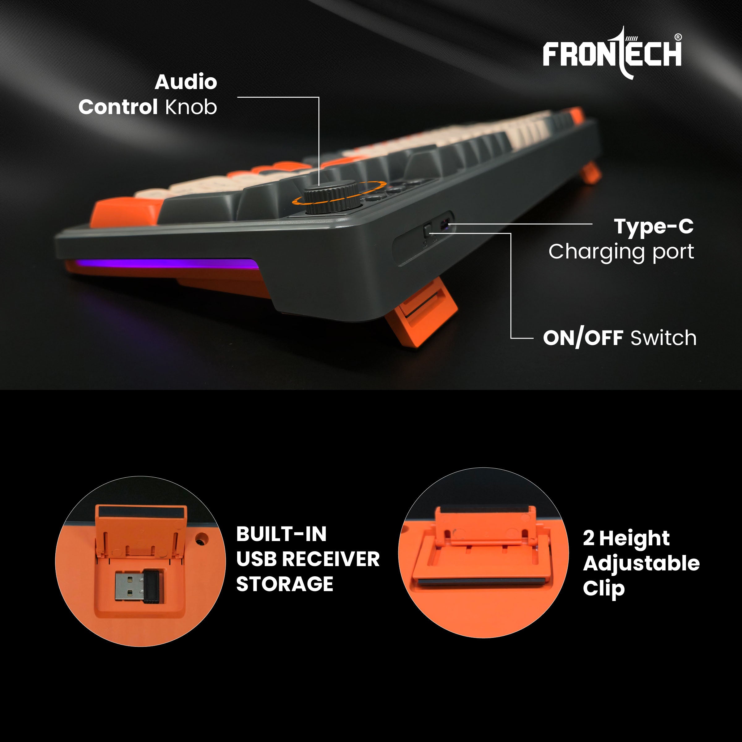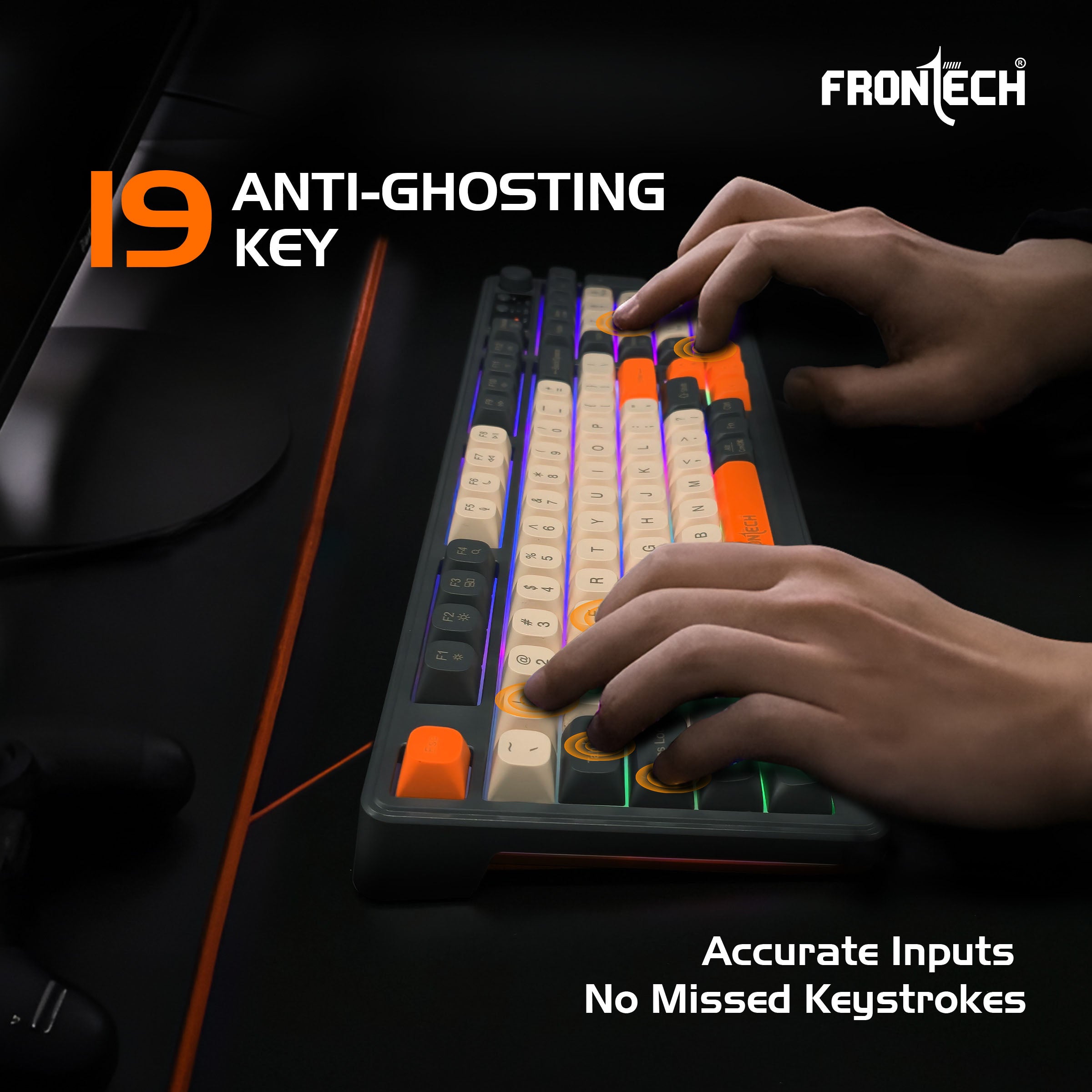 The Frontech KB-0026P Wireless Gaming Keyboard delivers smooth performance with dual wireless connectivity and a compact 98-key layout for gaming and daily use. Its rainbow backlight, ergonomic design, and anti-ghosting keys provide comfort and precision across multiple devices. Powered by a 2000mAh rechargeable battery with Type-C charging, it offers reliable performance and durability with a 1 Year Warranty