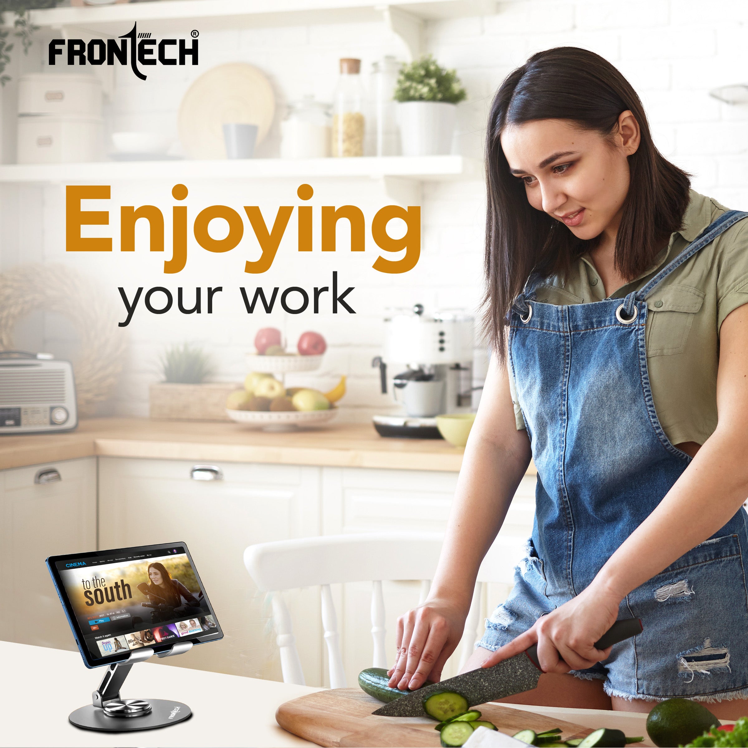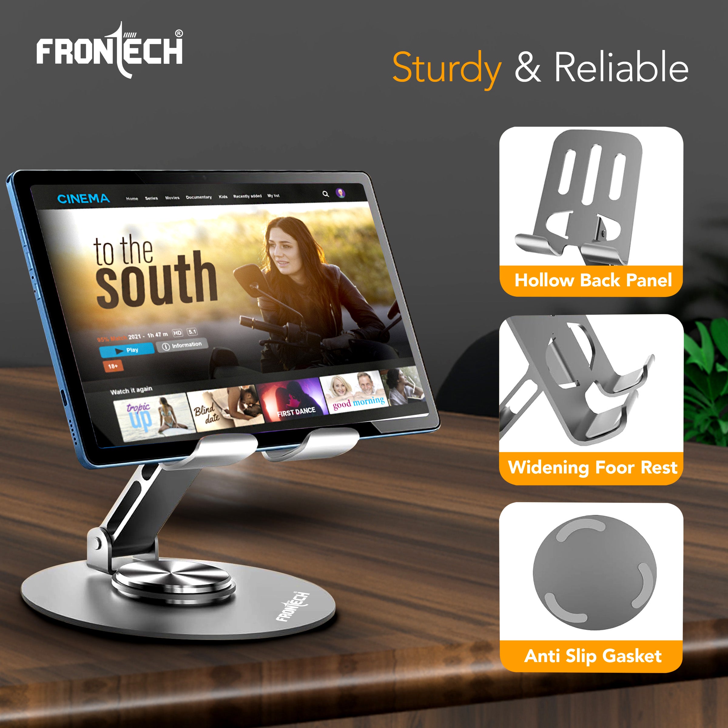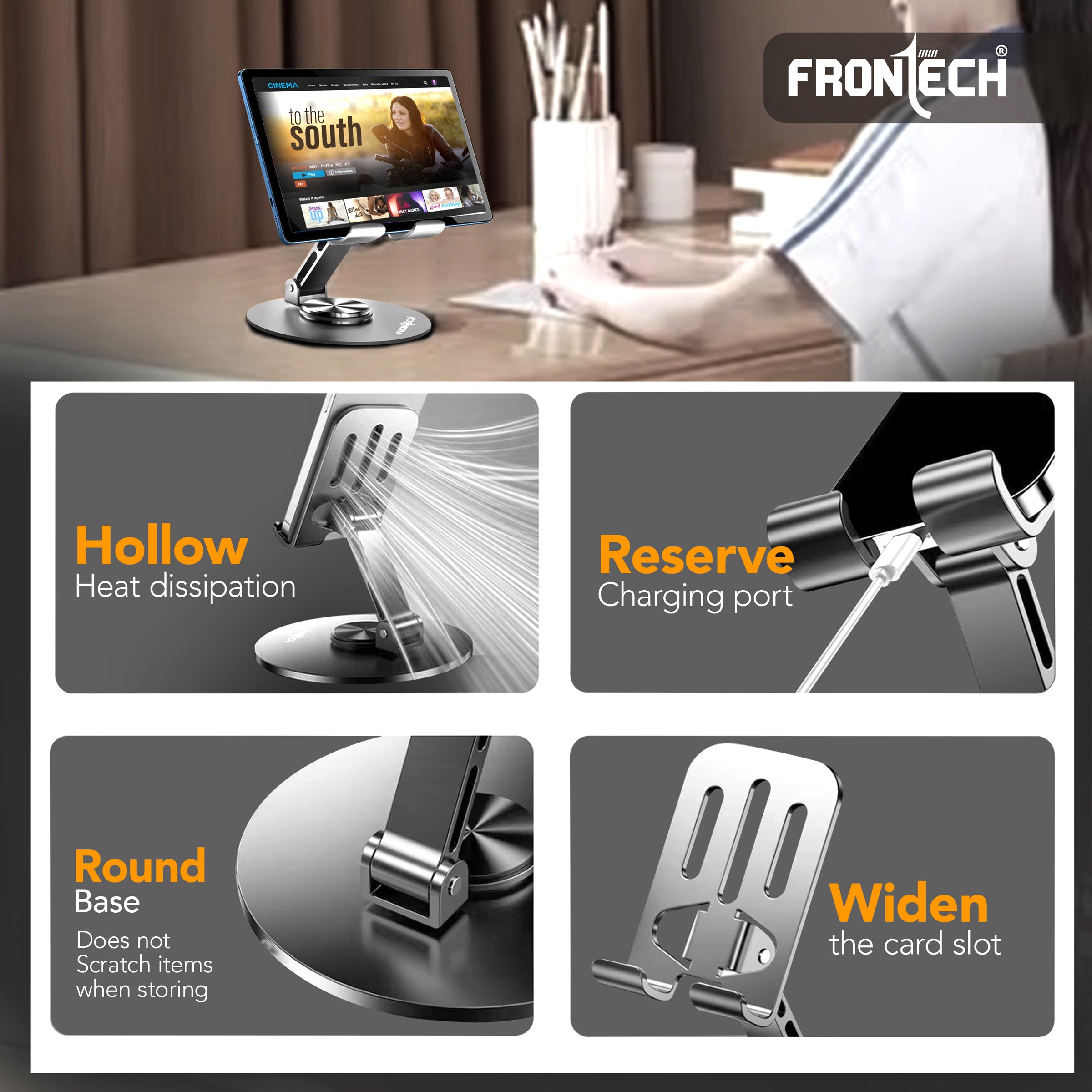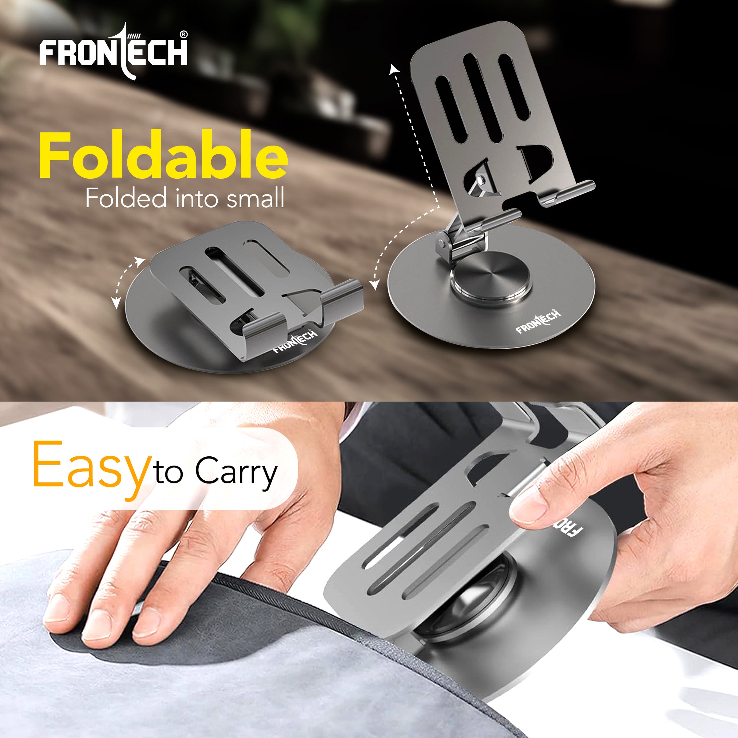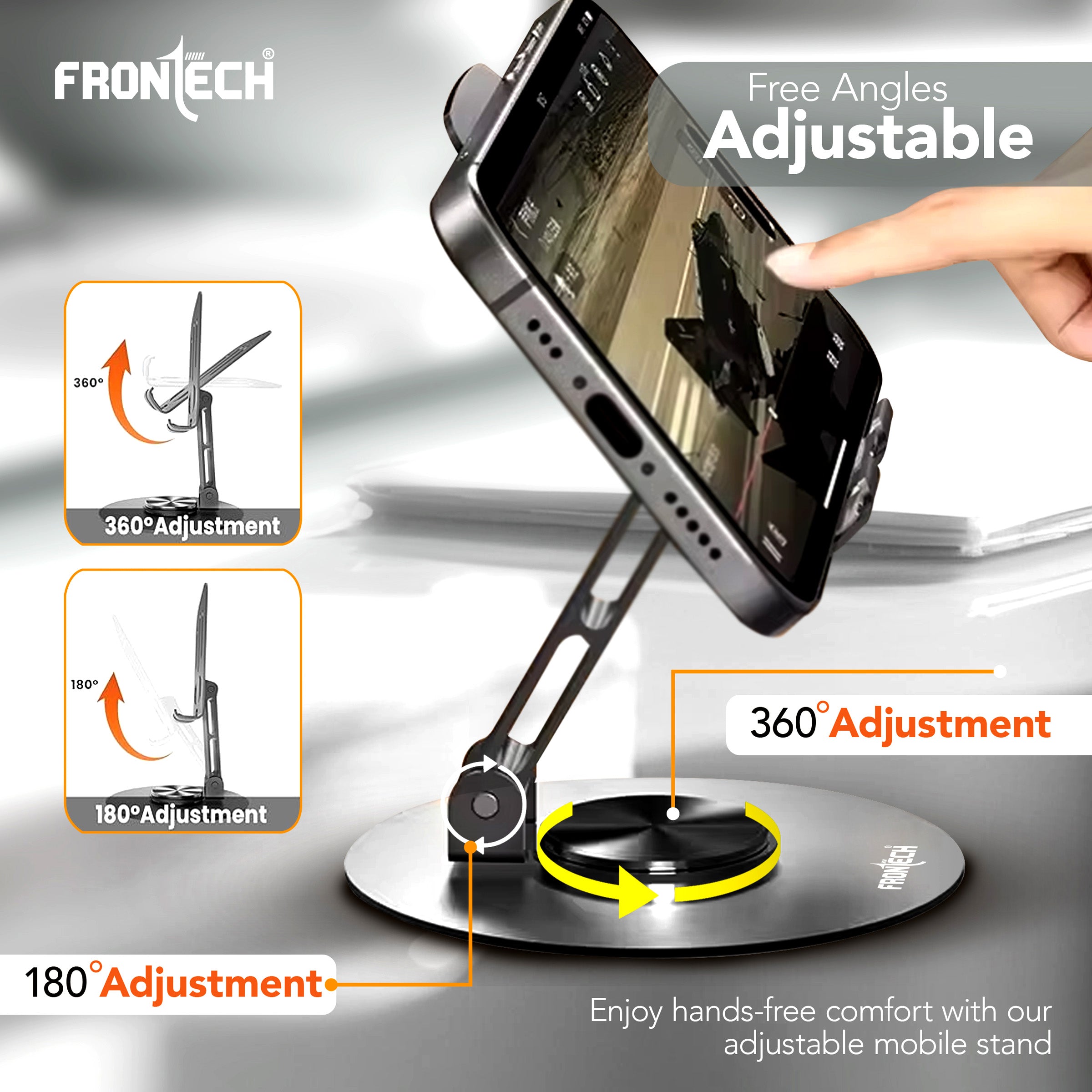 The FRONTECH Mobile Holder is a sturdy and versatile desk stand designed for ultimate hands-free convenience. With full 360° rotation and 180° tilt, it securely holds all phones, tablets, and game consoles, while its foldable, metal body and thoughtful features like a charging port and heat dissipation make it perfect for both work and entertainment on the go.