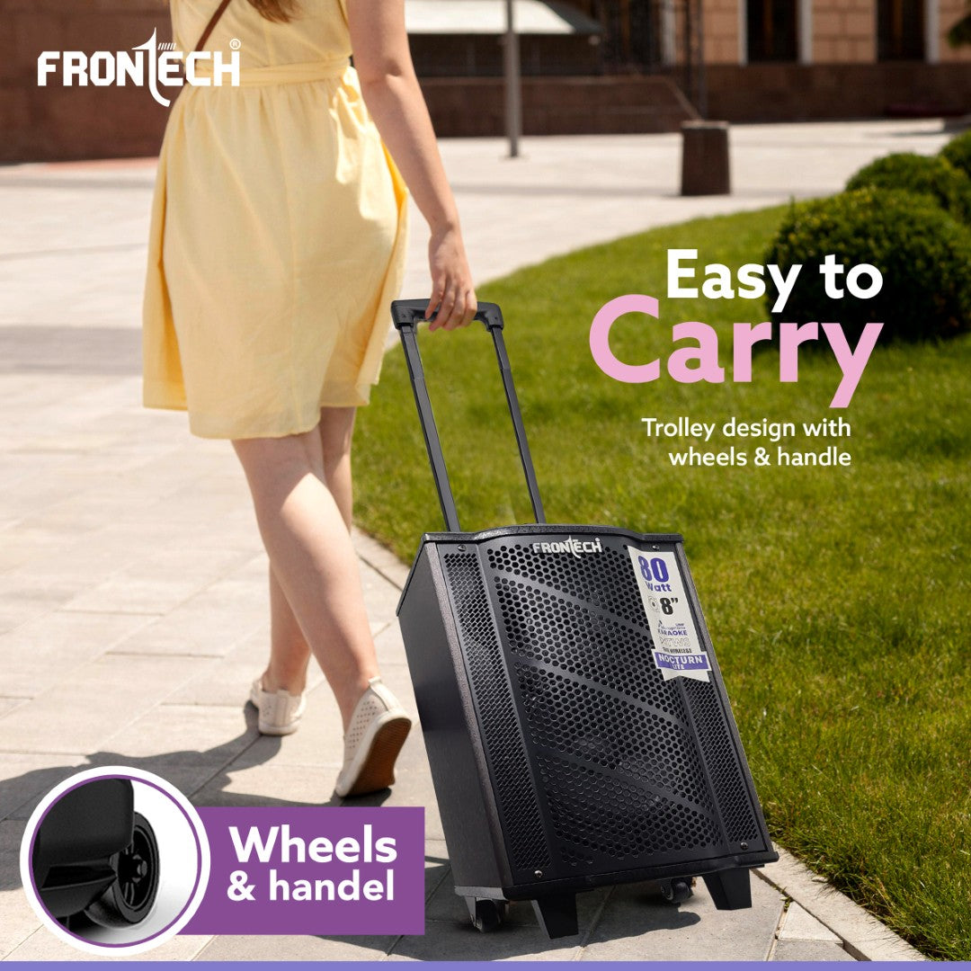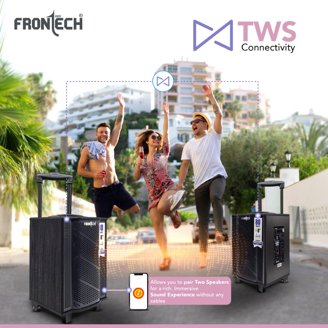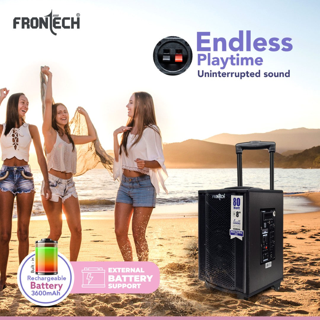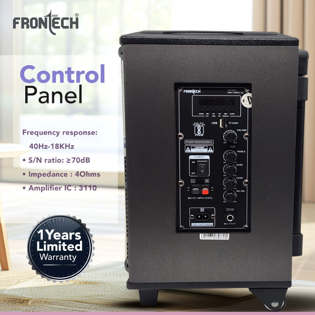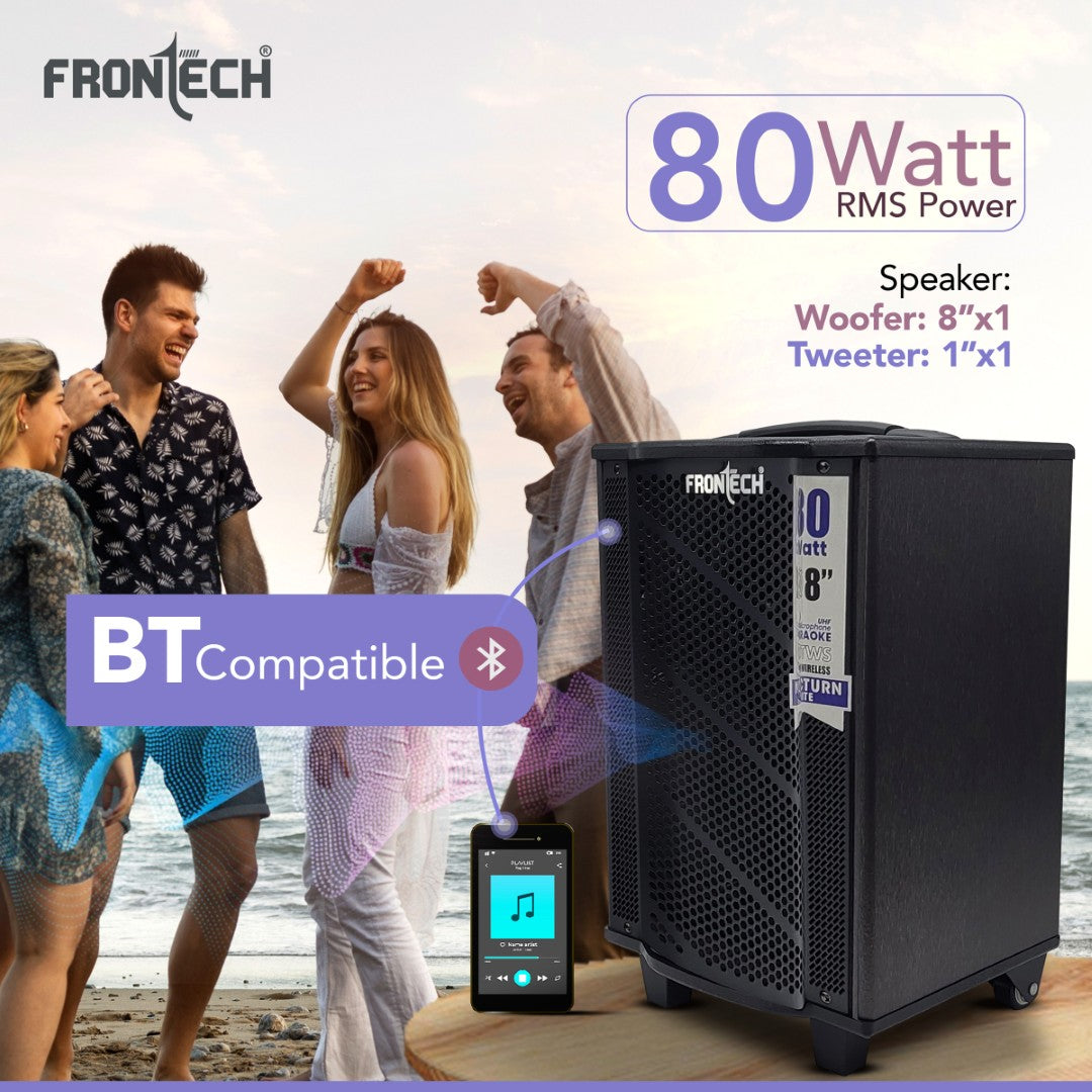Immersive Audio Experience Delivers an impressive 80W RMS output. Provides dynamic and powerful sound for various environments. Comprehensive Input Options Supports multiple input sources: USB TF Card Bluetooth TWS (True Wireless Stereo) FM Radio AUX Input Microphone and Guitar Inputs High-Quality Sound Output Features an 8" woofer for deep bass. Includes a 1" tweeter for clear high-frequency notes. Offers a wide frequency range from 40Hz to 18KHz . Wireless Karaoke and Public Speaking Comes with UHF wireless microphones for ease of use. Portable and Battery-Powered Equipped with a 3600 mAh rechargeable battery for extended playtime. Ideal for outdoor events without constant power needs. Enhanced Audio Performance Features a 3110 amplifier IC to minimize distortion and ensure clear sound even at high volumes. Sturdy and Durable Design Built with robust materials for long-term use. Compact dimensions: 27.5 cm x 25 cm x 38.5 cm . Lightweight and portable at 7.2 kg . Versatile Applications Perfect for parties, events, home entertainment, karaoke, or public speaking. Warranty and Peace of Mind Includes a 1-year limited warranty for added assurance.