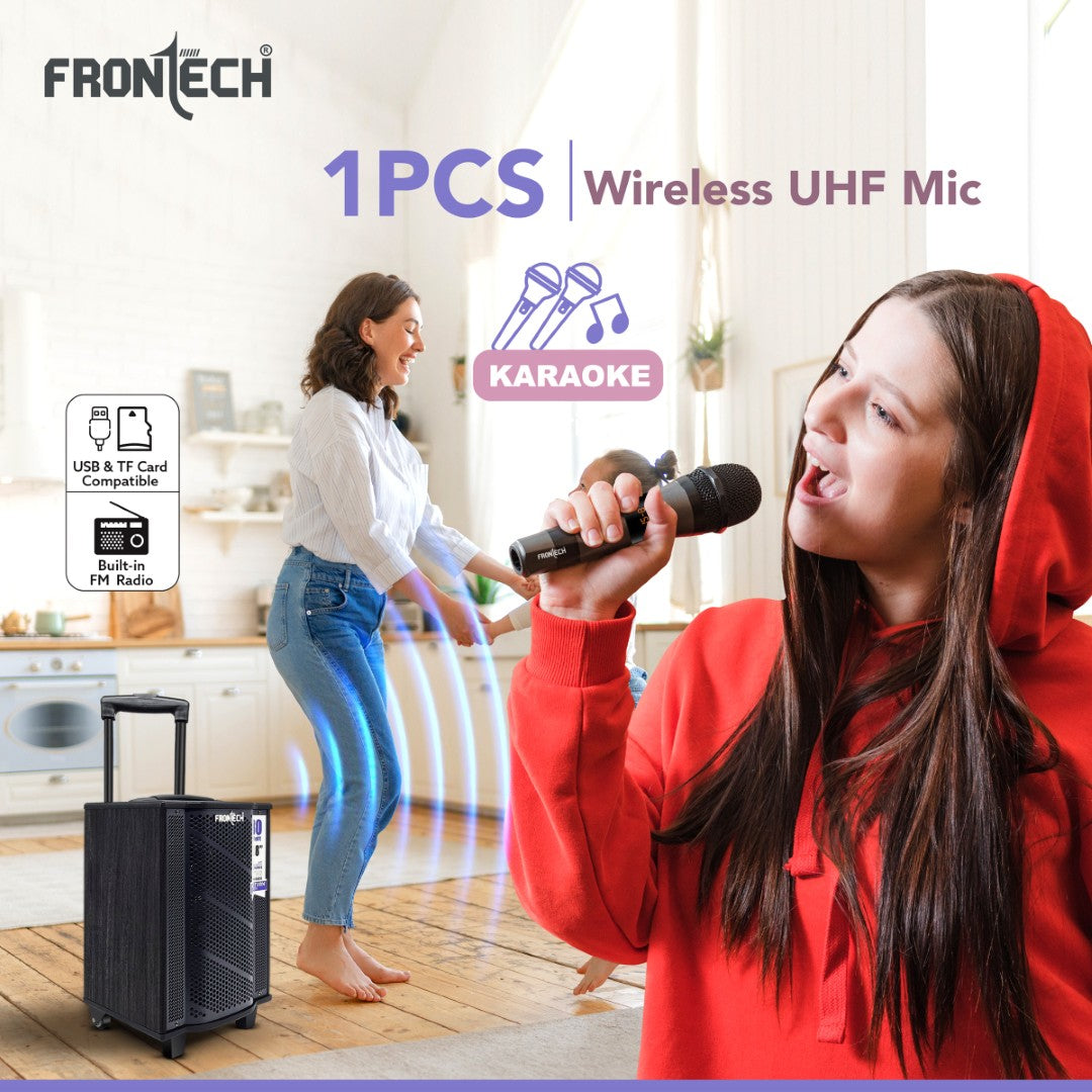 Provides a loud, powerful sound suitable for indoor and outdoor events. Supports USB, TF, Bluetooth, FM, AUX, MIC, and Guitar inputs for diverse audio sources. UHF wireless microphones for convenient, hands-free speaking or karaoke. Built-in rechargeable 3600 mAh battery allows for extended playtime without a constant power supply. Equipped with a 3110 amplifier IC for enhanced sound quality and low distortion.