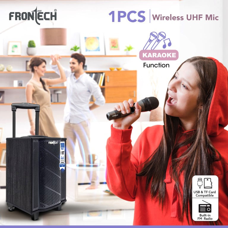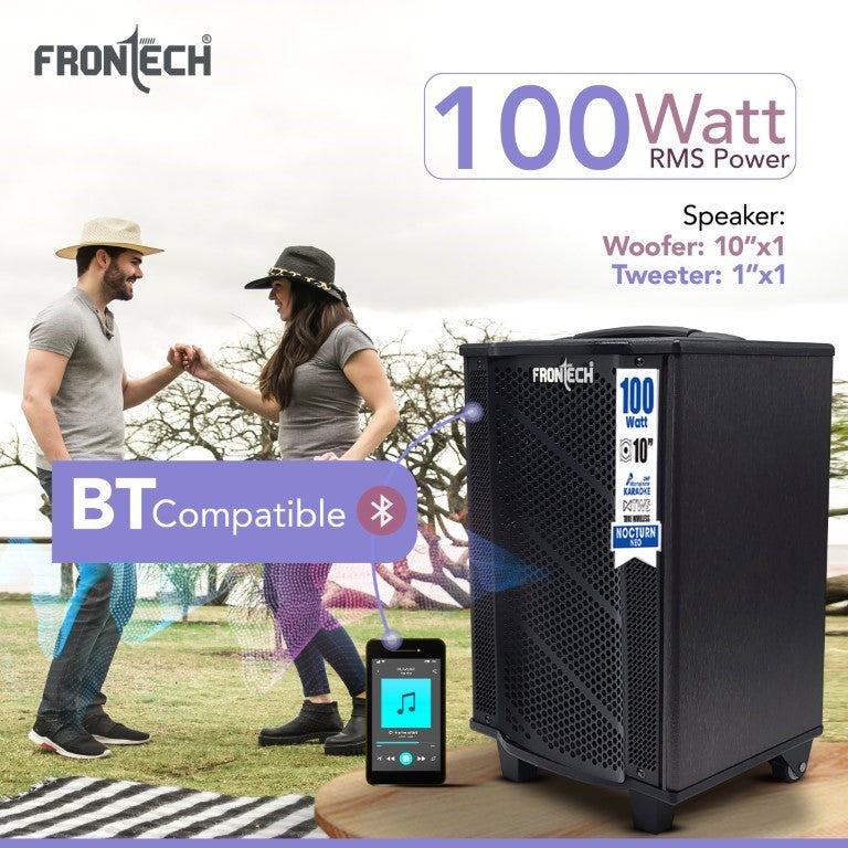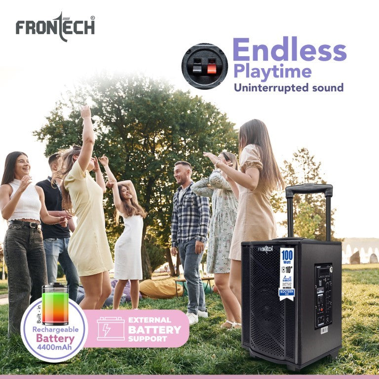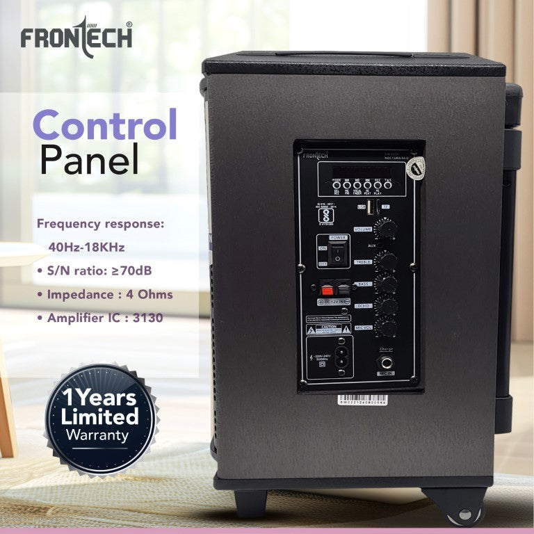 Powerful Sound Output : Provides 100W RMS output for an immersive audio experience with clear and dynamic sound, suitable for a variety of events. Multiple Input Options : USB : Direct playback from USB drives. TF Card : Supports TF card input for flexible audio playback. Bluetooth : Wireless streaming from Bluetooth-enabled devices for easy, cord-free use. TWS (True Wireless Stereo) : Connect two speakers wirelessly to create a stereo effect. FM Radio : Built-in FM radio for easy access to local radio stations. AUX Input : Connects to external devices via a 3.5mm AUX cable. Microphone and Guitar Inputs : Ideal for karaoke, public speaking, or live instrument performances with dedicated inputs. High-Quality Sound Components : Woofer and Tweeter : Features a 10-inch woofer for deep bass and a 1-inch tweeter for clear highs, covering a frequency range of 40Hz to 18KHz. Karaoke-Friendly : Comes with two UHF wireless microphones, making it easy to host karaoke sessions or public speaking events. Long-Lasting Battery : Equipped with a 4400 mAh rechargeable battery for extended playtime, making it convenient for outdoor events without frequent recharging. Durable Amplifier IC : Features a 3130 amplifier IC to boost sound quality and minimize distortion, ensuring clear, powerful audio even at high volumes. Sturdy, Portable Design : Constructed with a durable build, measuring 34cm x 27cm x 48cm and weighing 10.25 kg, making it compact and easy to transport. Warranty : Comes with a 1-year limited warranty, providing users with added confidence in their purchase.