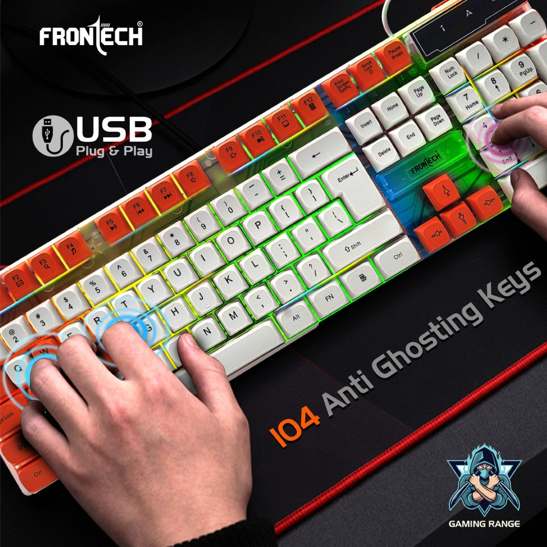 Keyboard Features: Full 104-key layout for gaming and everyday use. Ergonomic design ensures comfortable use during long sessions. 1.2-meter cable allows flexible placement on your desk. Stunning rainbow backlight effect for an immersive experience. USB Plug & Play functionality for easy setup. Compatible with Windows XP, 2000, ME, VISTA, 7, 8, and 10. Stylish white and orange color scheme.