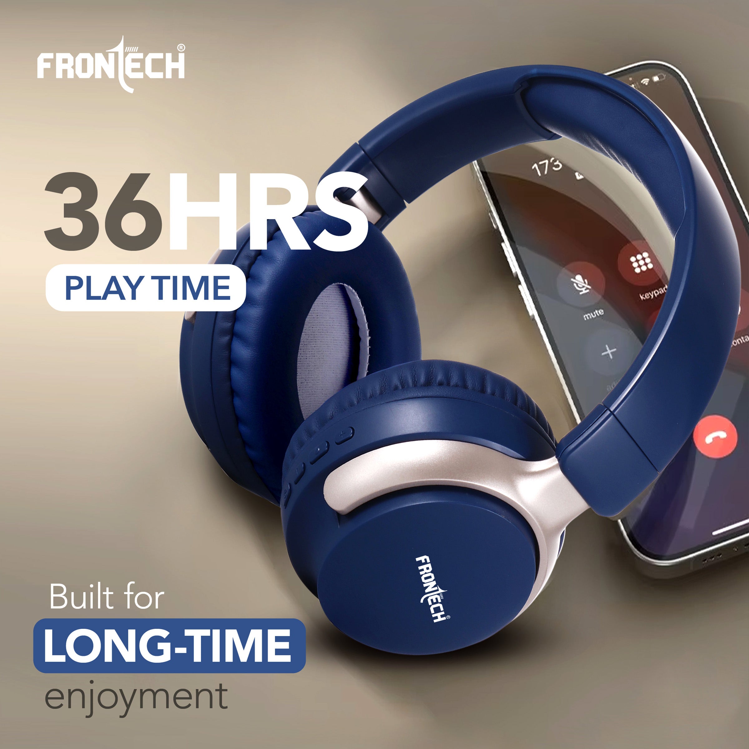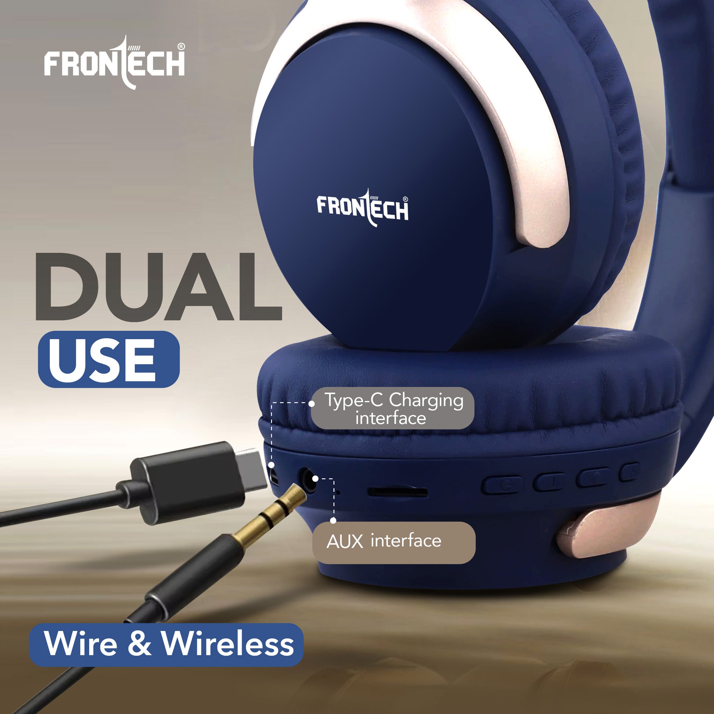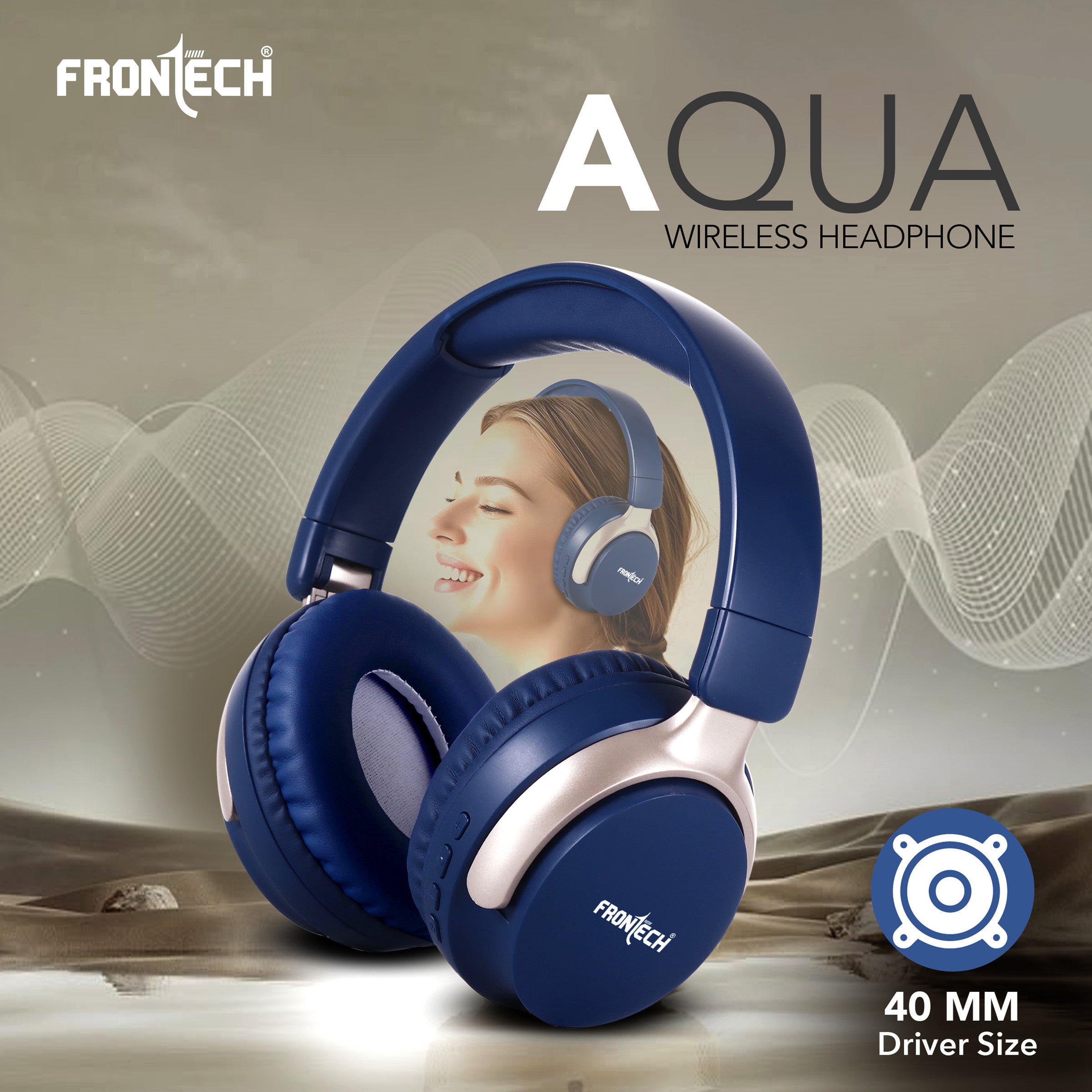 · Brand: FRONTECH · Model: AQUA Wireless Headphone (implied) · Connectivity: Bluetooth 5.1+BR+EDR, 10m wireless range · Battery Life: Up to 36 hours playback · Charging: 2 hours via Type-C · Audio: 40MM drivers, 20Hz-18KHz frequency response, 101±5db sensitivity · Versatility: Dual wired (AUX) and wireless use · Controls: Intuitive on-ear controls for power, volume, track skipping, and calls · Design: Over-ear, comfortable for long-time enjoyment, dark blue with light gold/champagne accents.
