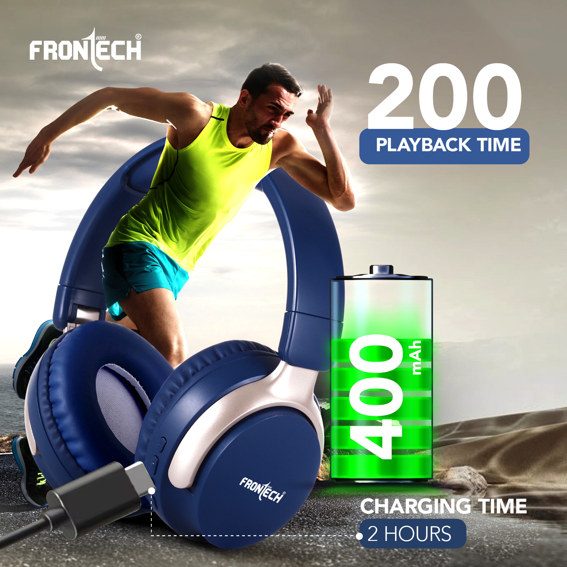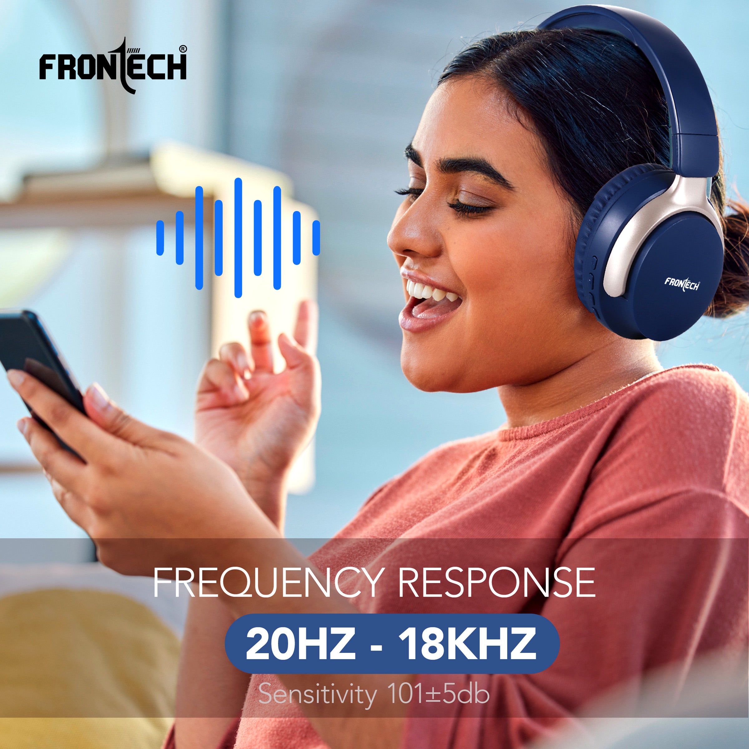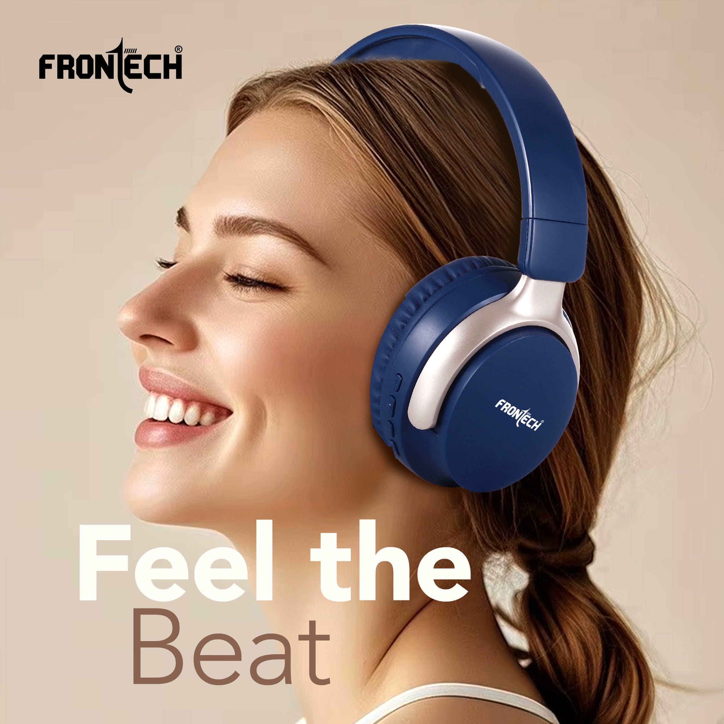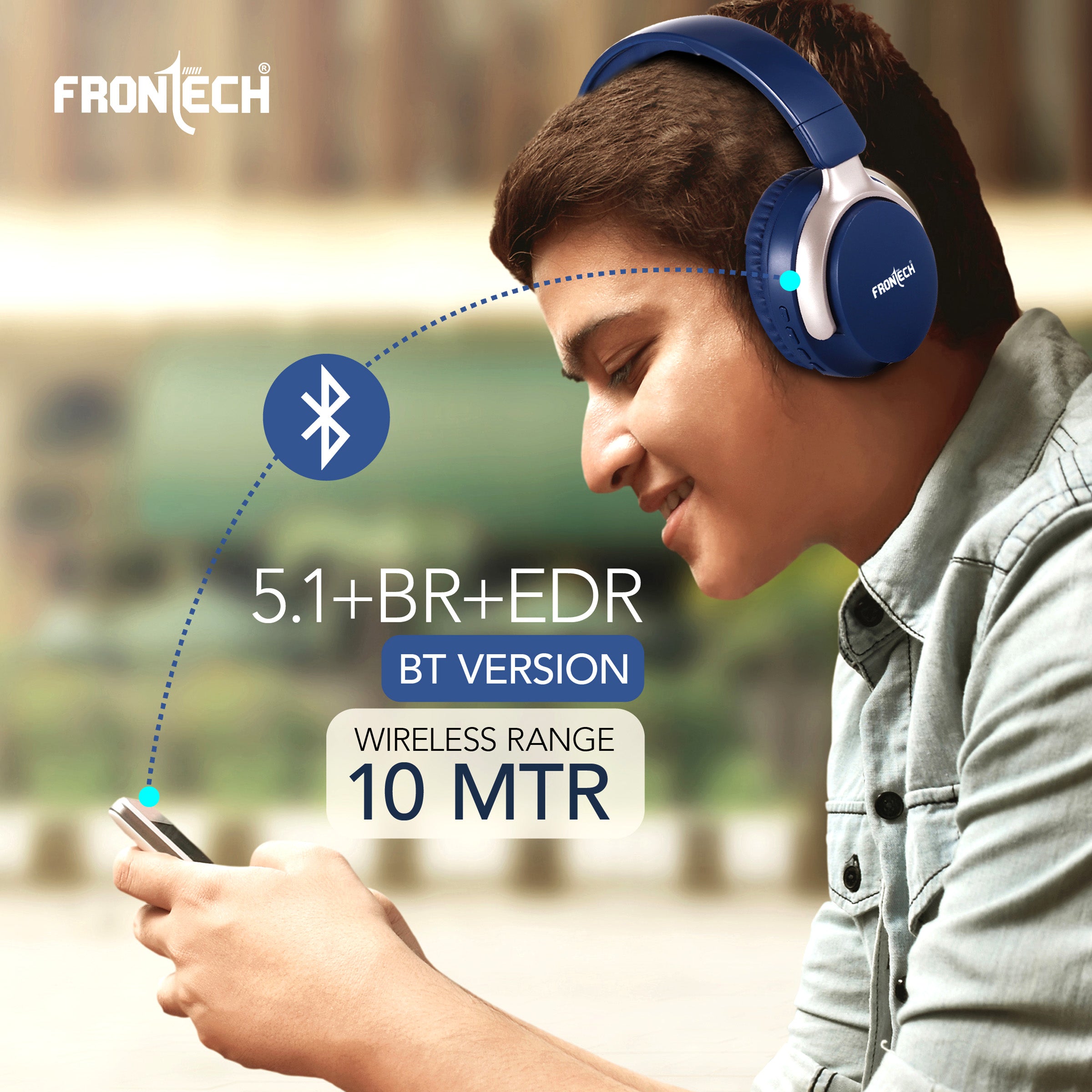 · Brand: FRONTECH · Model: AQUA Wireless Headphone (implied) · Connectivity: Bluetooth 5.1+BR+EDR, 10m wireless range · Battery Life: Up to 36 hours playback · Charging: 2 hours via Type-C · Audio: 40MM drivers, 20Hz-18KHz frequency response, 101±5db sensitivity · Versatility: Dual wired (AUX) and wireless use · Controls: Intuitive on-ear controls for power, volume, track skipping, and calls · Design: Over-ear, comfortable for long-time enjoyment, dark blue with light gold/champagne accents.