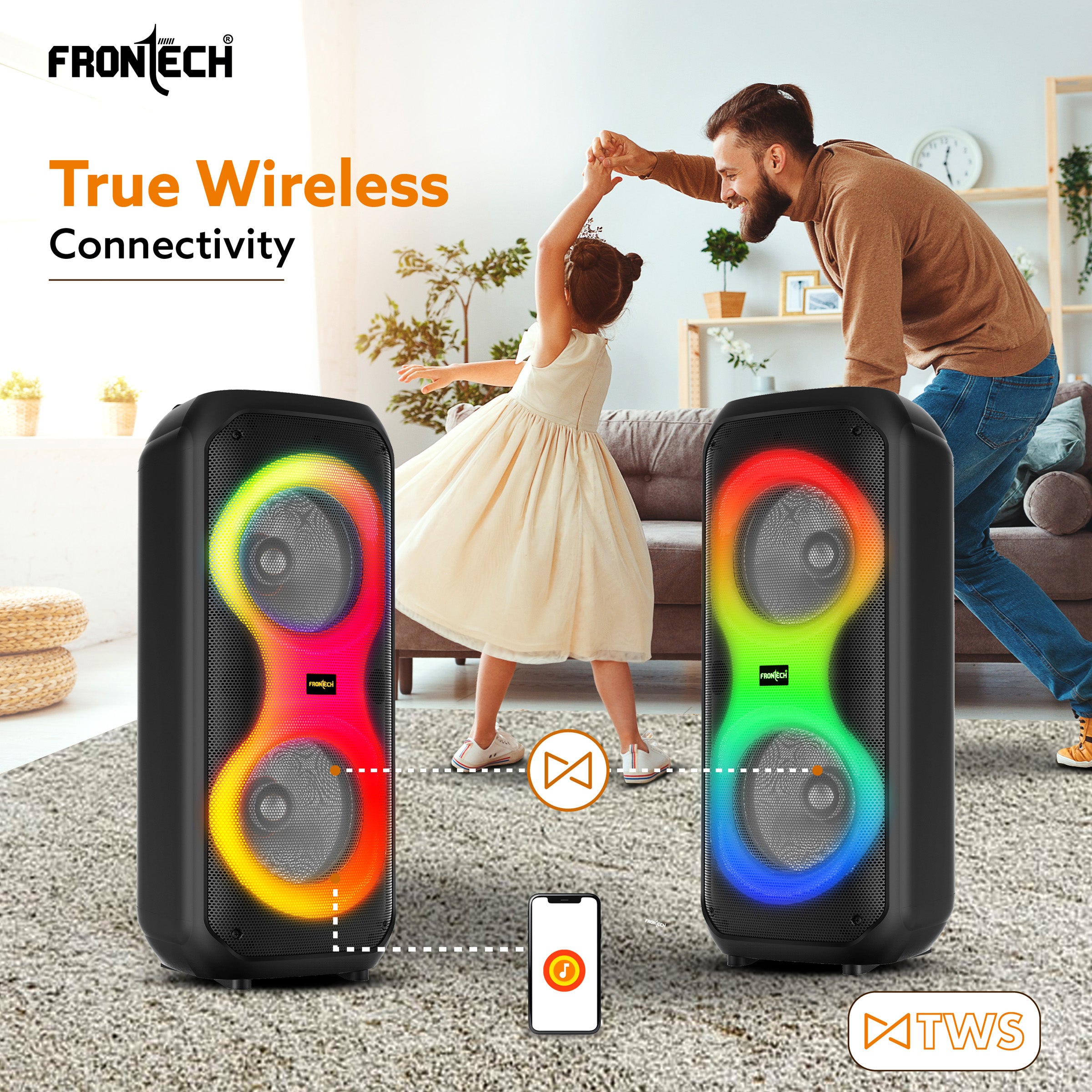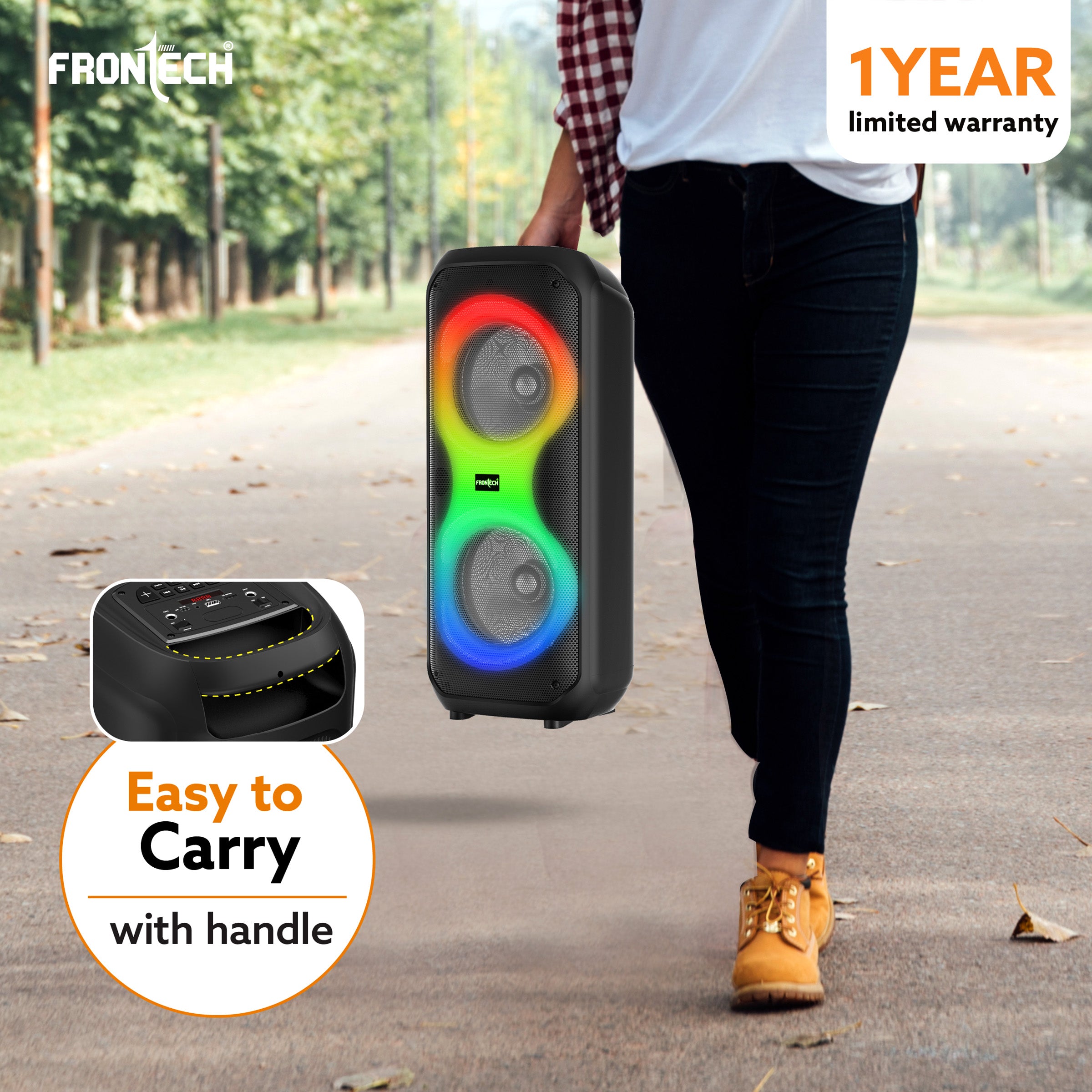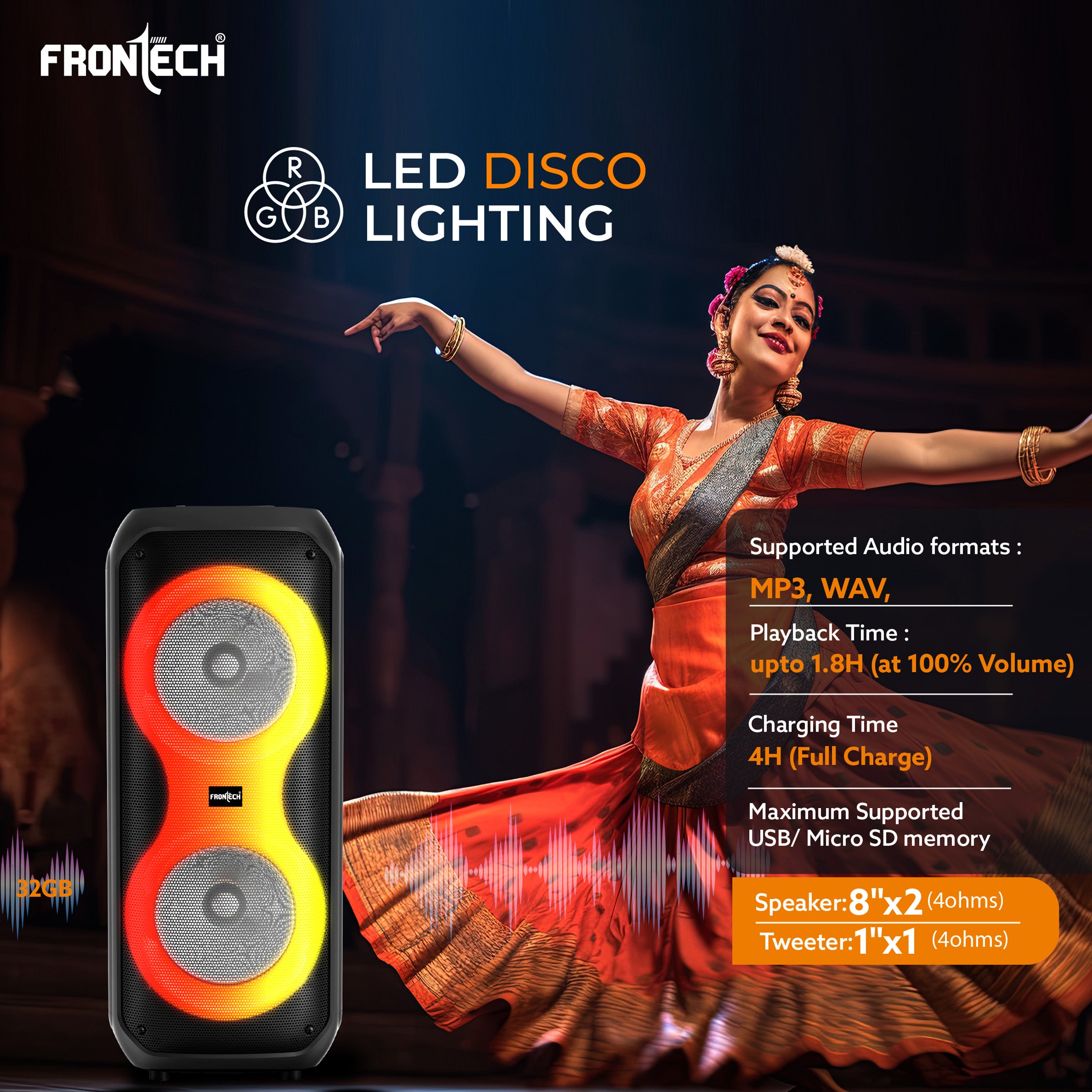 FRONTECH Smash Pro-21P (SW-0021P) is a 45W multimedia trolley speaker with karaoke support, featuring dual 8" woofers and a 1" tweeter. It offers vibrant RGB disco lighting and multiple connectivity options including Bluetooth 5.0, TWS, USB, TF, AUX, and FM radio (87.5–108 MHz). Supporting MP3 and WAV formats with up to 32GB memory, it includes a wireless mic and supports 2 wired mics. Powered by a 3.7V 3600mAh battery, it provides up to 1.8 hours of playback at full volume and charges in 4 hours via Type-C. Compact and portable with a carry handle, it comes with all essential accessories and a 1-year warranty.