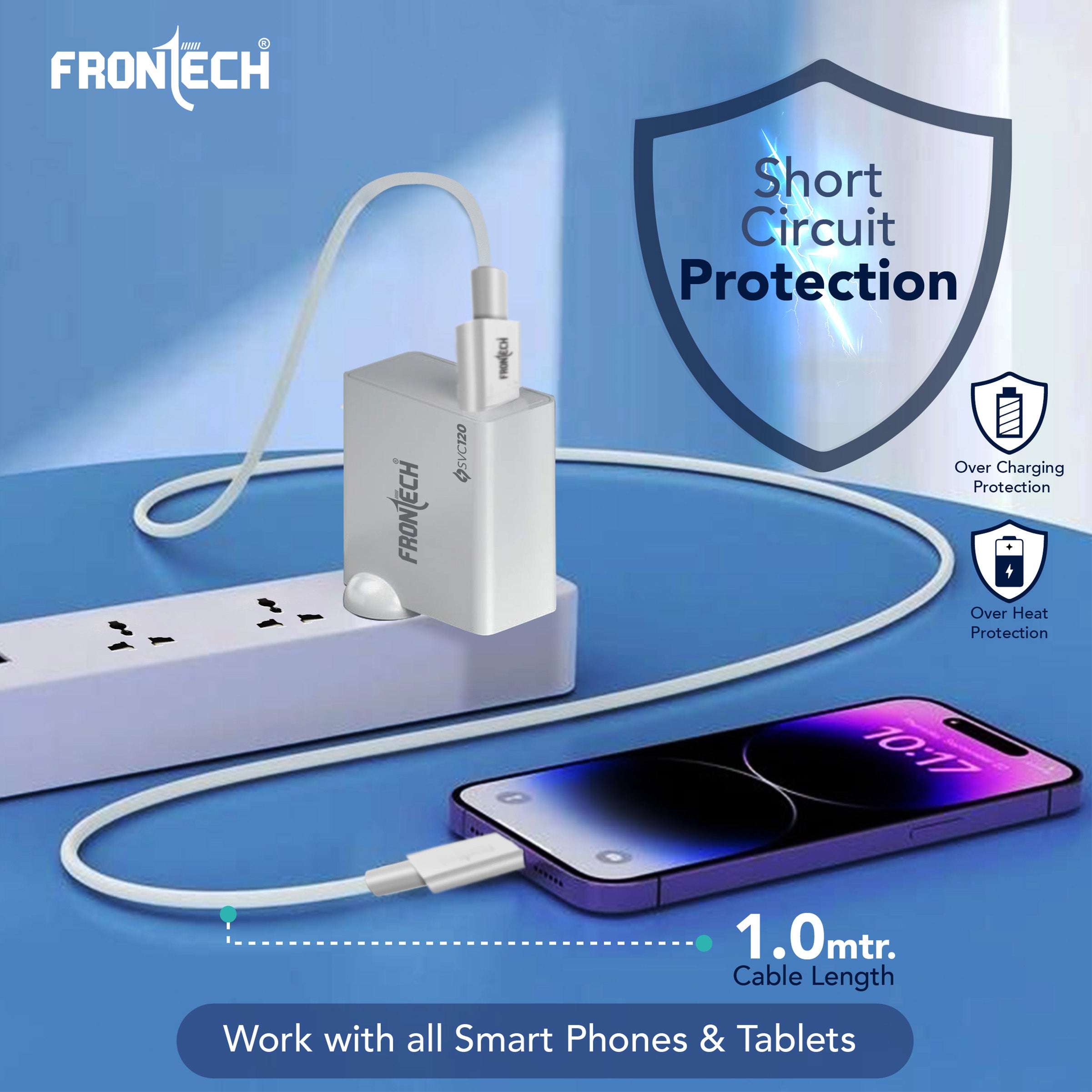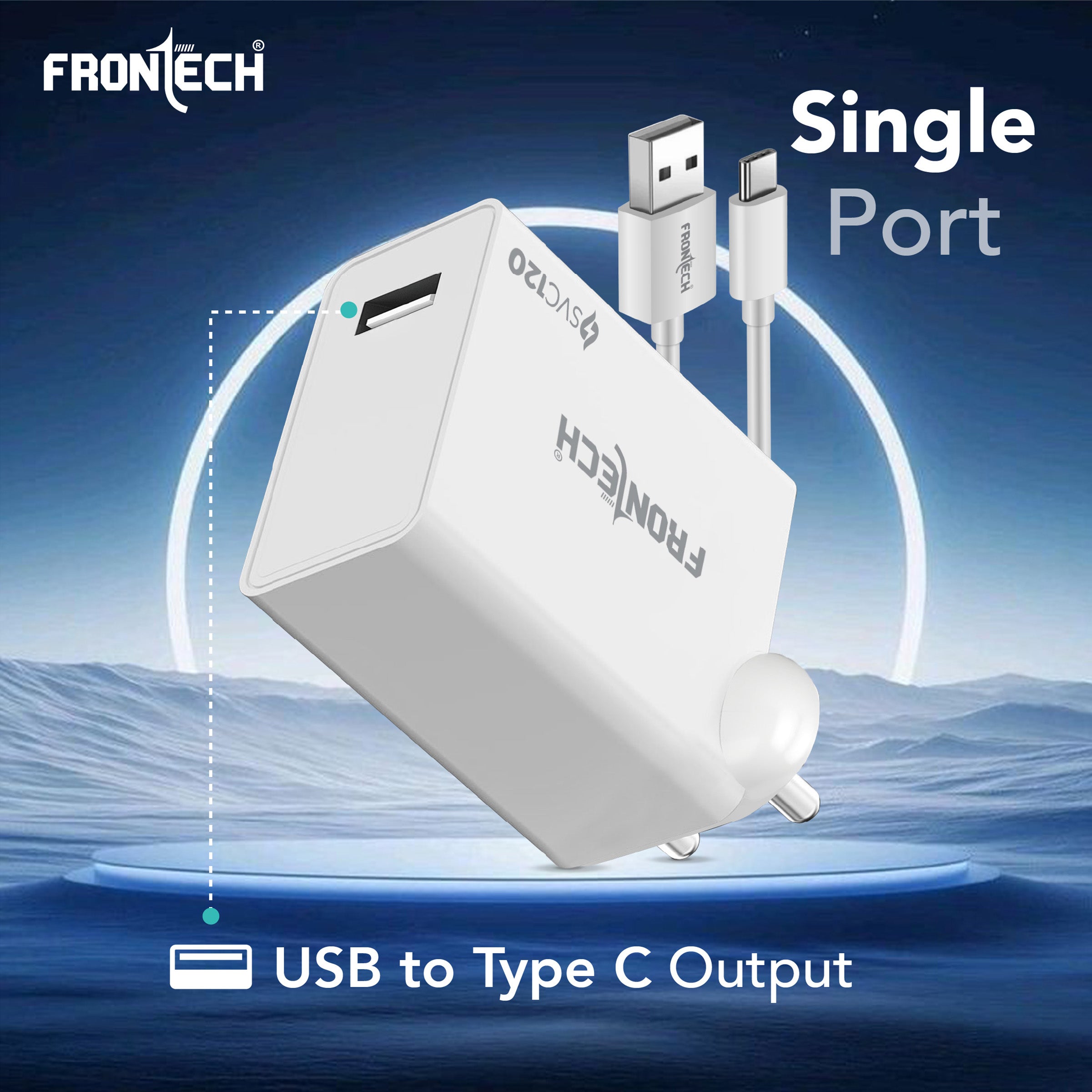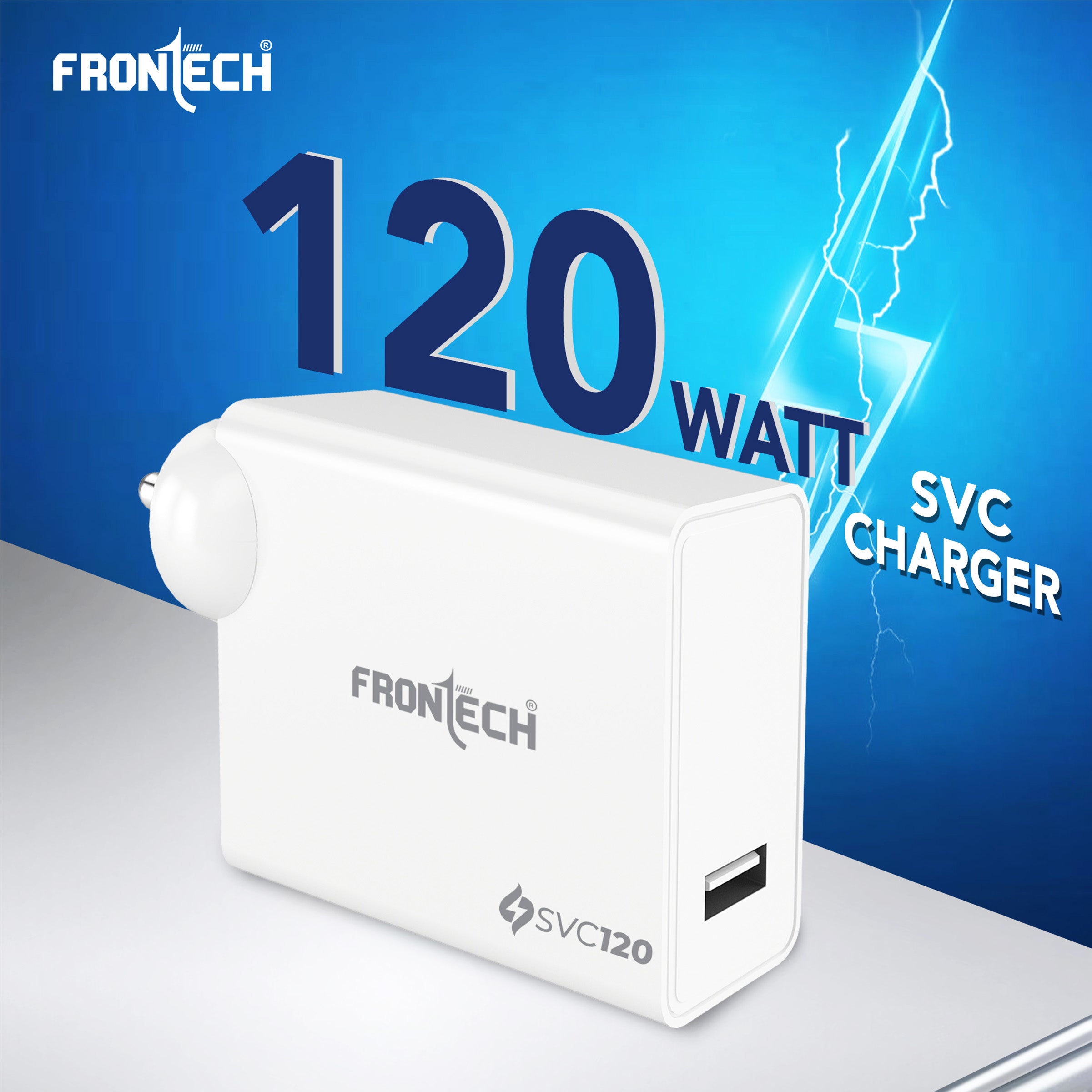 The FRONTECH SVC 120 (MCH-0024) is a powerful 120W single-port mobile charger with a USB-A to type C. It features an integrated smart chip and provides essential safety features like Short Circuit, Over Charging, and Over Heat Protection. This lightweight charger offers wide compatibility for smartphones, tablets, earbuds, and power banks. It operates on a universal 100–265V AC input and includes a 1.0-meter USB cable.