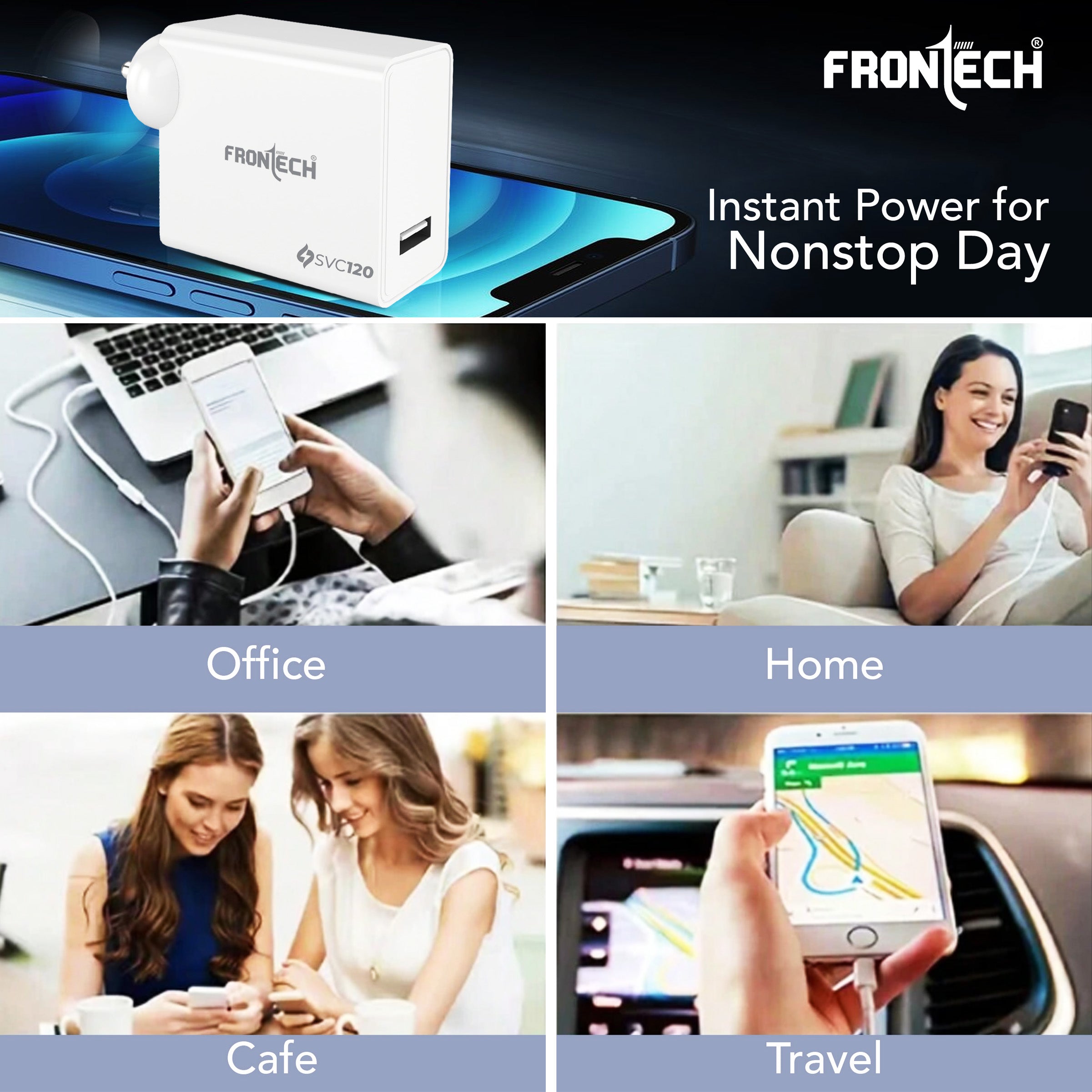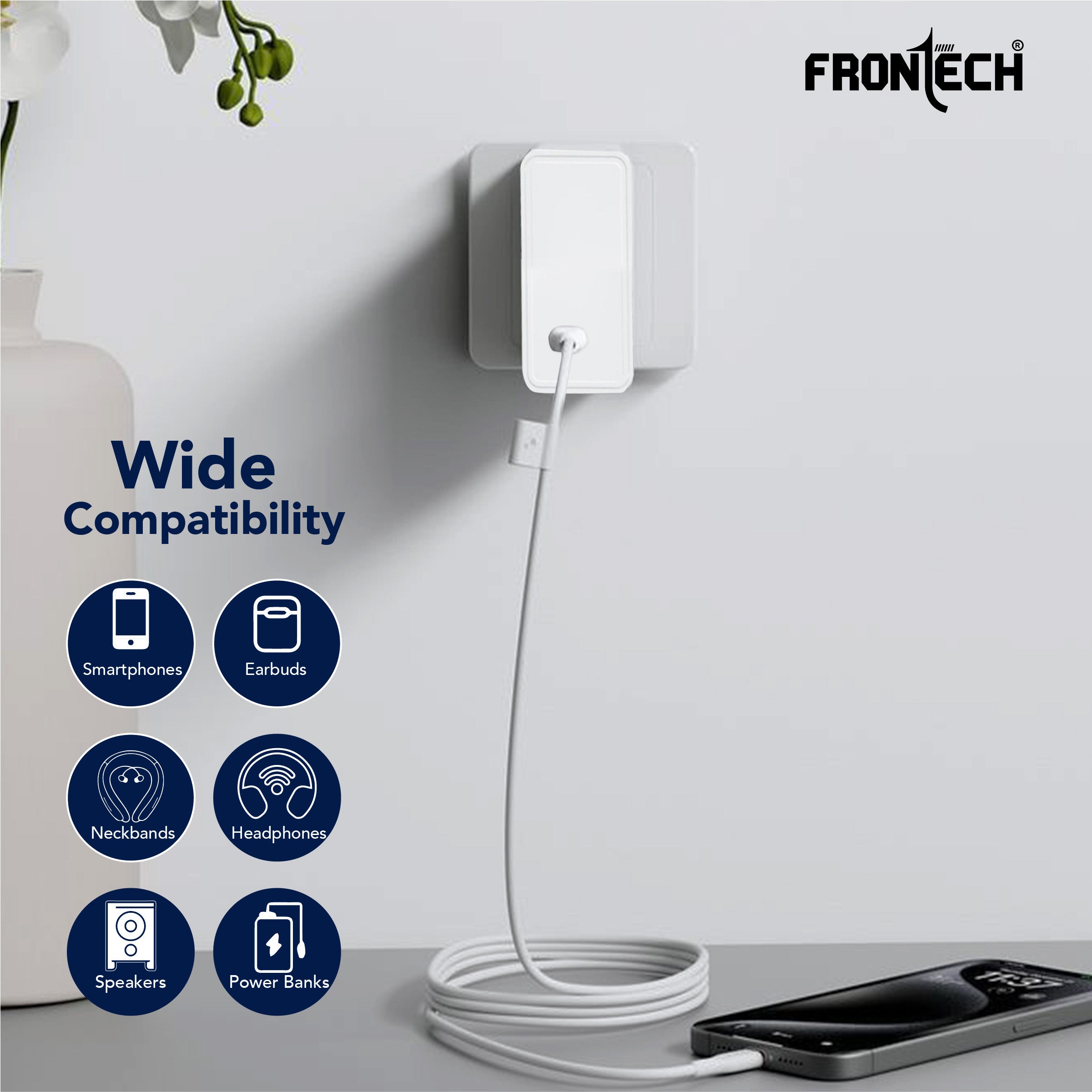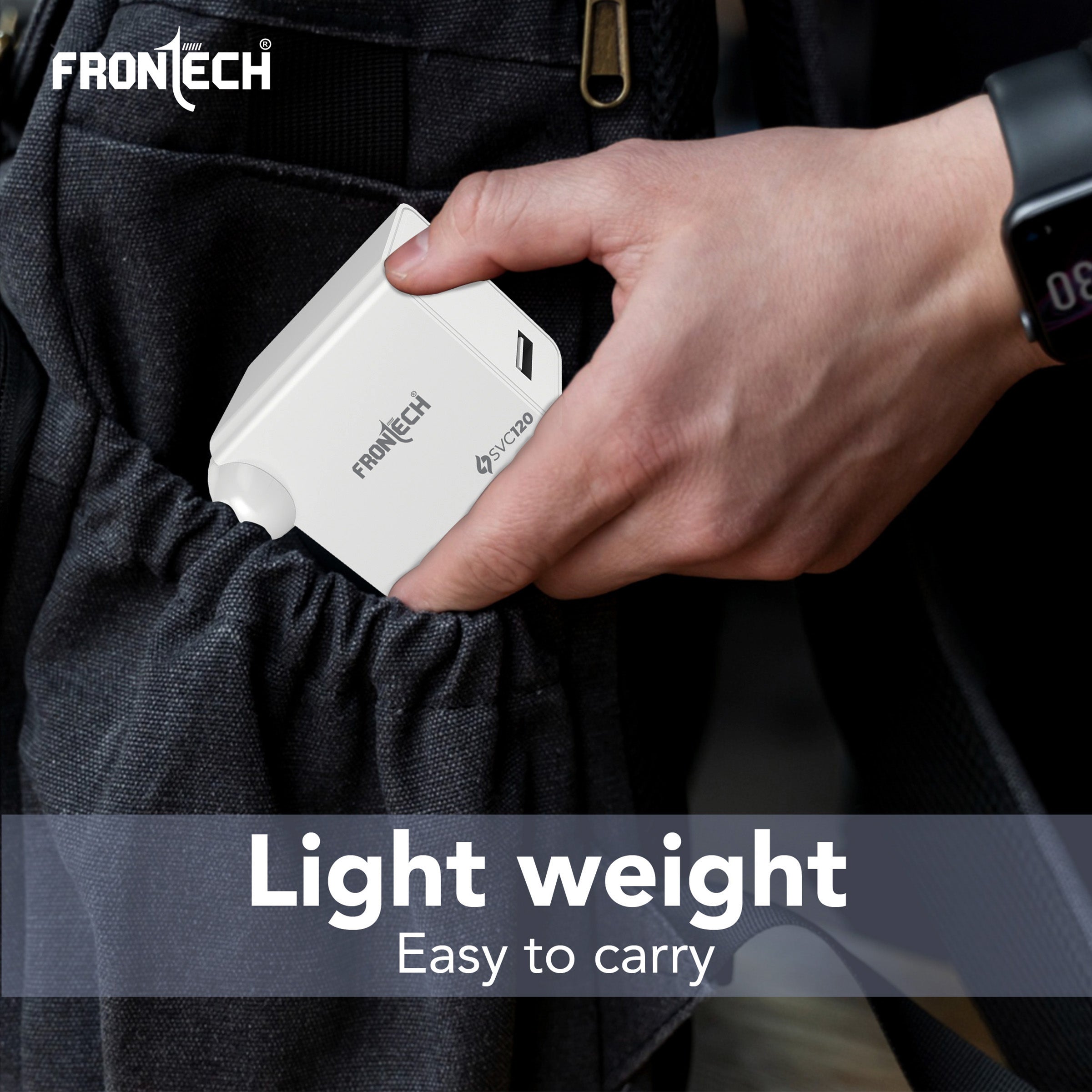 The FRONTECH SVC 120 (MCH-0024) is a powerful 120W single-port mobile charger with a USB-A to type C. It features an integrated smart chip and provides essential safety features like Short Circuit, Over Charging, and Over Heat Protection. This lightweight charger offers wide compatibility for smartphones, tablets, earbuds, and power banks. It operates on a universal 100–265V AC input and includes a 1.0-meter USB cable.
