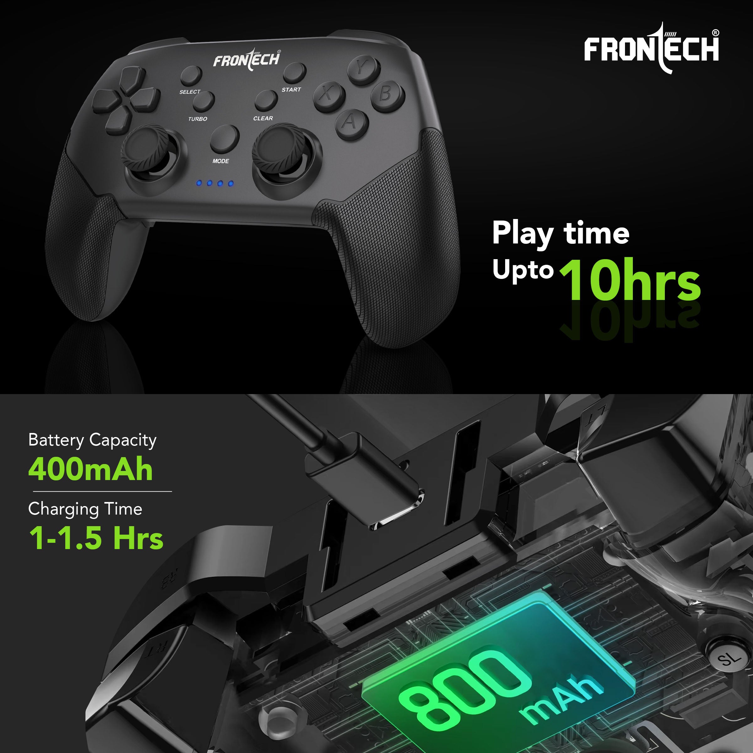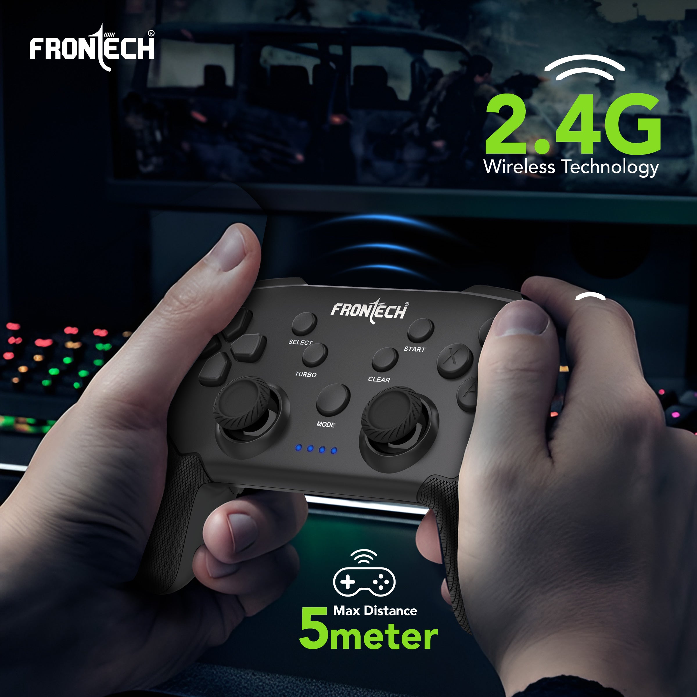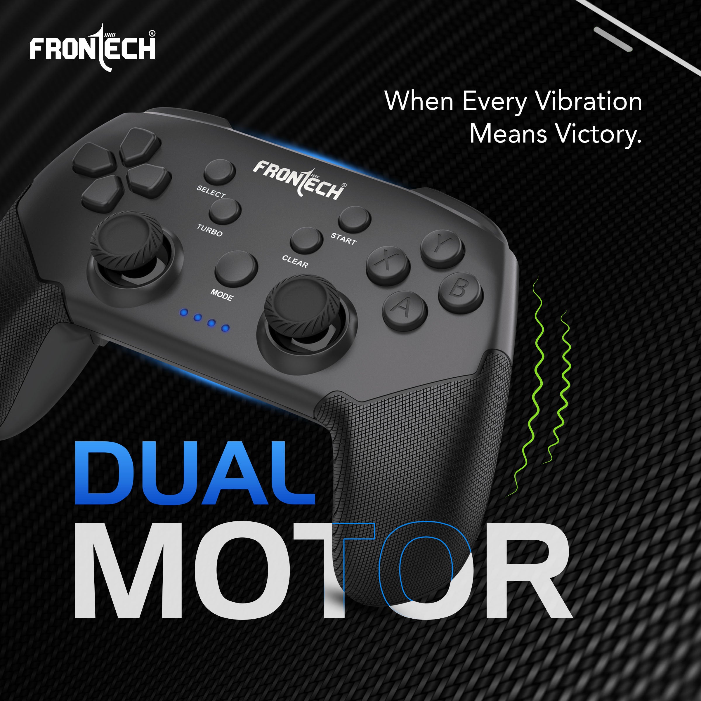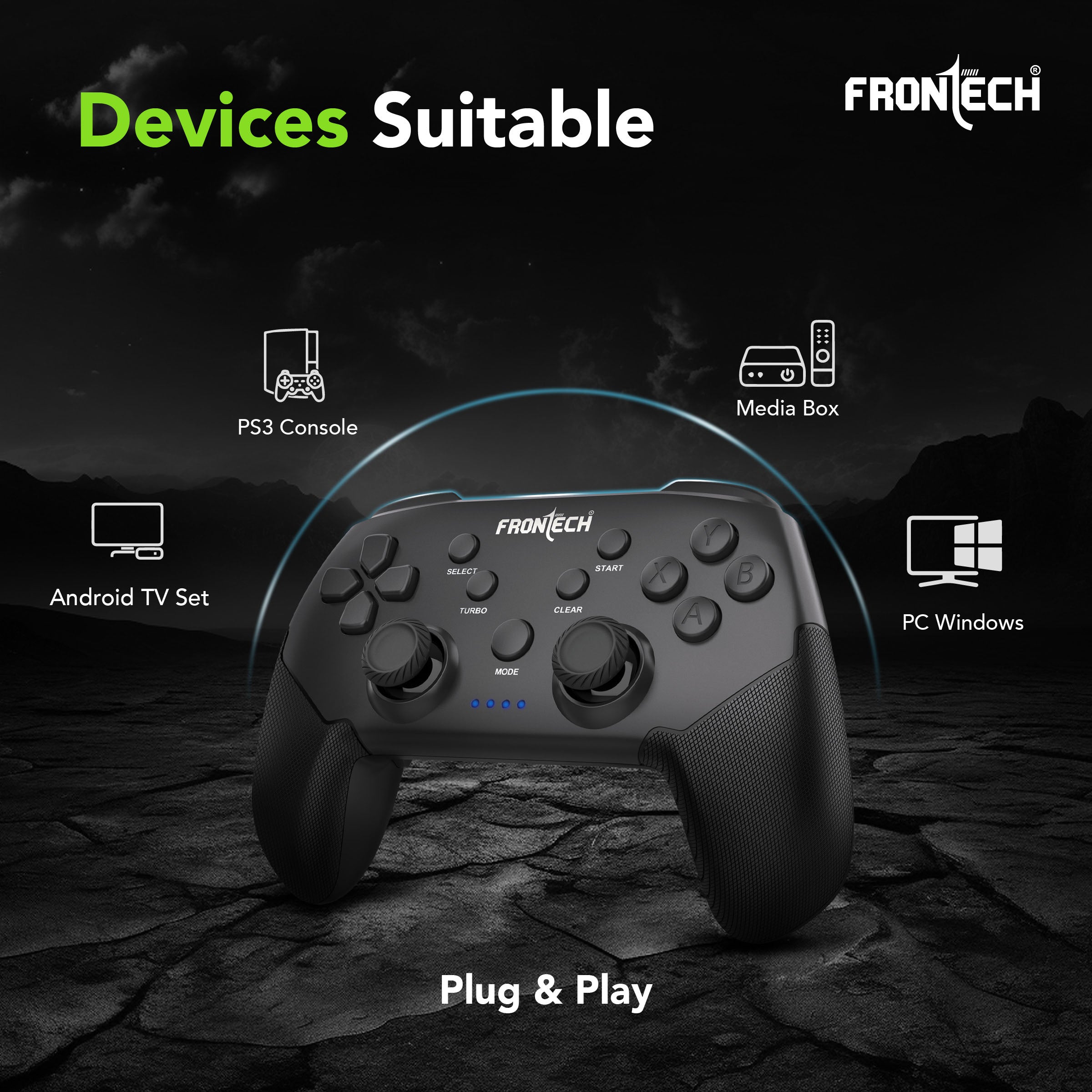 The FRONTECH Vortex Pro GP-0003 is a 2.4G wireless gaming pad featuring Dual Motor vibration for immersive feedback. It offers Plug & Play compatibility with a wide range of devices including PC (Windows 7/8/10/11), PS3 Console, Android TV, and Media Box. It is equipped with a 400mAh rechargeable battery providing up to 10 hours of playtime and includes programmable function buttons (MACRO) for customised gameplay.
