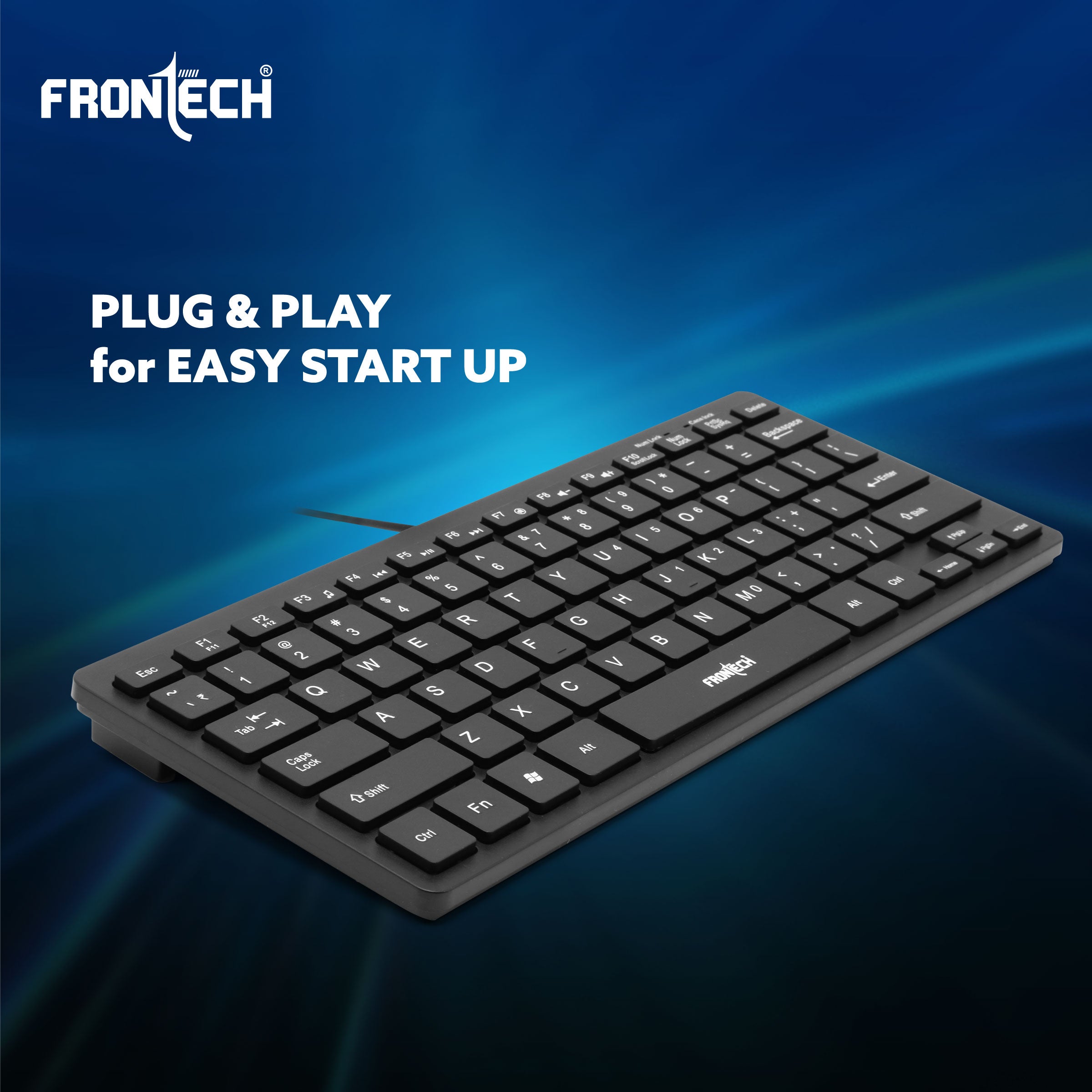 The Mini Keyboard is a compact and ultra-portable solution for users who prioritize space-saving designs. With dimensions measuring 285.5 x 120.5 x 25.1 mm, this mini keyboard is ideal for environments where space is at a premium. Featuring a membrane key switch with tactile feedback, this mini keyboard offers a comfortable and silent typing experience. The keys are designed with a drawing force of >= 0.8kgf, ensuring a satisfying tactile response, while the spring back of 50±20gf adds to the overall typing comfort. The keyboard boasts a standard layout with 78 keys, providing essential functionality in a condensed form. The ergonomic design enhances usability, making it comfortable for extended typing sessions. Setting up the keyboard is a breeze – simply plug it into a USB 1.1 port, and it's ready for immediate use. The Mini Keyboard is fully compatible with a range of Windows operating systems, including Windows Vista, 7, 8, and 10. This ensures seamless integration with your desktop or laptop, enhancing overall user convenience. This Keyboard not only excels in functionality but also boasts a sleek aesthetic in classic black. Its modern design adds a touch of sophistication to your workspace. Experience the perfect blend of functionality, portability, and aesthetics with the FRONTECH MINI KEYBOARD, delivering a typing solution tailored for those who value efficiency without compromising on performance.