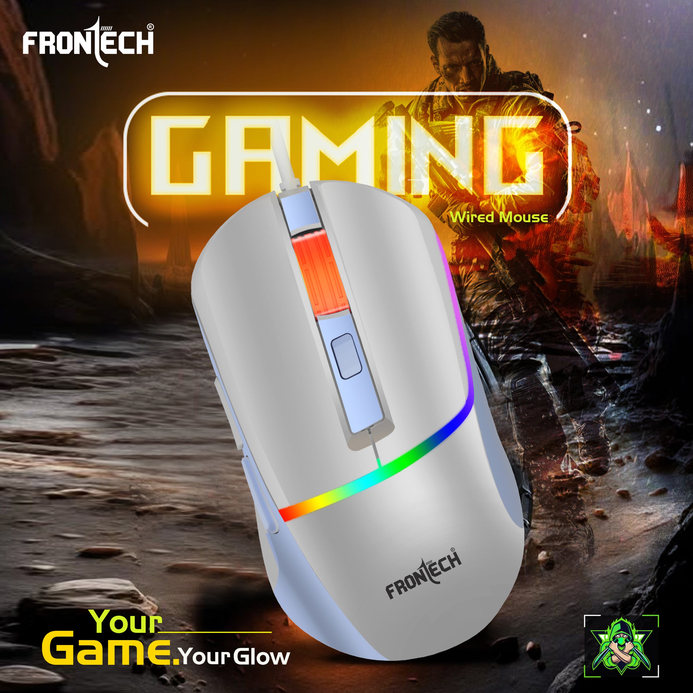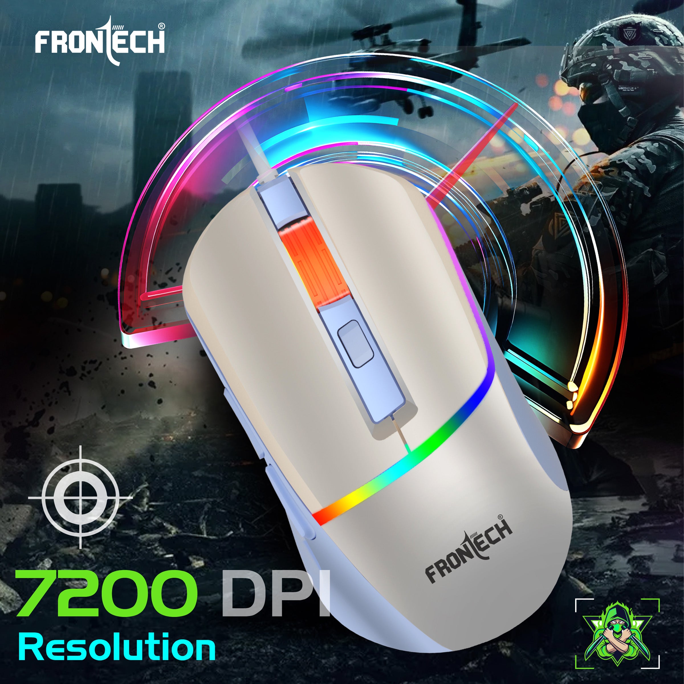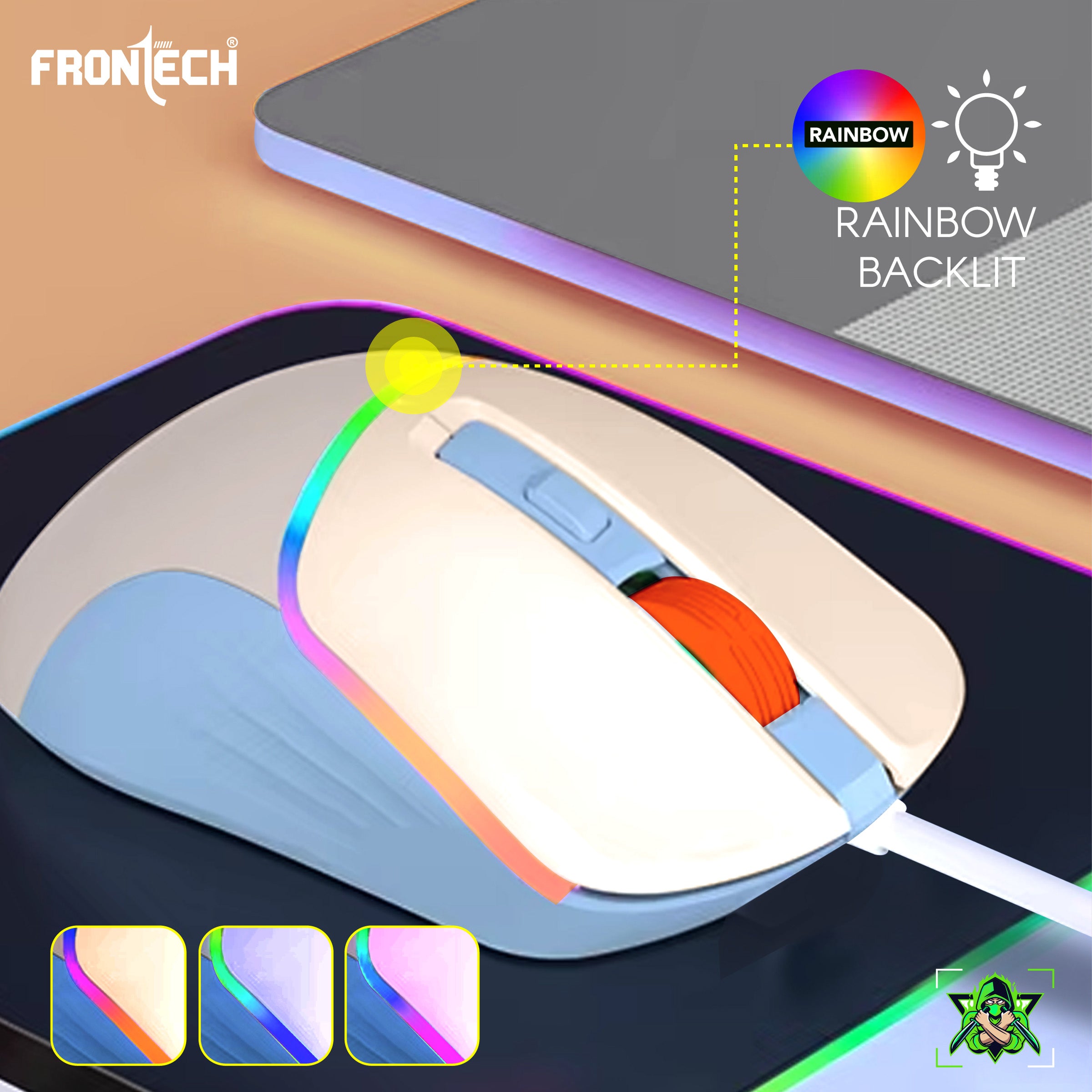 FRONTECH wired gaming mouse offers an immersive gaming experience with its ergonomic, non-slip design in white and blue, complemented by vibrant rainbow backlighting and an orange scroll wheel. It features six buttons for precise control, including a dedicated DPI adjustment, and boasts a high resolution of up to 7200 DPI. Designed for quiet operation with "Soft Click" and "Low Noise Design," it connects via a durable 1.5-meter braided USB cable, embodying the "Your Game. Your Glow.
