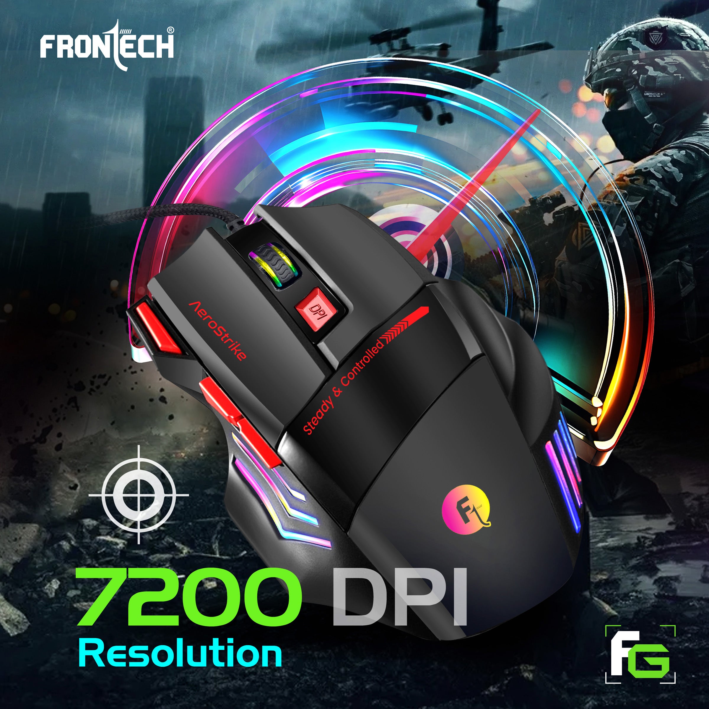 · Dominate the Competition: Unleash your gaming potential with the Frontech AeroStrike Wired Gaming Mouse, engineered for precision and power. · Unrivaled Accuracy: Experience pixel-perfect targeting with up to 7200 DPI resolution, giving you the edge in every battle. · Rapid Fire Advantage: Equipped with a dedicated "Fire Button" for quick, continuous clicks, eliminating the need for multiple presses and boosting your in-game performance. · Ergonomic Comfort: Designed for extended gaming sessions, the AeroStrike features an ergonomic, non-slip design and a dedicated thumb rest paddle for ultimate comfort and control. · Smooth & Silent: Enjoy a super-responsive and quiet gaming experience with soft-click buttons. · Customizable Aesthetics: Immerse yourself in the game with dynamic LED RGB Rainbow lighting, offering a spectrum of vibrant colors. · Built to Last: A durable 1.5-meter braided USB cable ensures reliability and longevity, standing up to intense gaming. · Multi-Button Functionality: Strategically placed Left Click, Right Click, Scroll, DPI, Forward, Backward, and Special Fire Buttons for comprehensive control at your fingertips. · Steady & Controlled: Engineered for stable and precise movements, ensuring every action is executed flawlessly.