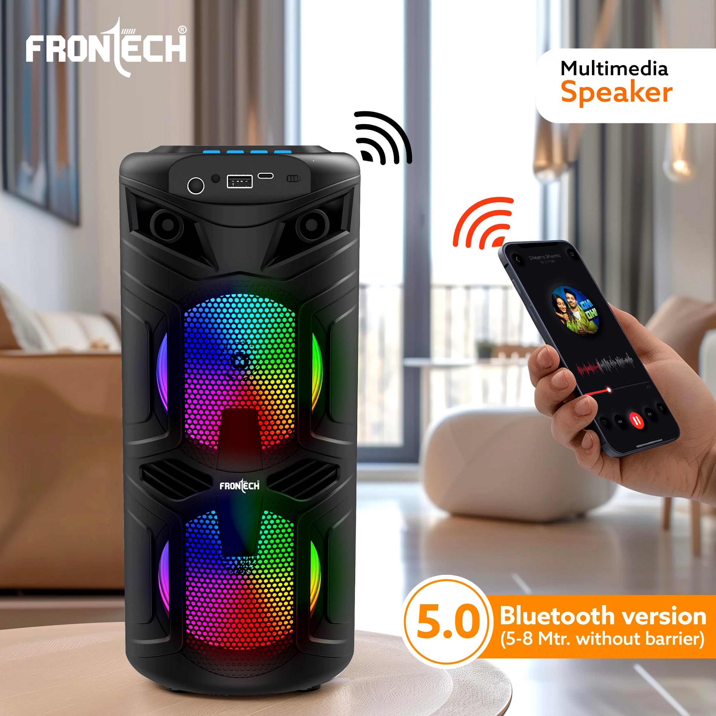 Frontech speakers packed a powerful punch, delivering rich, full-bodied sound that will fill any room with music. Equipped with bluetooth 5.0 for minimal latency and better travel. With USB and TF card, FM and Aux compatibility, you can easily play music from your laptop, PC, mobile device or car - making it the perfect choice for any tech-savvy audiophile with MIC interface. So whether you're hosting a party or just relaxing at home, the Frontech Bluetooth Speaker has a big 1200 mAh battery with 2 hours of usage. They make perfect speakers for home theater. Built-in big battery that is suitable for indoors and outdoors with 100Hz to 20KHz. This speaker also features a digital clock and hands free option, making it the perfect choice for busy multitaskers who want to stay connected while enjoying their favorite tunes.