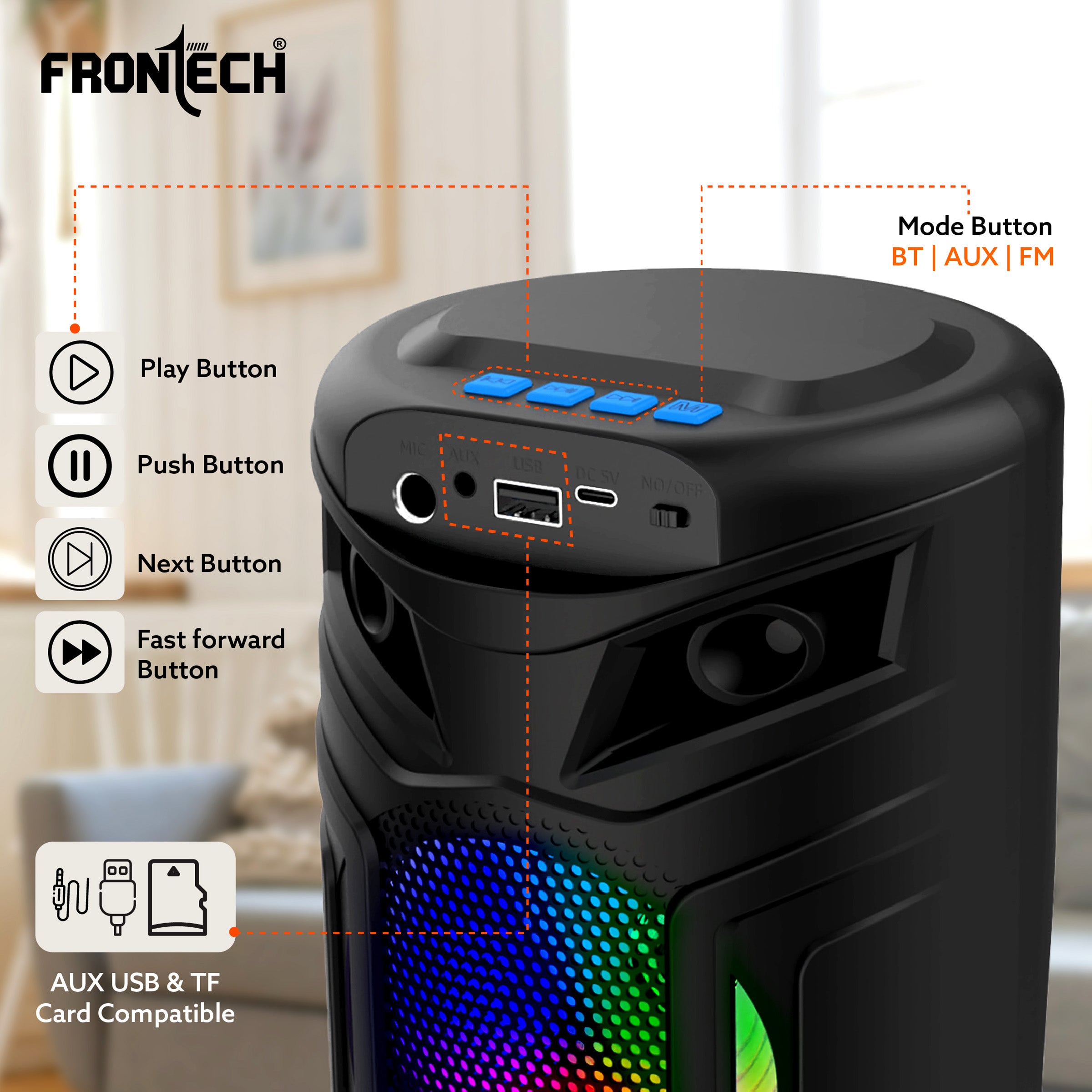 USB, TF card, FM, and Aux compatibility.