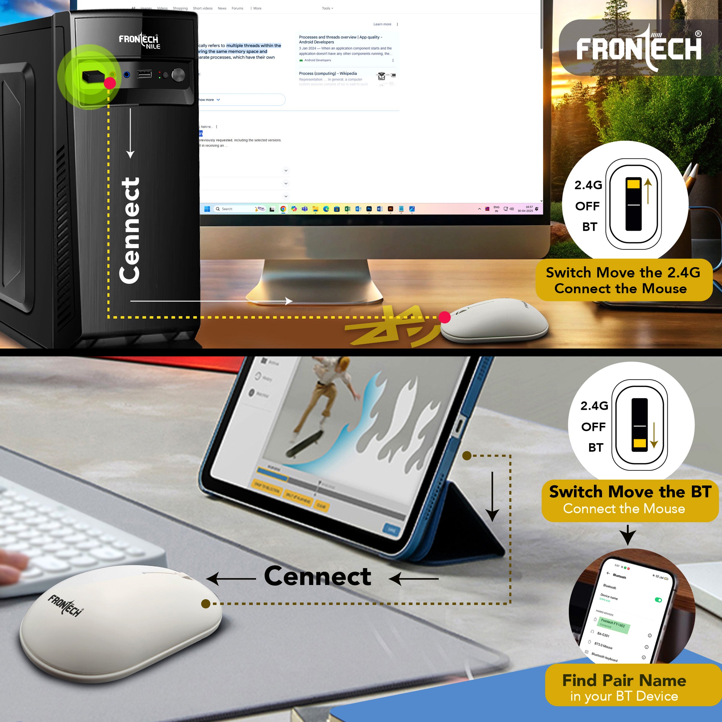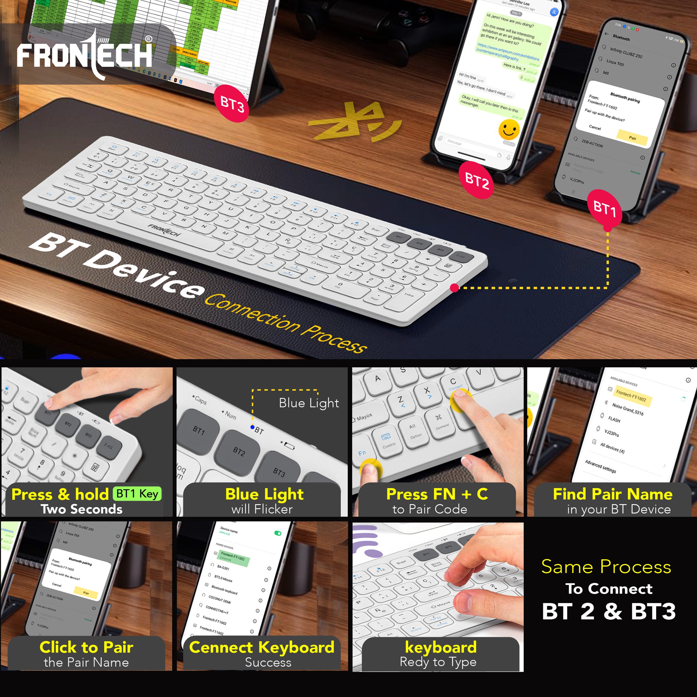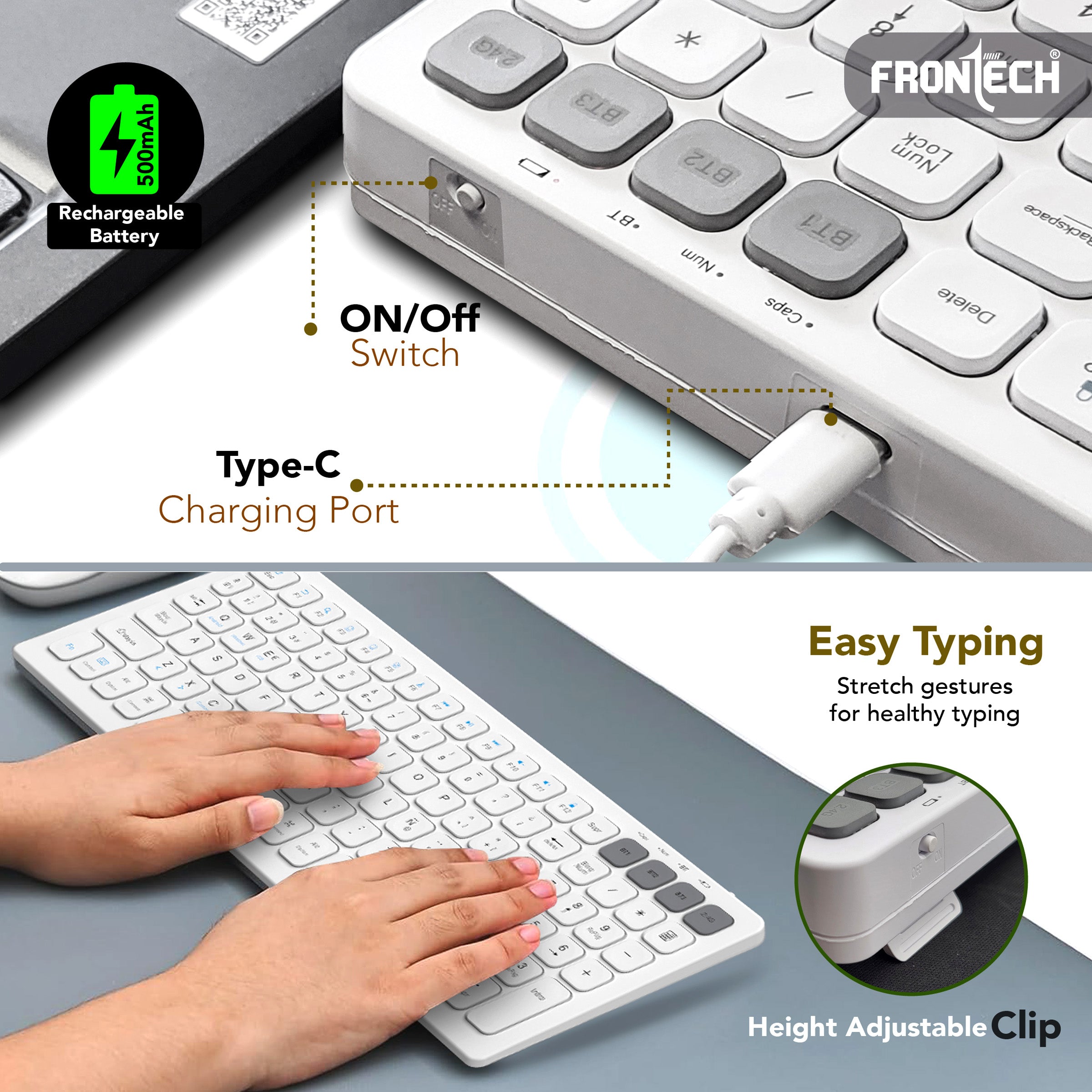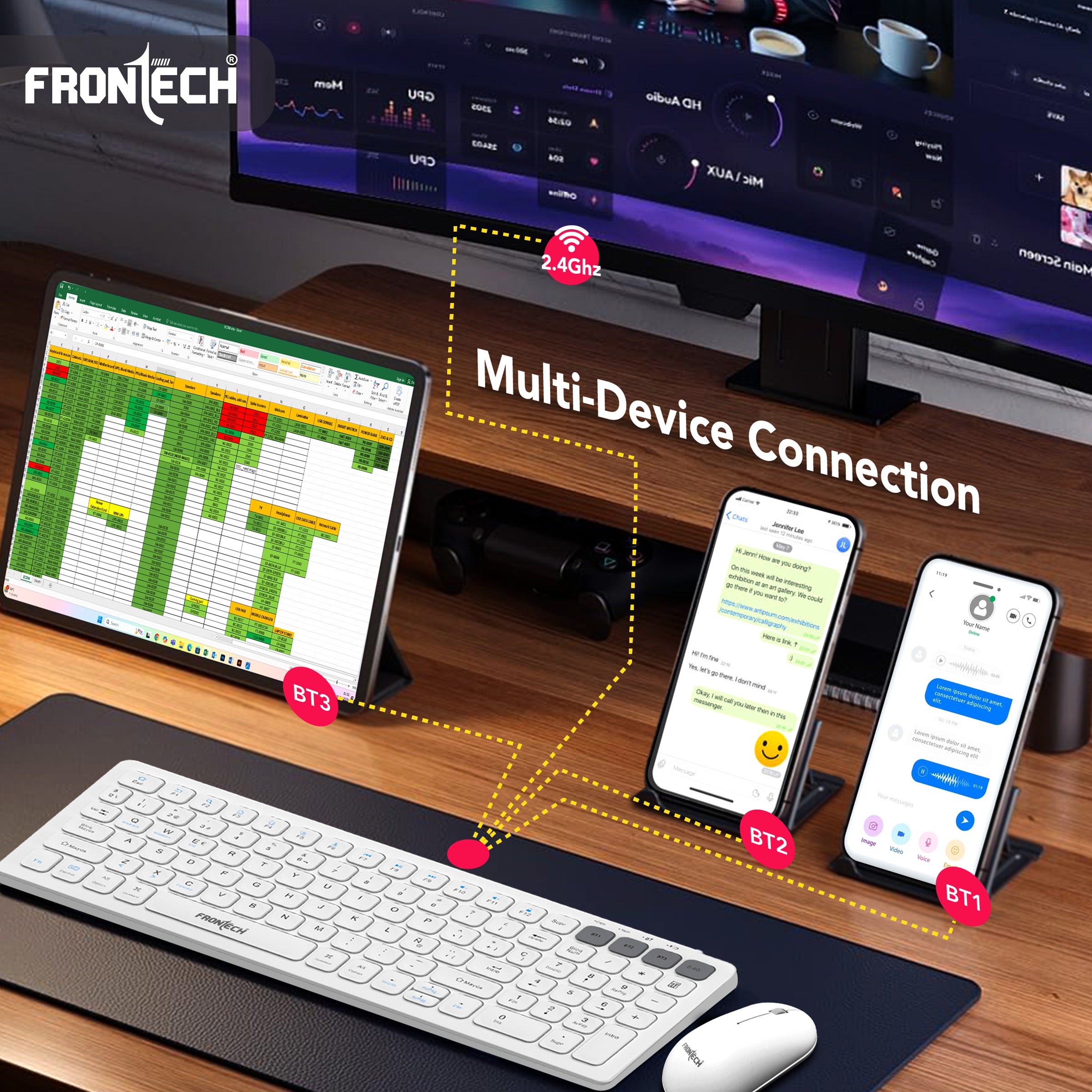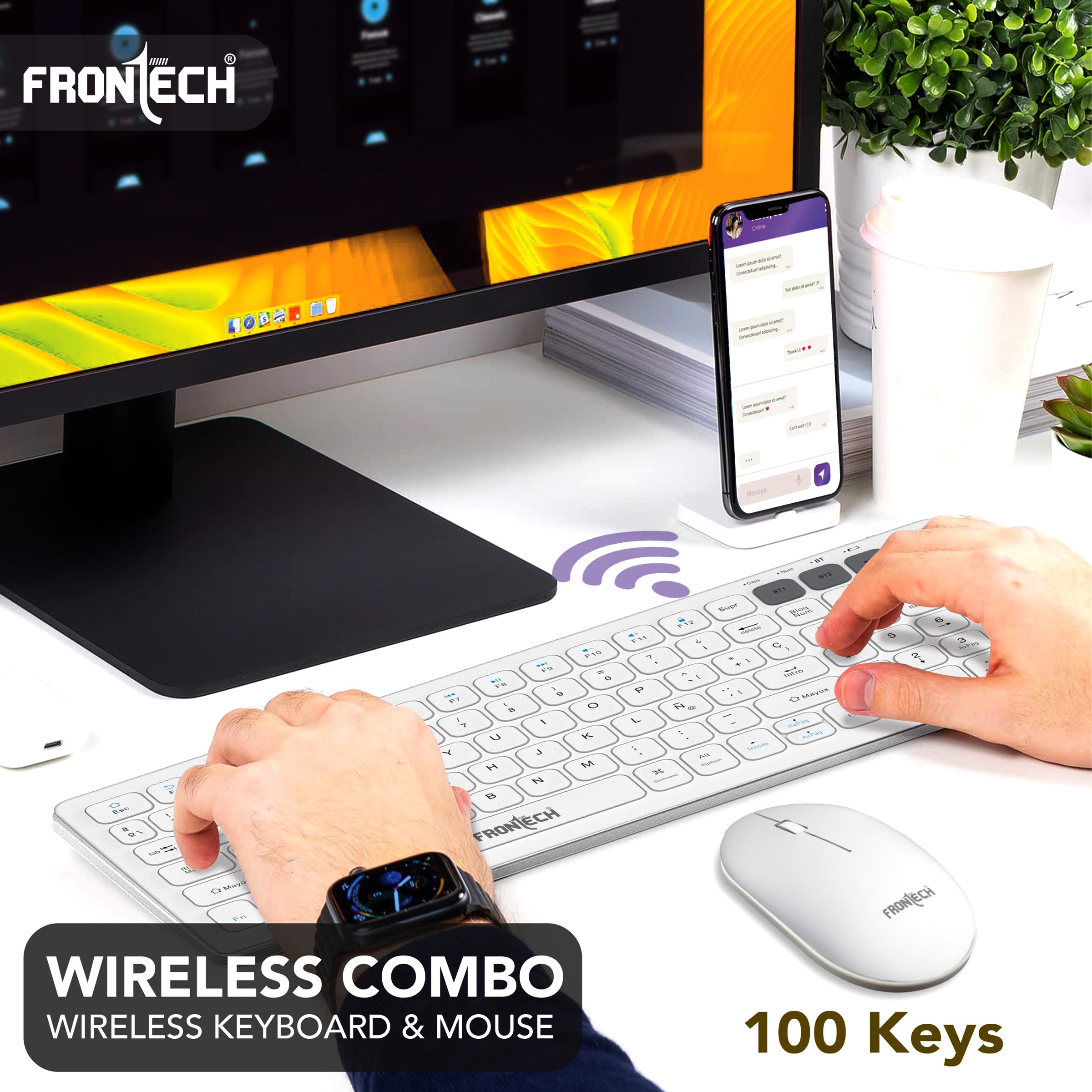 Experience seamless productivity with the Frontech FT-1602A Wireless Keyboard & Mouse Combo. Featuring dual-mode connectivity via 2.4GHz and Bluetooth, this stylish combo offers flexibility and convenience across multiple devices. The compact 100-key keyboard is designed for efficiency, while the precision mouse with 1000 DPI ensures smooth and accurate control. Both devices come with built-in rechargeable 500mAh batteries, reducing the hassle of constant replacements. Whether you're working, studying, or browsing, this combo brings comfort, style, and performance to your fingertips.
