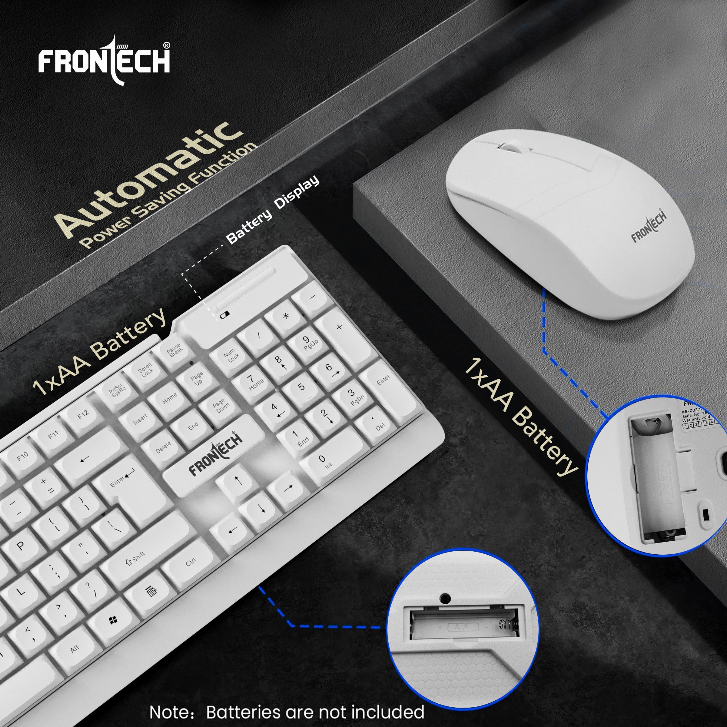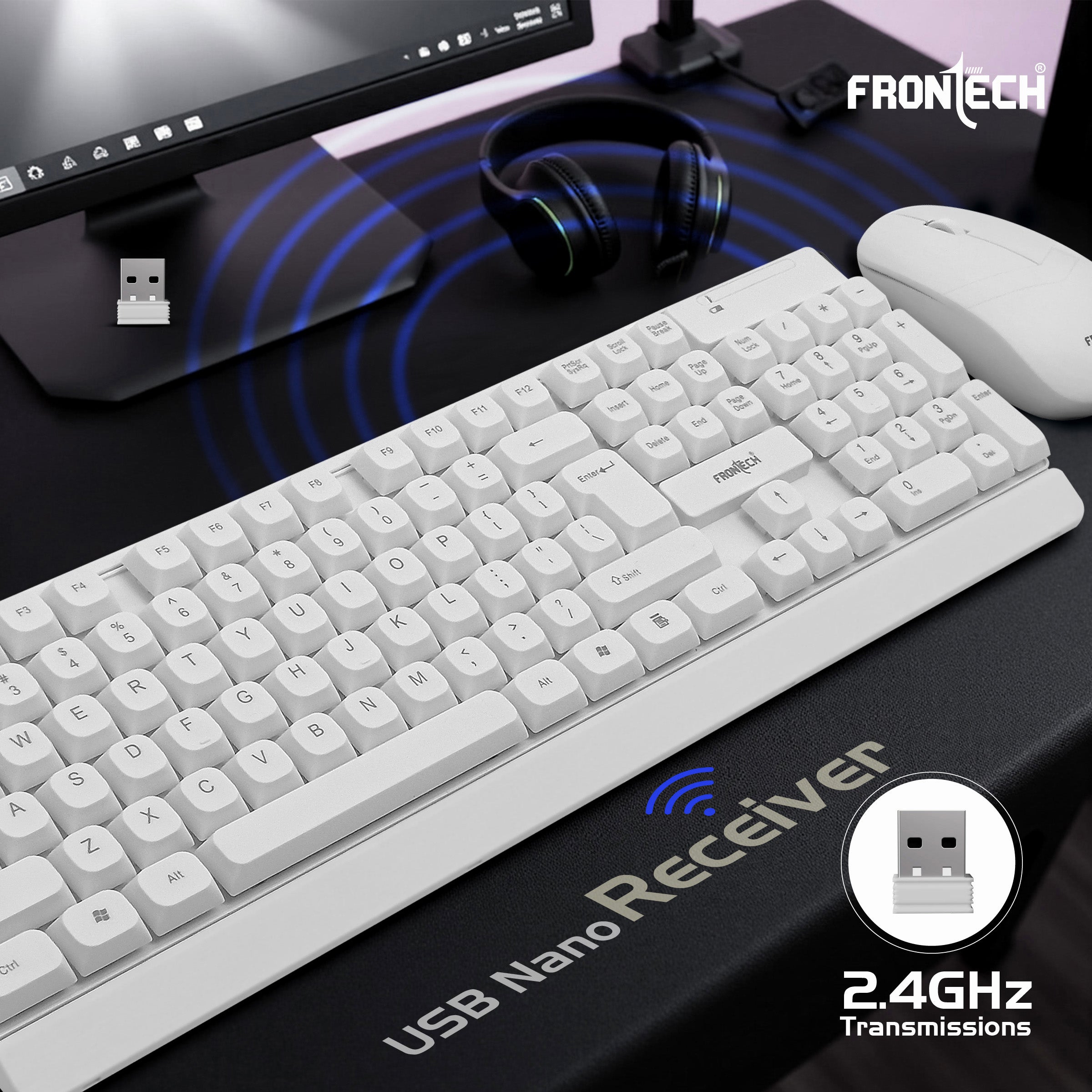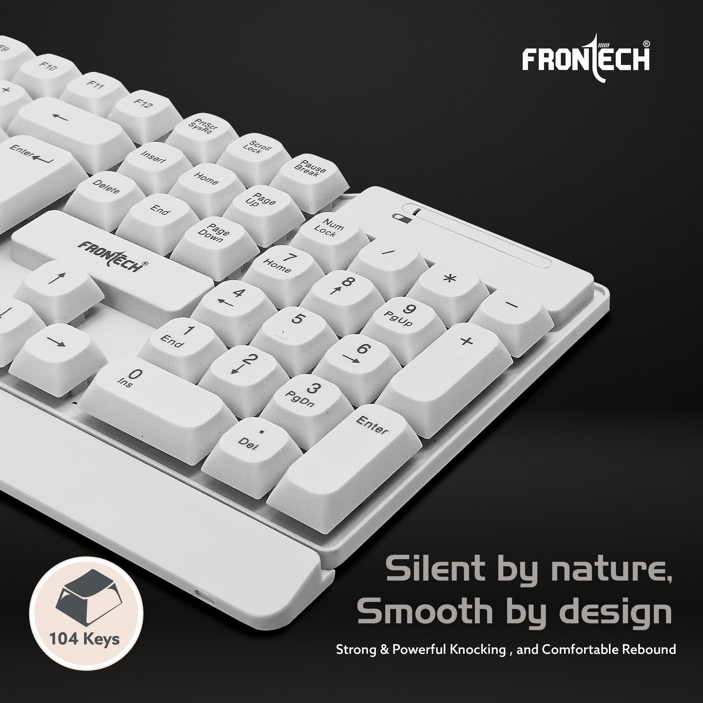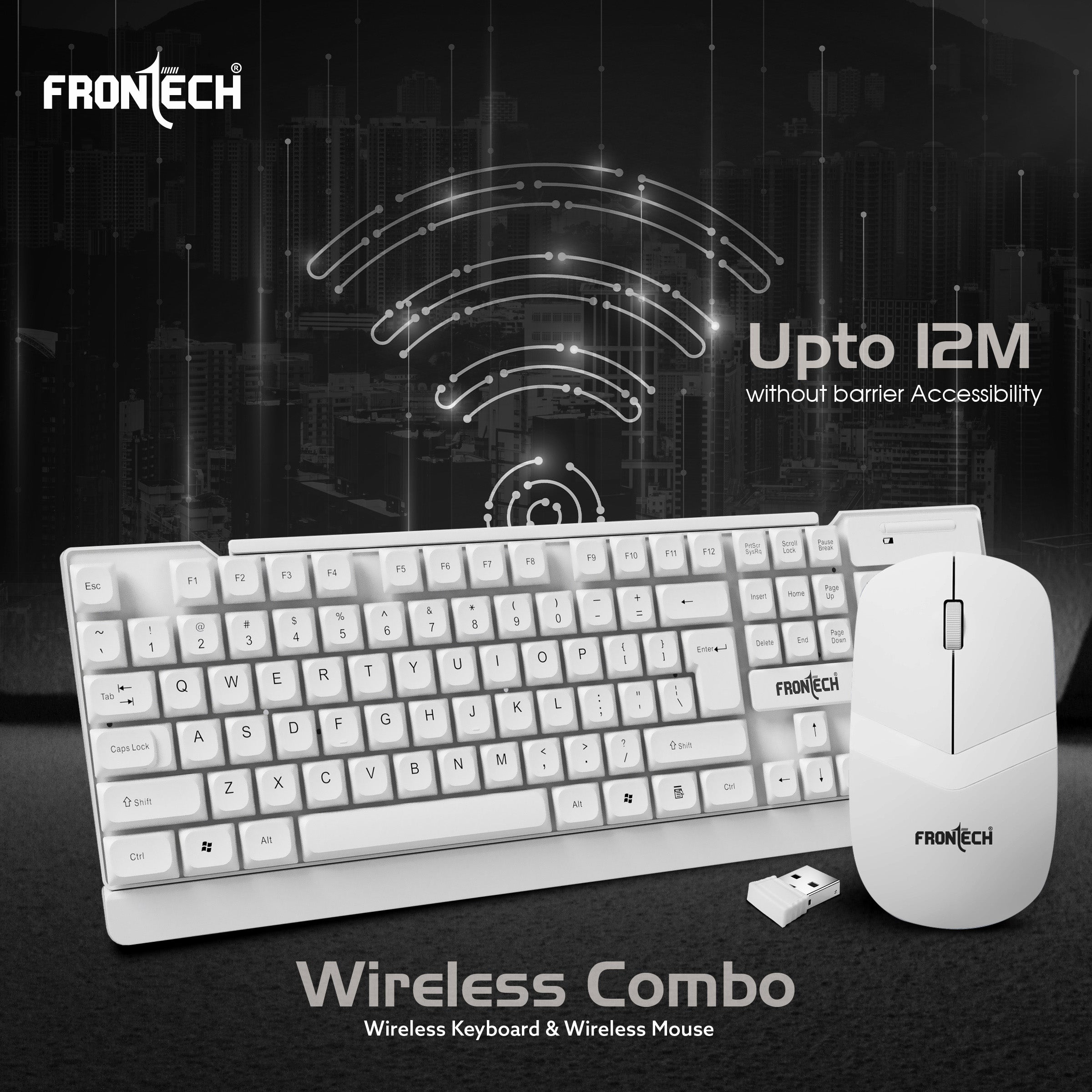 The Frontech KB-0027PW Wireless Keyboard & Mouse Combo offers 2.4GHz connectivity, a silent 104-key ergonomic keyboard with power-saving features, and a 1600 DPI optical mouse, delivering a wireless, clutter-free setup for home or office.