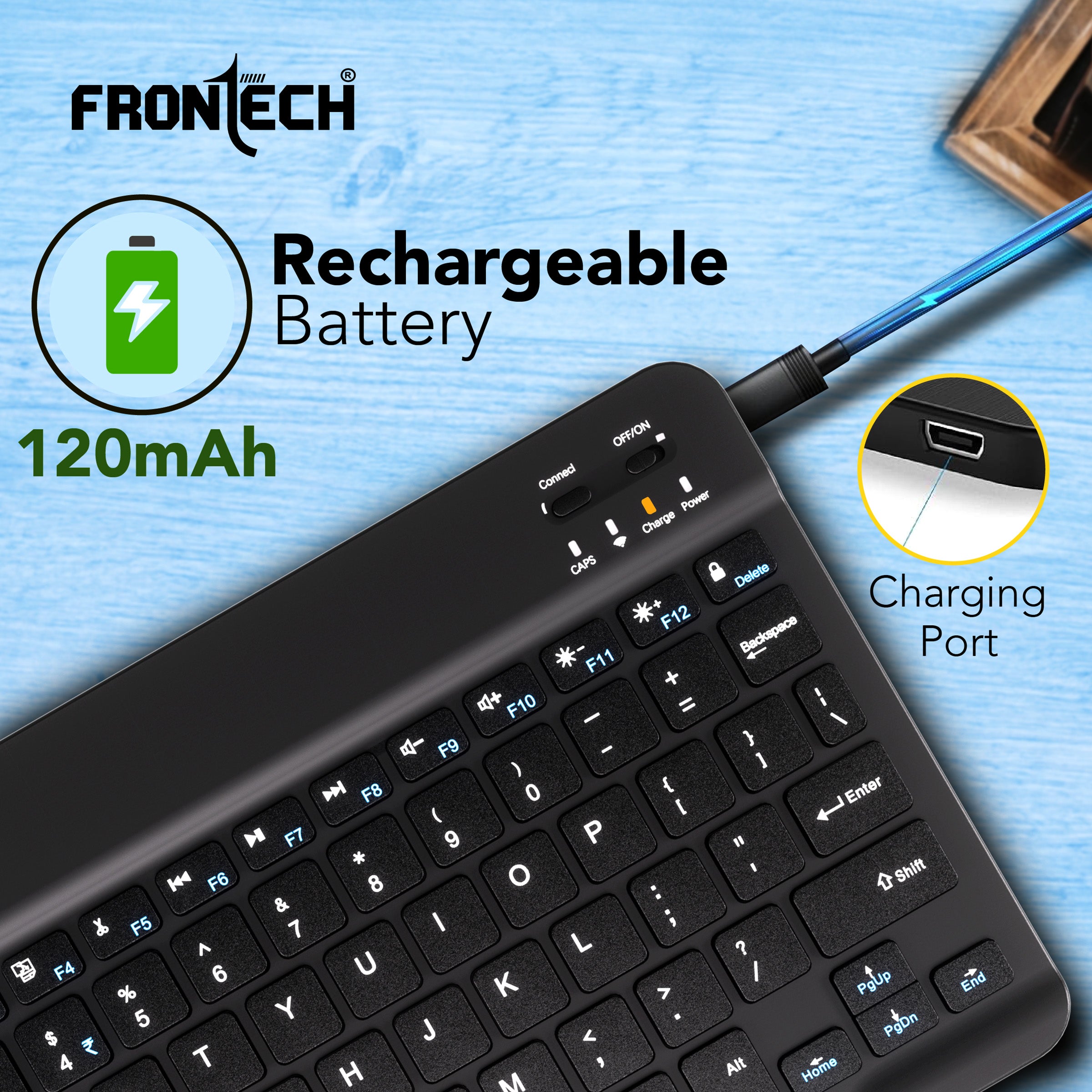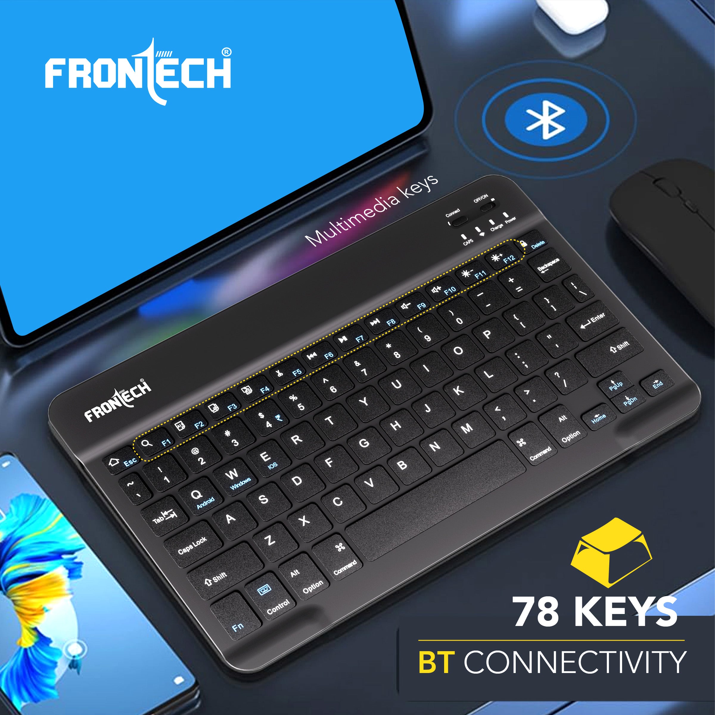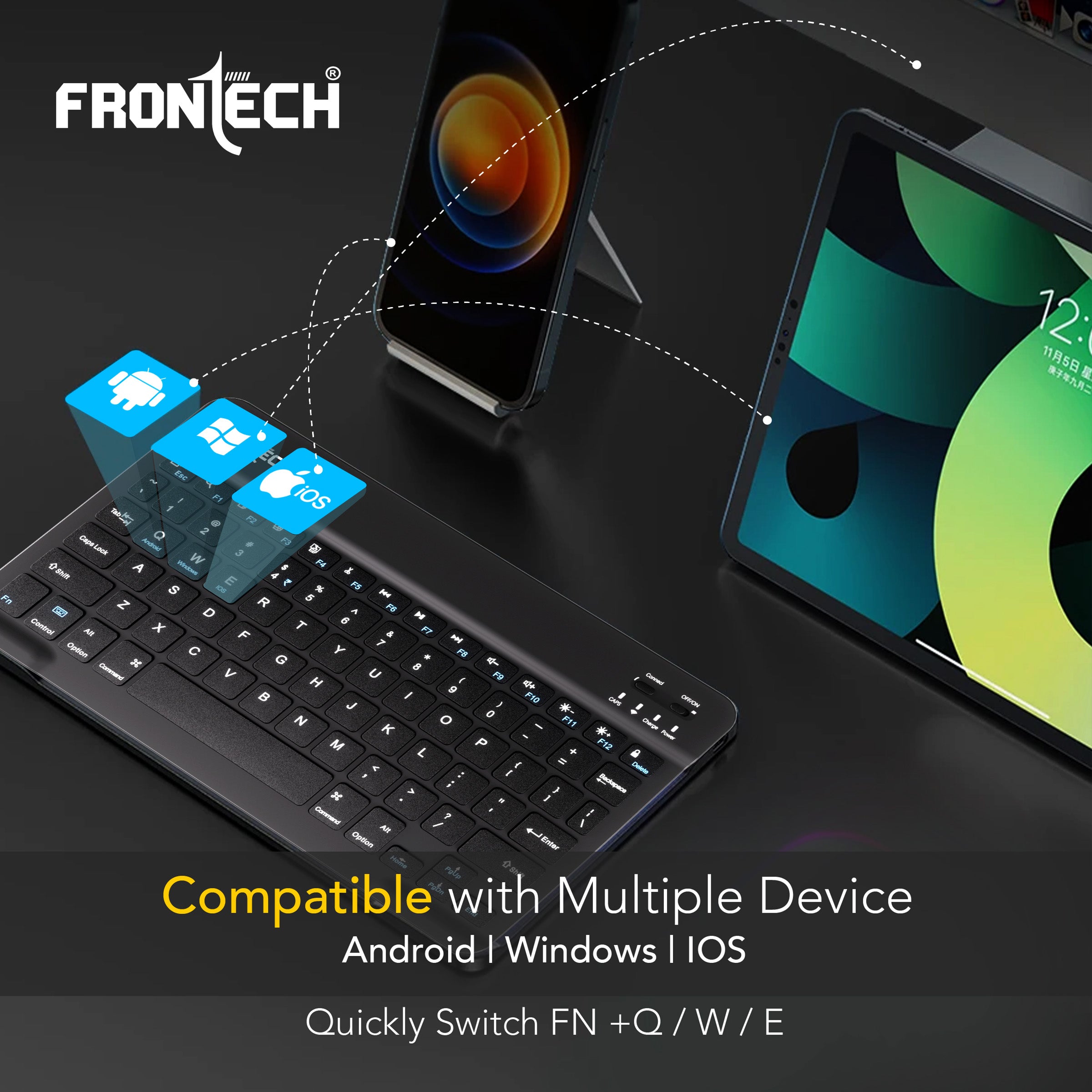 The Frontech FT-1603A is an ultra-slim and compact wireless mini Bluetooth keyboard, featuring 78 standard keys for a complete typing experience. It boasts a 120mAh rechargeable battery for convenient use and is universally compatible with Windows, Mac, Android, and iOS operating systems. Weighing only 186g and with dimensions of 247×150×8 mm (WxDxH), this black keyboard is highly portable and space-saving. Manufactured and marketed by Frontech Private Limited, it comes with a 1-year limited warranty
